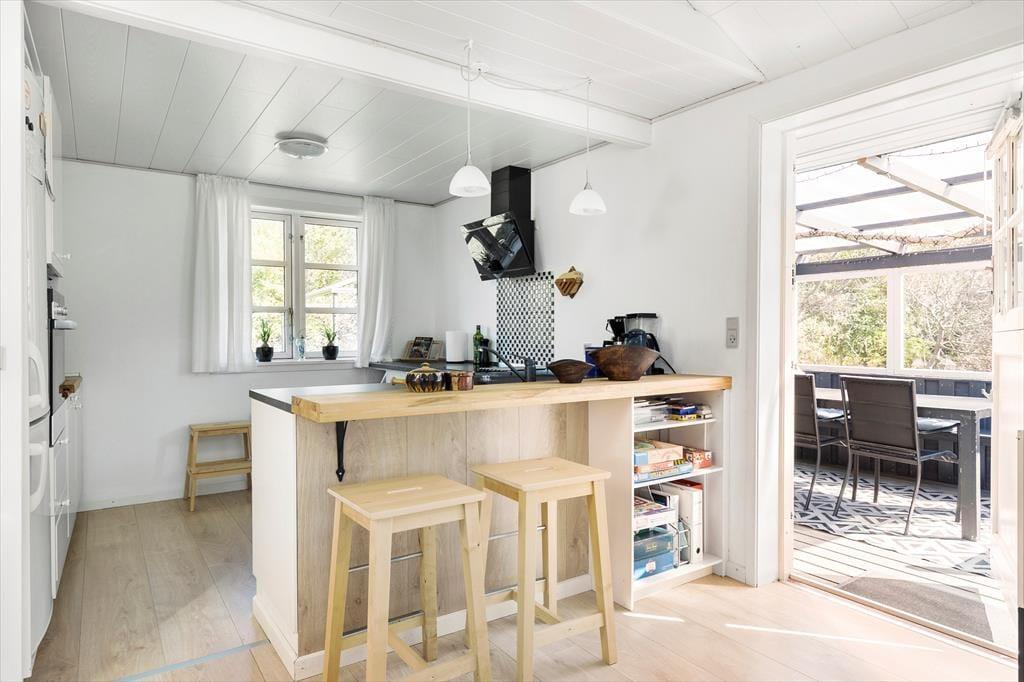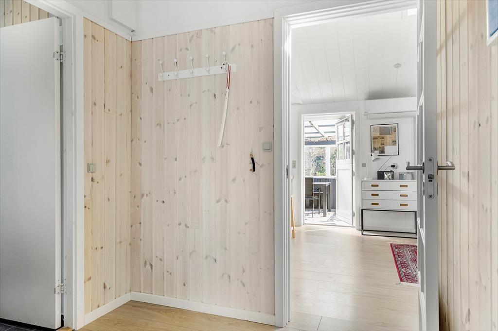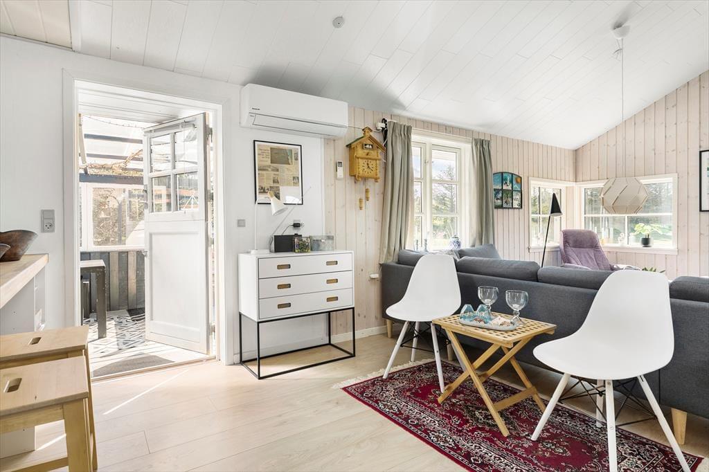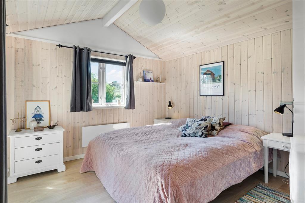 Flot indrettet sommerhus med en god fordeling af husets soverum. Via terrassen træder man ind i husets entre, som er en gang, der kombinerer husets største soverum med resten af huset. Det veludstyrede køkken og den hyggelige stue er kombineret. Der er god spiseplads, et skønt sofahjørne og fra alle husets vinduer kan den skønne udsigt over grunden nydes. Der er i alt tre soverum, tre rum med dobbeltsenge og en hems med et par madrasser. Der er to badeværelser med bruser og det ene har vaskemaskine.