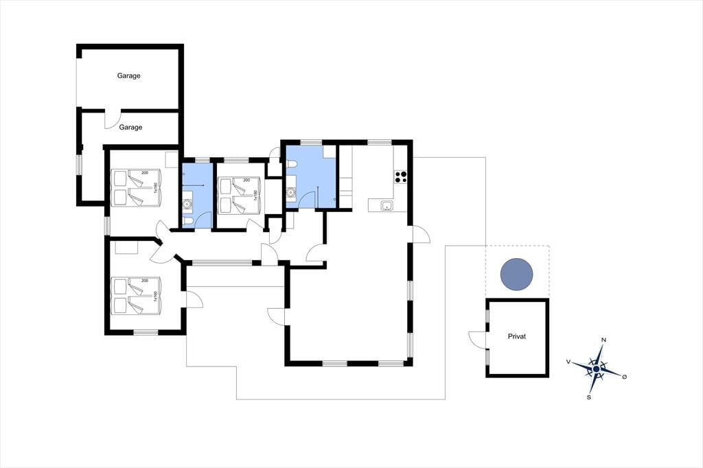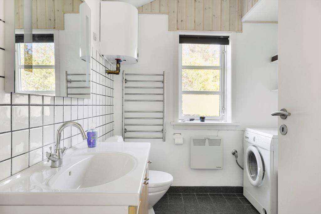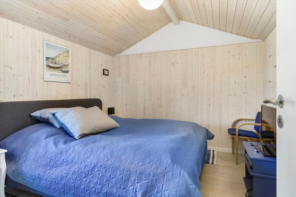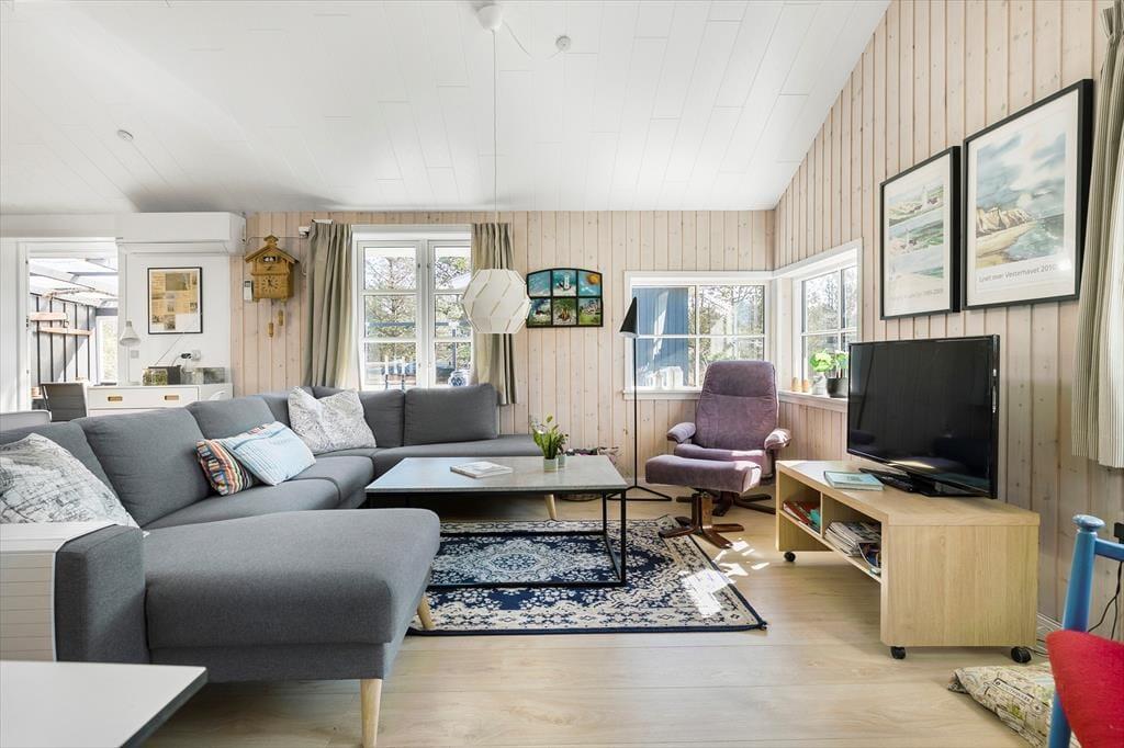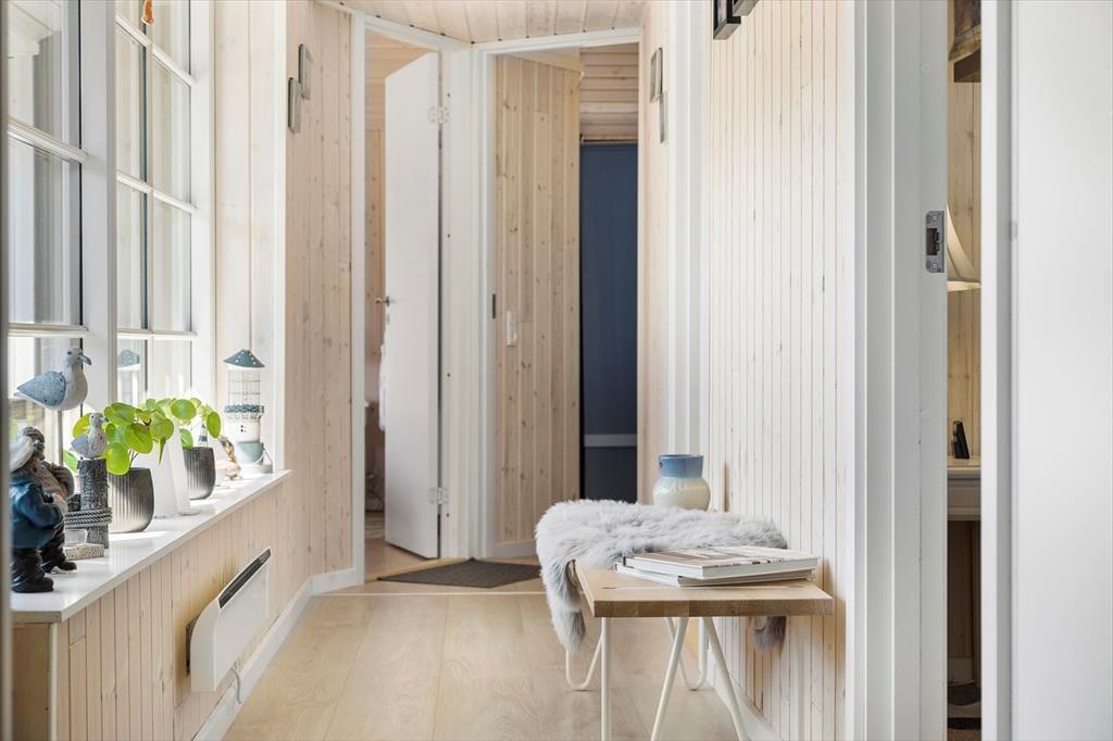 Flot indrettet sommerhus med en god fordeling af husets soverum. Via terrassen træder man ind i husets entre, som er en gang, der kombinerer husets største soverum med resten af huset. Det veludstyrede køkken og den hyggelige stue er kombineret. Der er god spiseplads, et skønt sofahjørne og fra alle husets vinduer kan den skønne udsigt over grunden nydes. Der er i alt tre soverum, tre rum med dobbeltsenge og en hems med et par madrasser. Der er to badeværelser med bruser og det ene har vaskemaskine.