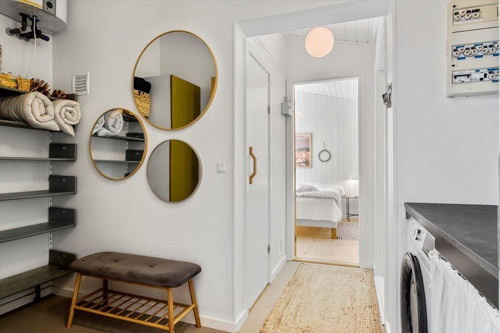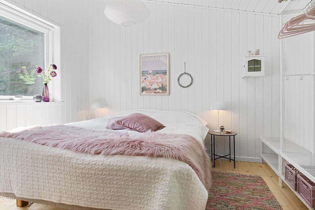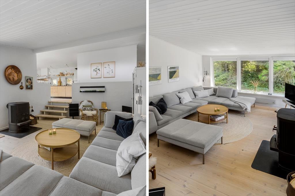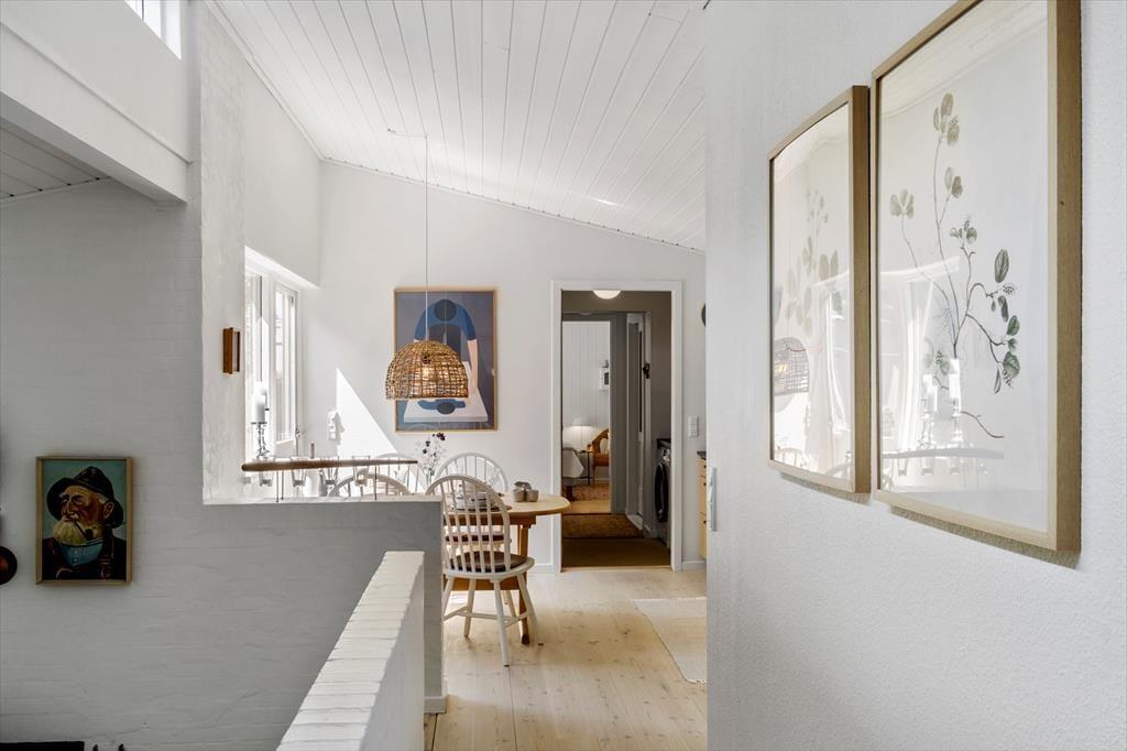 Huset er omsorgsfuldt renoveret i 2019, og inden døre er der fundet en rigtig god balance mellem originale detaljer og moderne opdateringer. Resultatet er et gennemført indbydende sommerhus med lyse og stemningsfulde rum, man har lyst til at opholde sig i. Et af husets charmetræk er, at det er opført i flere niveauer, så fra husets spisekøkken er der åben forbindelse med trappe ned til en dejlig stue, der har brændeovn og udsigt til den grønne have. Der er for øvrigt også trappe ned til et af husets tre soveværelser, som alle er indrettet med komfortable dobbeltsenge. Endelig byder planløsningen på et badeværelse og et bryggers med vaskemaskine.