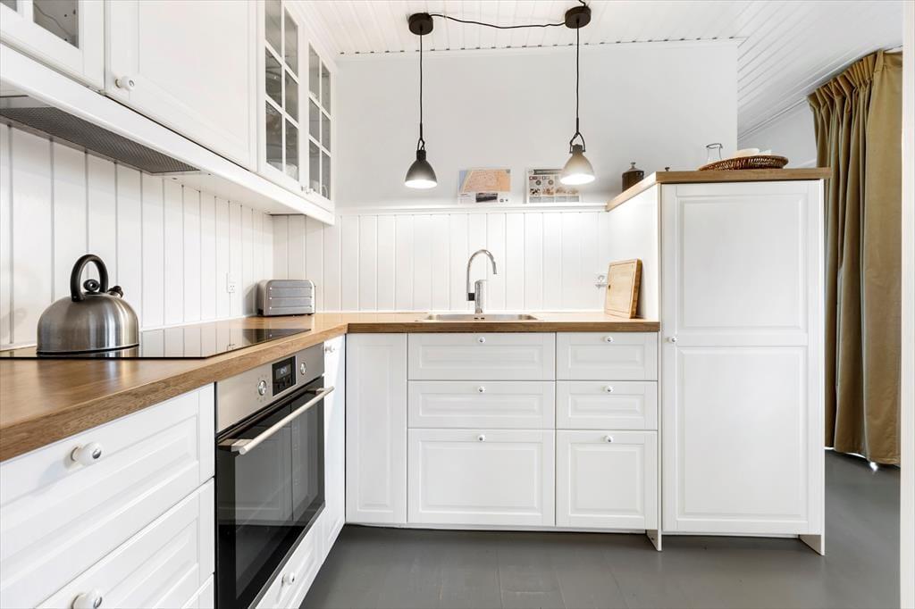 Sommerhuset har ligget her på adressen siden 1976 og blev i 2016 grundigt renoveret. Moderniseringen er sket på nænsom vis, og der er nøje udvalgt interiør, der passer til husets klassiske sommerhusstil. Overalt er atmosfæren lys og rar, og der er utroligt mange flotte og stemningsskabende detaljer – inklusiv høje paneler, indbygningspejs og et lækkert køkken med en hyggelig spiseplads. Køkkenet ligger i åben forbindelse med en dejlig stue, og derudover består planløsningen af tre gode værelser og et pænt badeværelse. Alt i alt er det et hus, hvor I hurtigt kan føle jer hjemme og nyde ferielivet i stor stil.