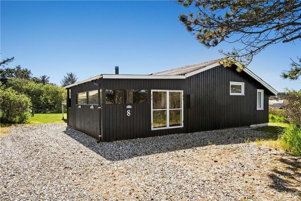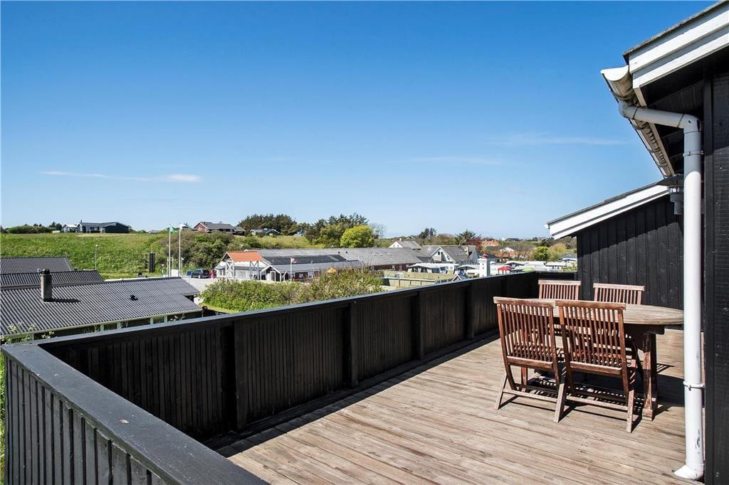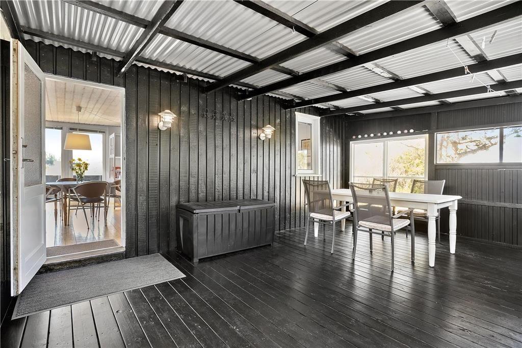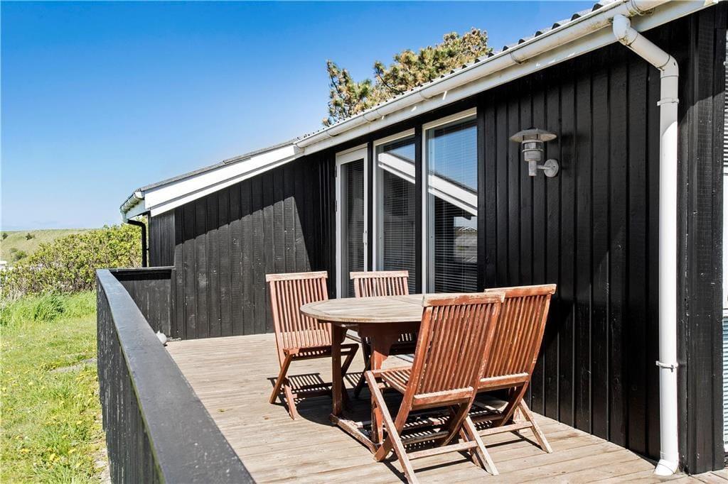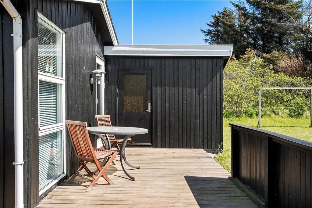 Fra køkkenet er der direkte adgang til en overdækket og afskærmet terrasse, der nærmest fungerer som en udestue. Det er et dejligt opholdssted, hvis det er lidt for køligt til at sidde helt ude i det fri – men skinner sommersolen, er det selvfølgelig oplagt at rykke driverlivet helt ud på den sydvestvendte terrasse. Har I børn med på ferie, kan de boltre sig på grundens lille græsplæne, inden I sammen tager ud for at udforske Lønstrup og omegn.