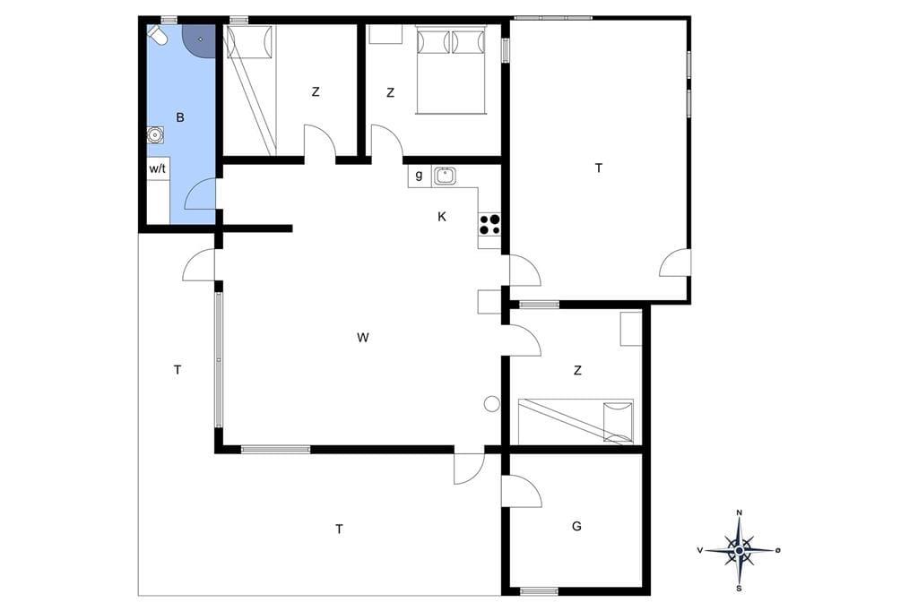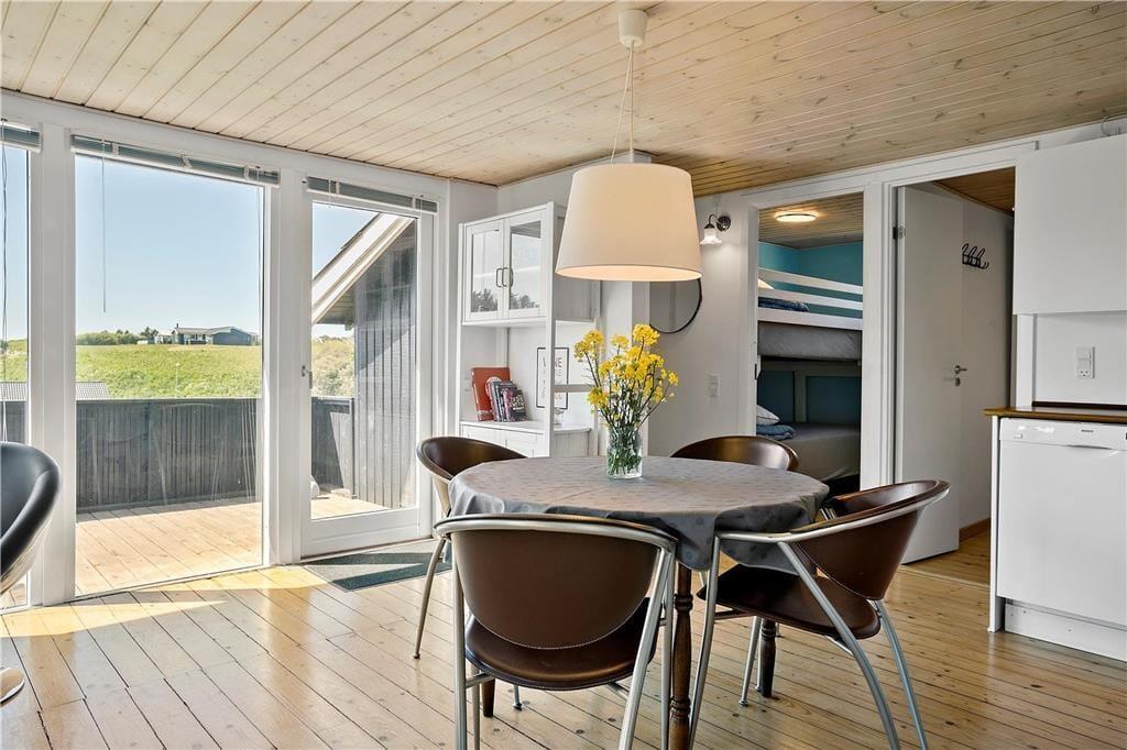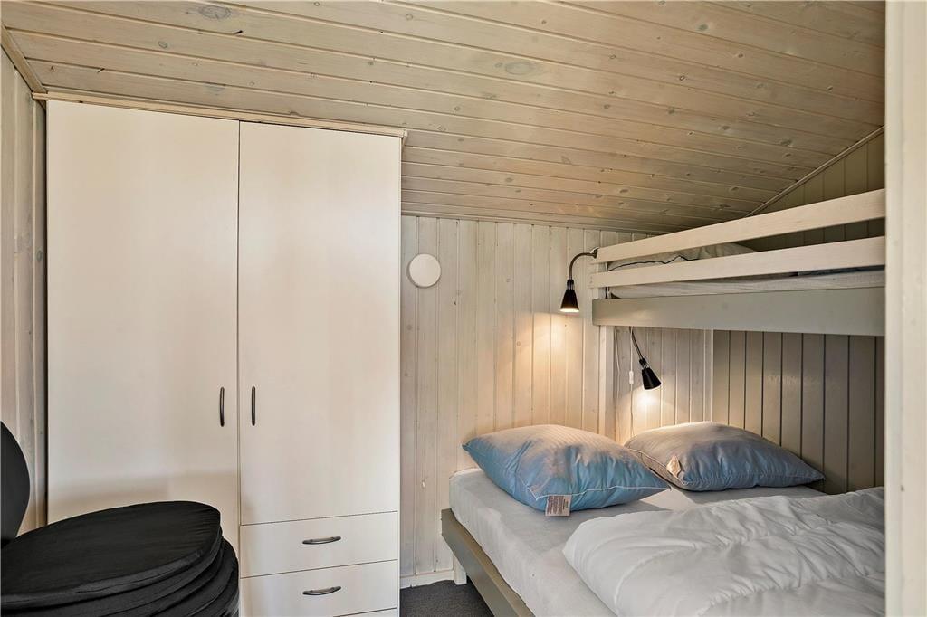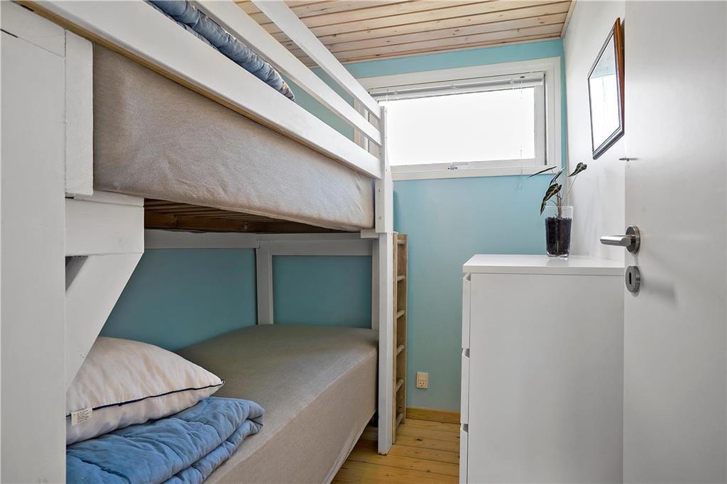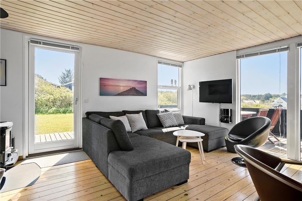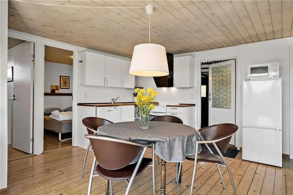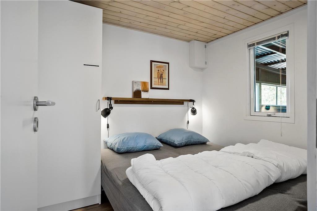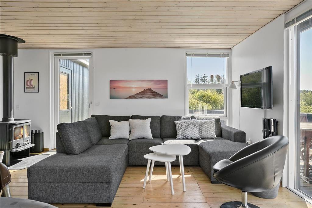 Inden døre i sommerhuset kan I se frem til at hygge jer i den lyse stue, som er udstyret med glasdøre og vinduer vendt mod to verdenshjørner. Hvis vejret er til det, kan I tænde op i brændeovnen og lade varmen sprede sig, mens I ser fjernsyn i sofaafdelingen og spiller spil omkring spisebordet. Madlavningen kan også nemt blive til et hyggeprojekt i køkkenet, der på velfungerende vis ligger som en integreret del af opholdsrummet. Badeværelset er ikke bare indrettet med bruser, men også med vaskemaskine og tørretumbler, og på de tre soveværelser er der i alt plads til seks feriegæster.