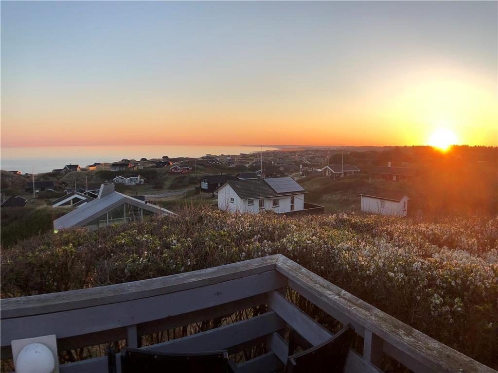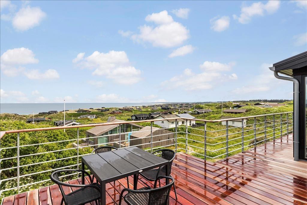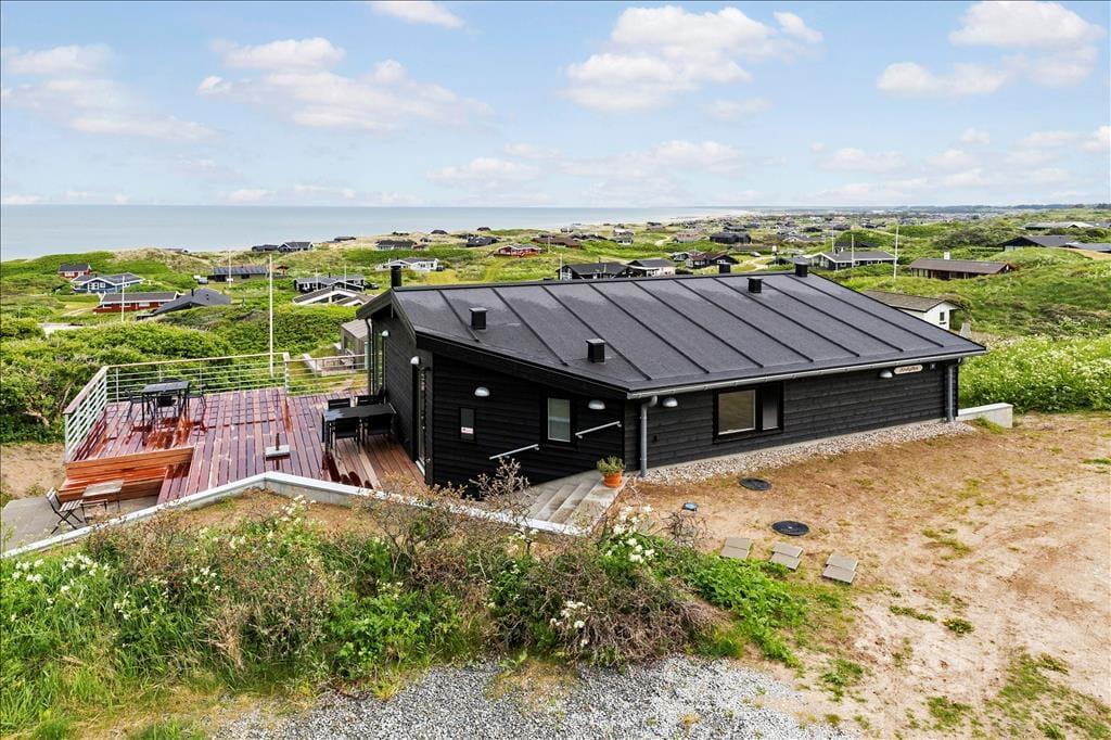 Ved ankomsten til huset vil man opdage at huset er integreret ind i den høje klit, det ligger på toppen af. Først når man kommer ned til huset og den store terrasse, med forskellige niveauer og muligheder, vil man opdage den exceptionelle udsigt og se hvordan huset er orienteret mod havet. Man står 23 meter over havet, og med kun godt 200 meter til vandkanten giver det en helt unik udsigt både over havet, men også sommerhusområdet og kystlinjen helt til Hirtshals 16 km væk. Huset har en ugenert placering i sommerhusområdet "Harerenden", hvor man kan være privat, og på trods af den høje placering ligger huset lige ved en klit, der yder læ for vestenvinden på terrassen.