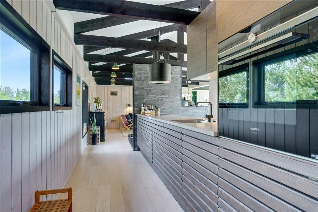 Tager I turen til fods gennem det hyggelige sommerhusområde, er der cirka 750 meter fra huset til stranden. Uanset årstiden er det altid en stor oplevelse at holde ferie ved Vesterhavet, for alt fra lange blæsevejrs-gåture til en dukkert i skinnende sol er noget, man kan blive helt høj af. Og apropos høj, så kan det anbefales at køre en tur hen for at se Rubjerg Knude Fyr, der knejser over de sanddækkede klinter. Efter en udflugt i de naturskønne kystomgivelser kan I tage på restaurant eller shoppetur i Lønstrup, som er kendt for sine mange butikker med kunsthåndværk, gallerier og kustnerværksteder.
