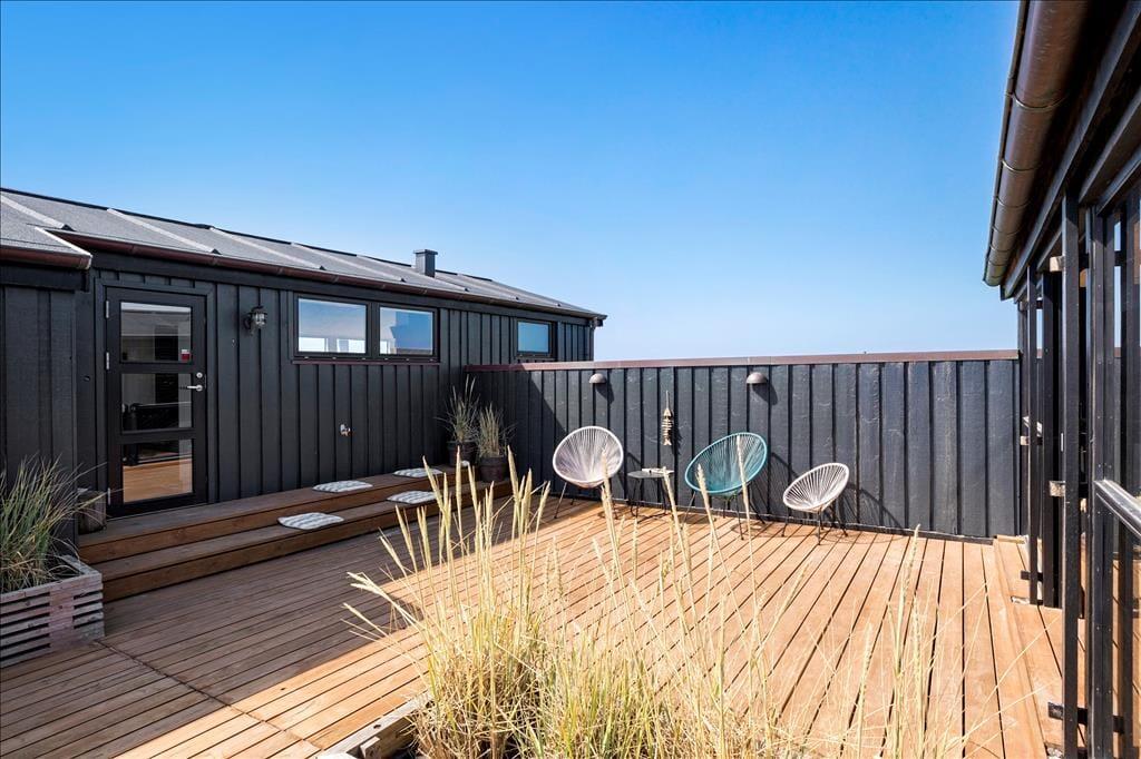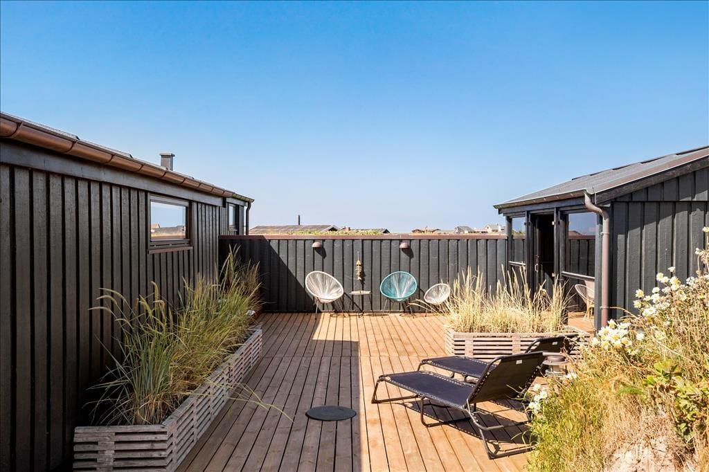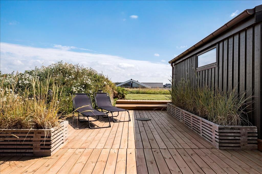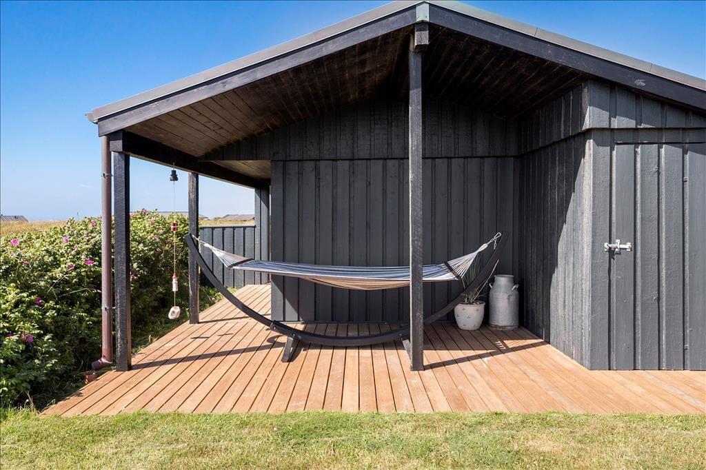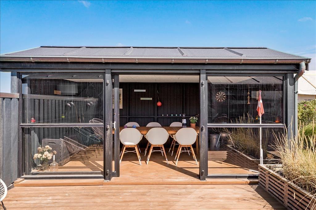 På solrige sommerdage er den flotte træterrasse et sikkert hit: Den smyger sig rundt om flere sider af sommerhuset, og der er både åbne, overdækkede og afskærmede områder at vælge imellem. En del af terrassen er lukket helt af, så den fungerer nærmest som en udestue og er derfor perfekt til lyse sommeraftener og solrige forårsdage.