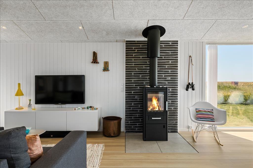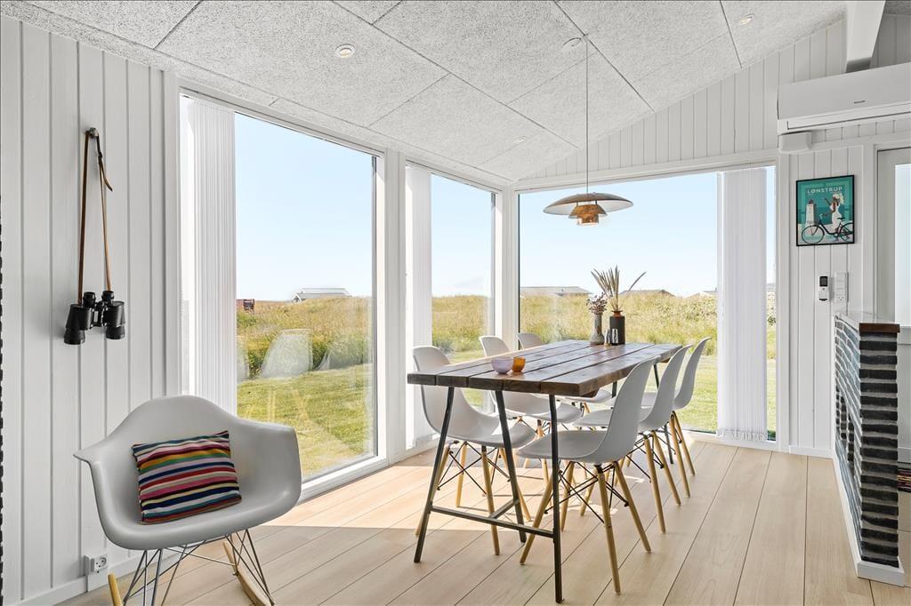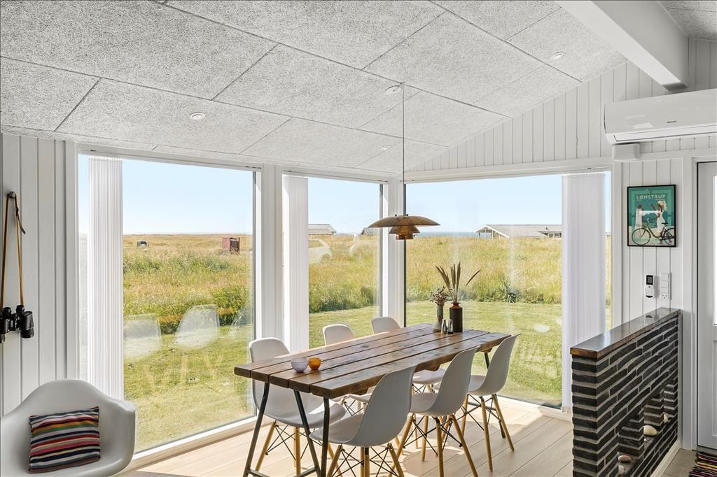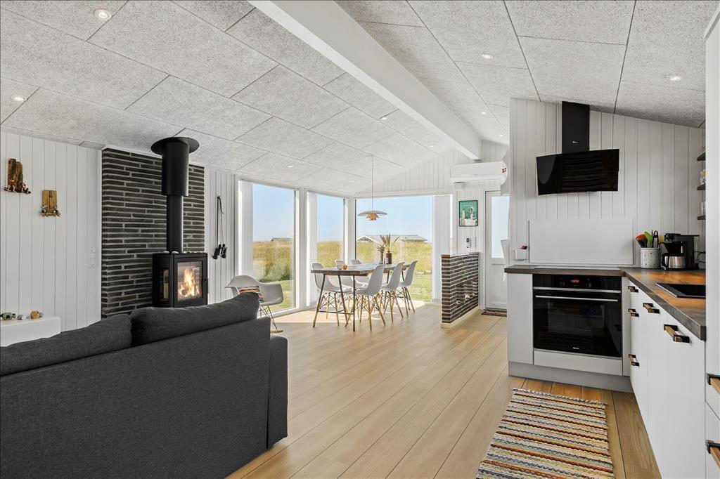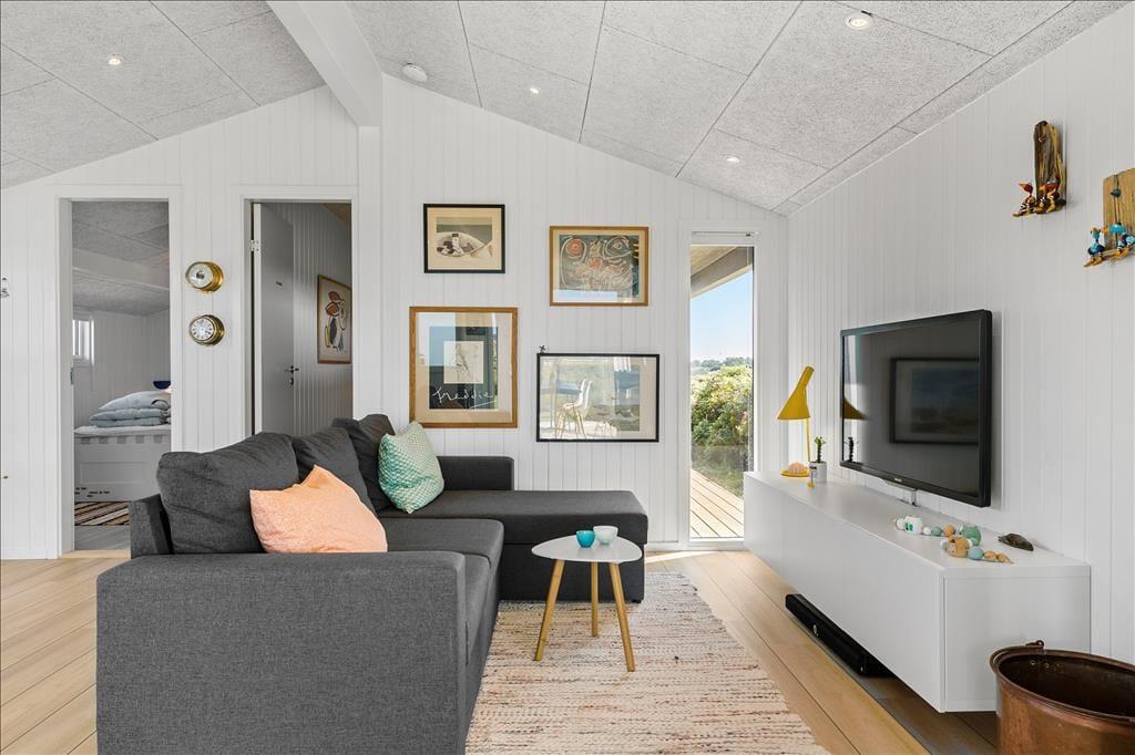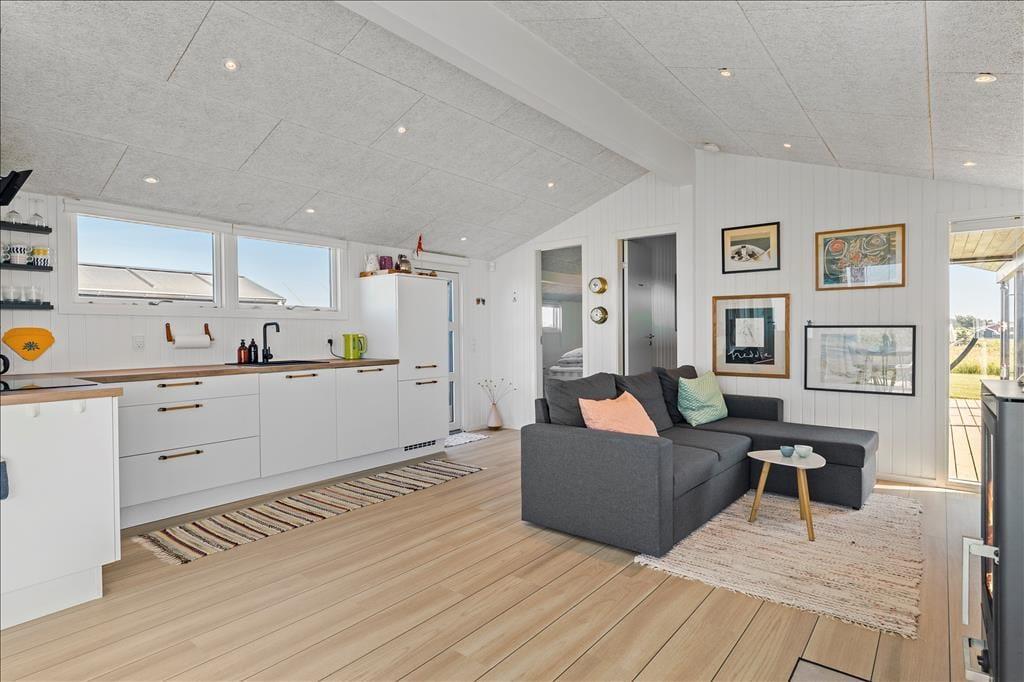 Der blev gået grundigt til værks, da sommerhuset blev moderniseret i 2019. Indretningen er lækker og smagfuld – men på den neddæmpede måde, så rummene stadig emmer af hygge og ægte sommerhuscharme. Alle rum præsenterer sig godt, for æstetikken er mindst lige så tiltalende på badeværelset og de to soveværelser som i husets store opholdsrum. Her i rummet, hvor stue og køkken er forenet, er der indfaldslys fra tre verdenshjørner, og udsigten er imponerende: Ved spisebordet vender de store panoramavinduer lige ud mod havet og de stejle skrænter, der ligger blot 150 meter fra huset, og sætter I jer i sofaafdelingen, kan I nyde det flotte syn af Rubjerg Knude Fyr gennem det smalle, sydvendte vindue.