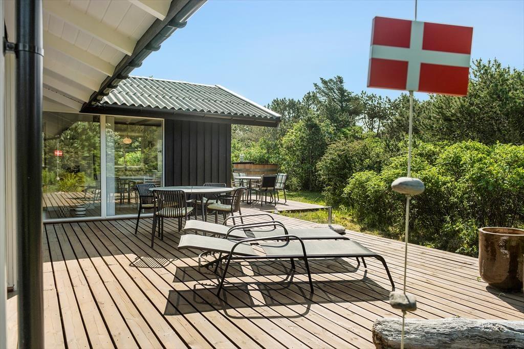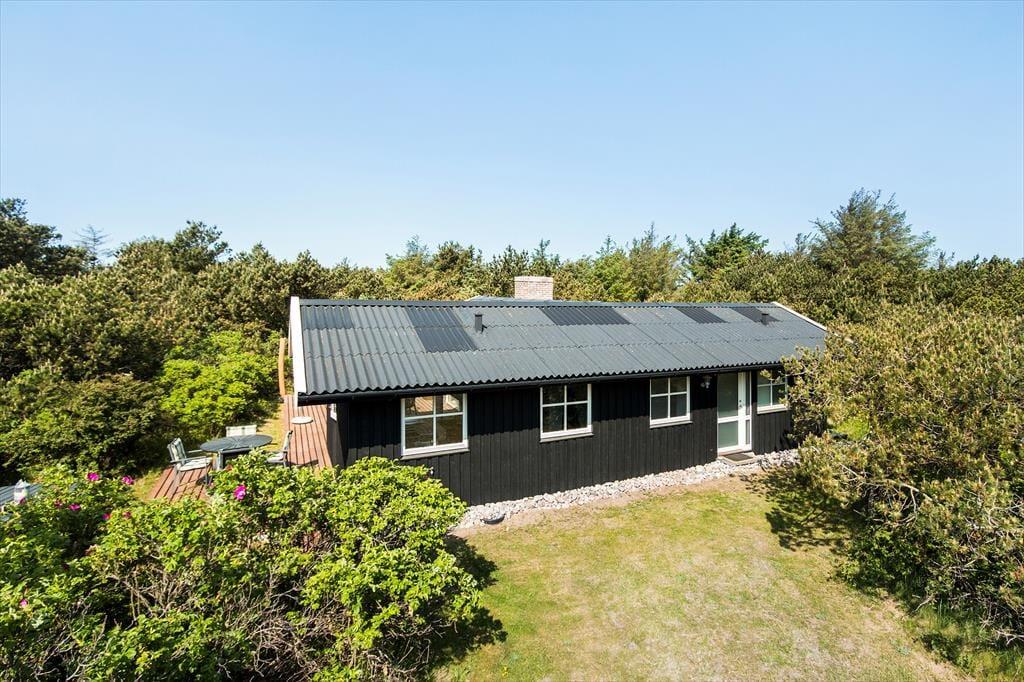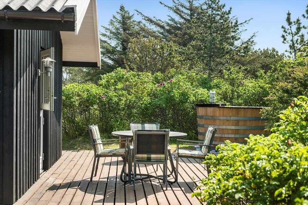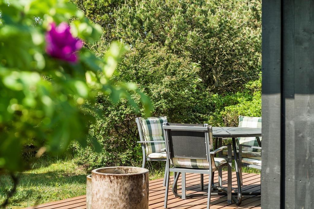 Rundt om tre af husets sider breder et skønt terrassemiljø sig. Hybenbuske, krogede fyrretræer og anden naturskøn beplantning sørger for, at I altid kan finde en opholdsplads med læ, når I vil slænge jer i de gode havemøbler og liggestole. Der er også en overdækket terrasse, og det udendørs ildsted er med til at gøre udelivet om aftenen ekstra stemningsfuldt. Ved sommerhuset er der for øvrigt ladestik til elbil.