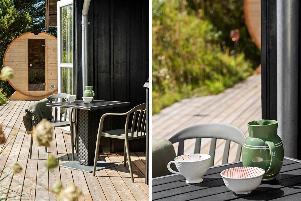 Den 1.500 m2 store og let kuperede grund er et herligt sted at slappe af og hygge sig, når solen skinner. Grundens frodige beplantning er køn at kigge på– for eksempel når I sidder og nyder livet på den delvist overdækkede træterrasse, der breder sig om tre af husets sider.