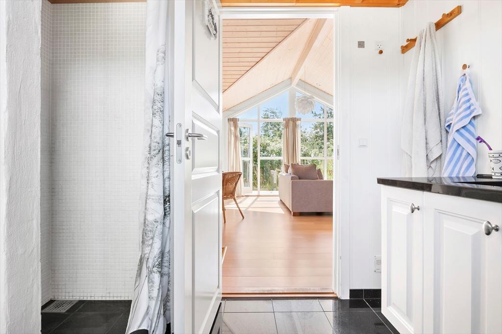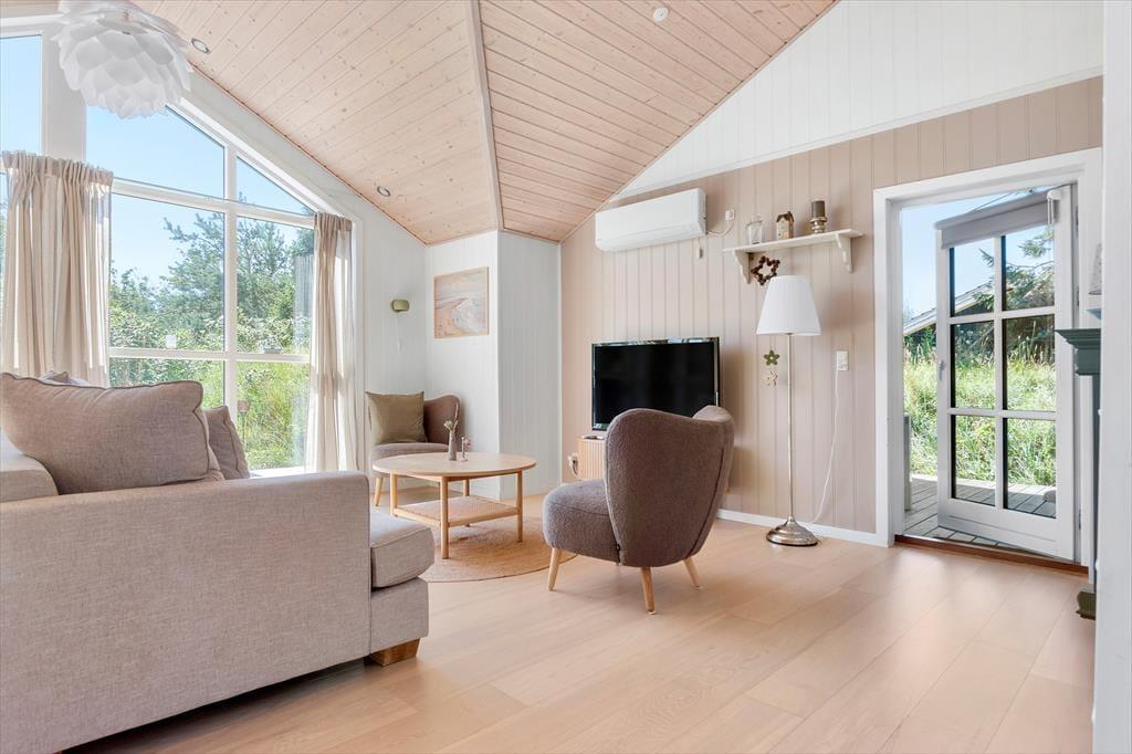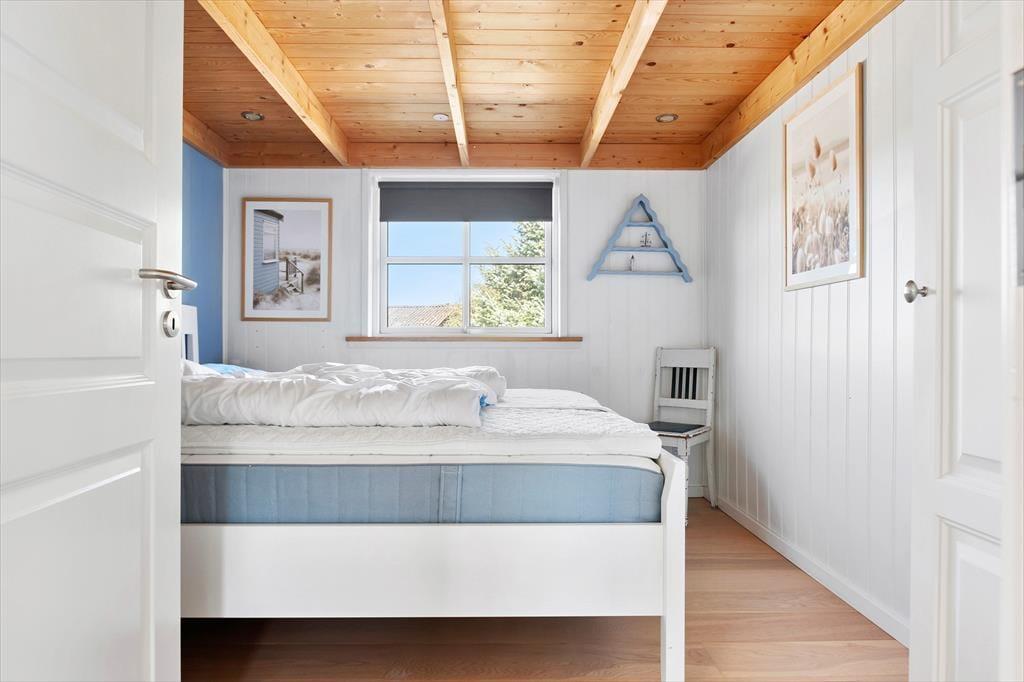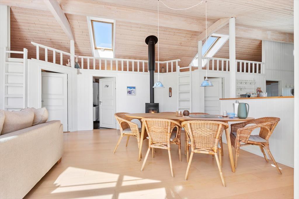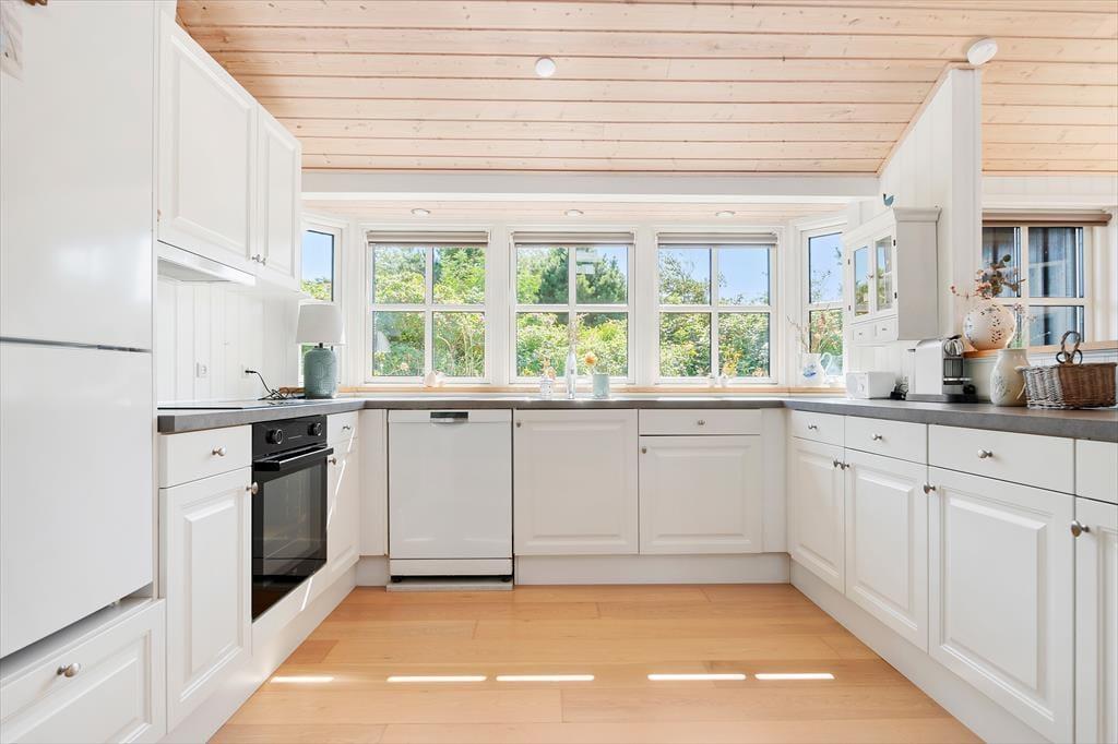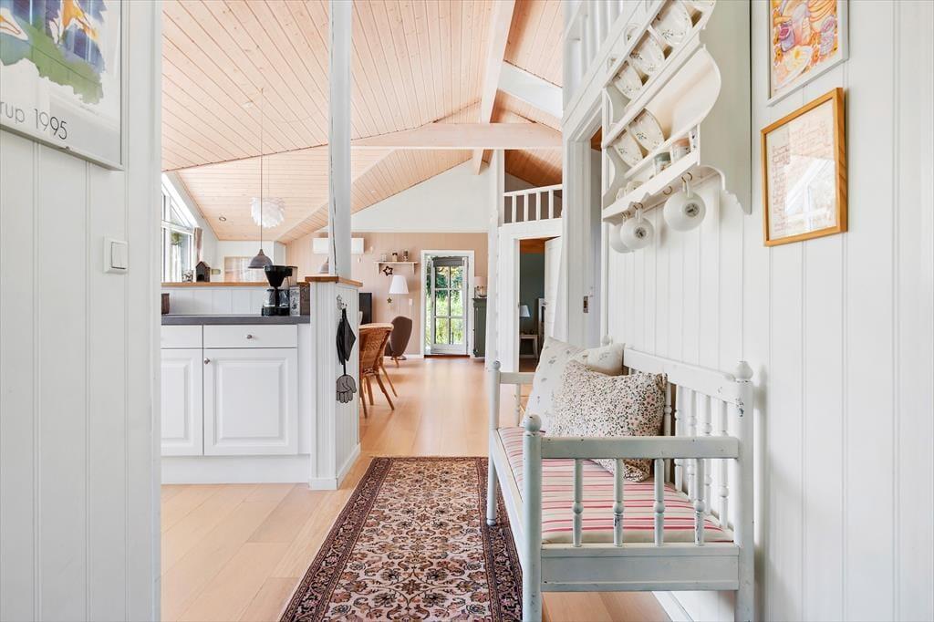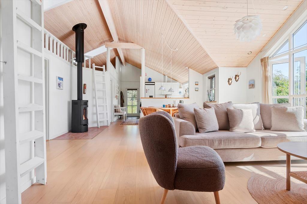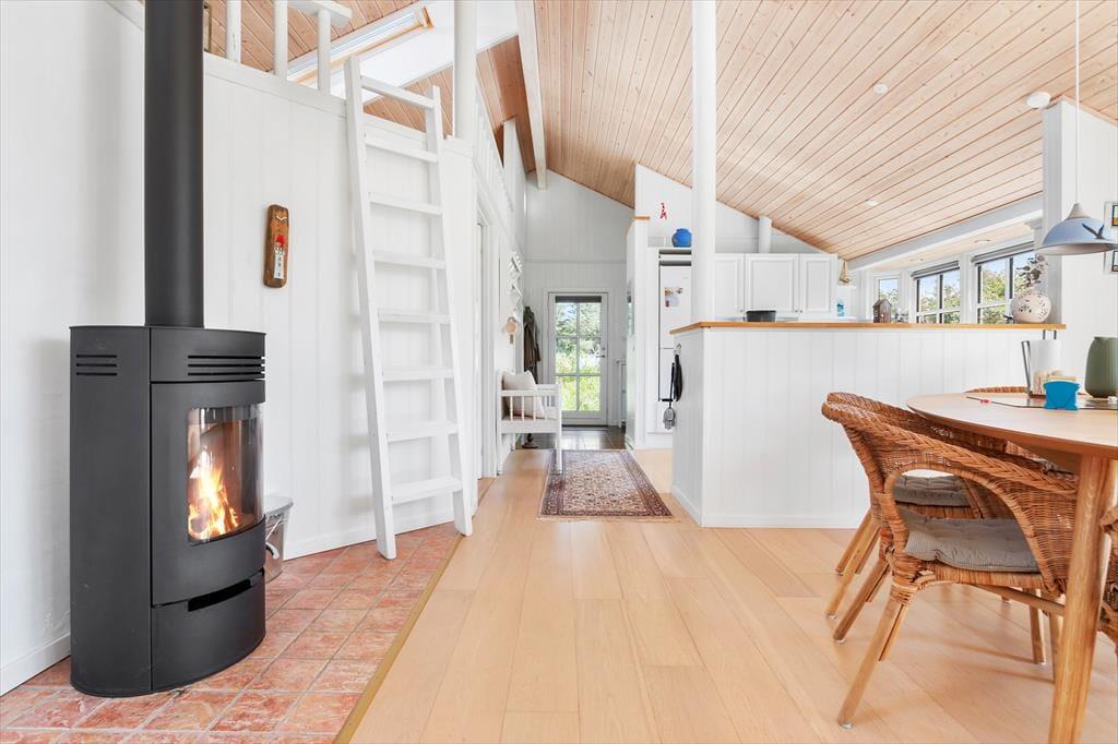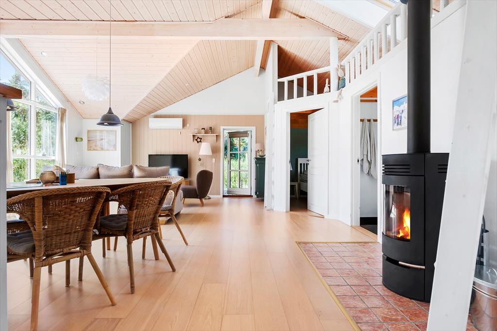 Sommerhuset er et pænt og velproportioneret byggeri på 99 m2. Opførelsesåret er 2008, og det kan tydeligt ses på eksempelvis badeværelset og det rummelige åbne køkken, at der er tale om en nyere feriebolig af høj kvalitet. I det hele taget er indretningsstilen flot, og den gennemførte brug af lyse farvetoner og hyggeskabende møblement giver rummene en skøn og romantisk sommerhusstemning. Det førnævnte køkken er integreret med stuen, som har brændeovn, loft til kip og store vinduespartier, der giver et smukt lysindfald. En entré ligger også i åben forbindelse med opholdsafdelingen, og her er der vaskefaciliteter, så I nemt kan få vasket, hvis I løber tør for rent tøj i løbet af ferien. Fra stuen har I endelig også direkte adgang til en stor hems, der løber ovenover husets tre soveværelser og badeværelset.