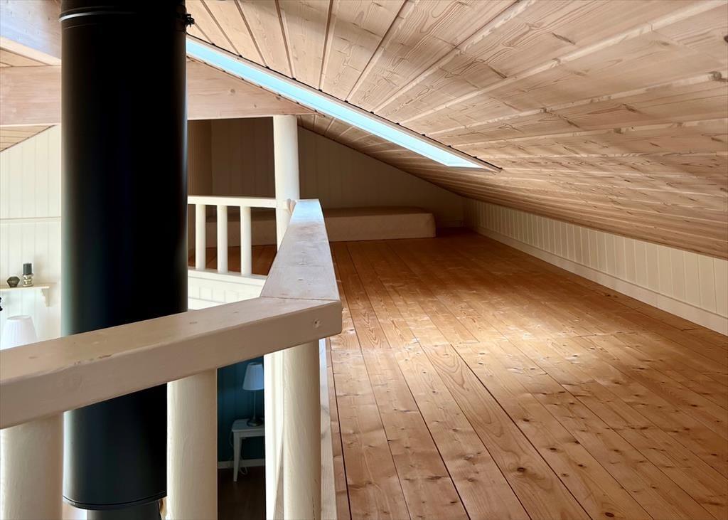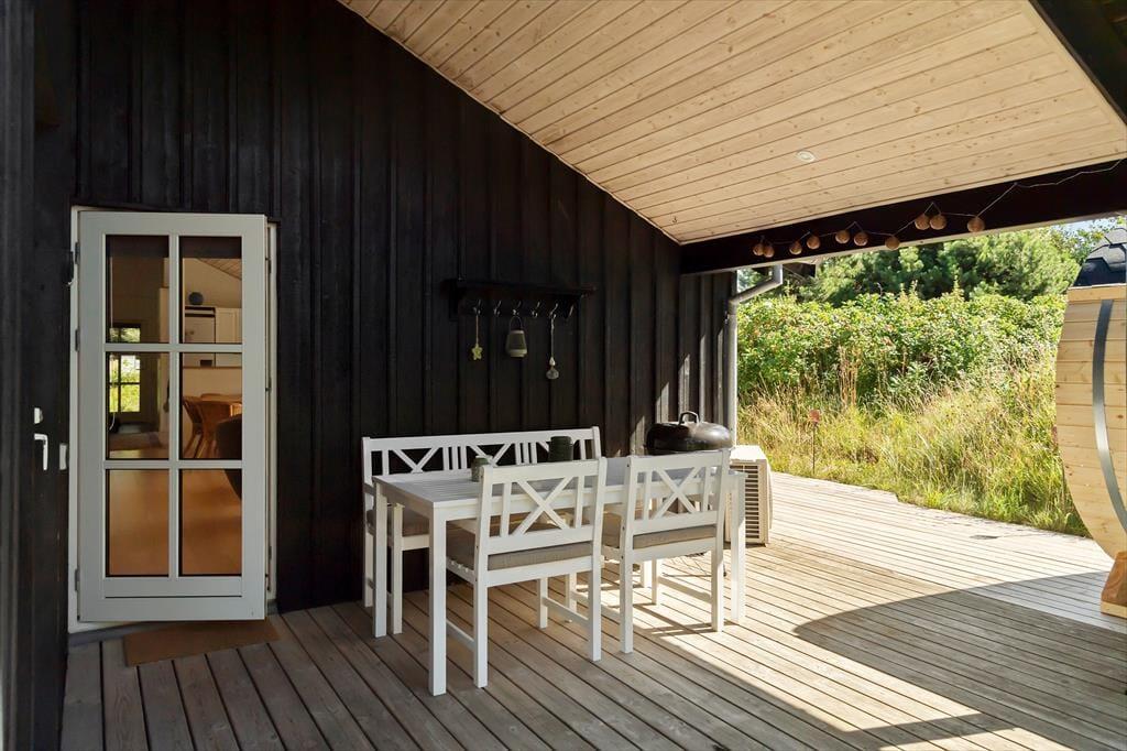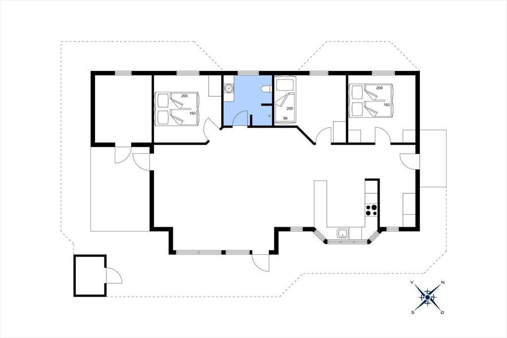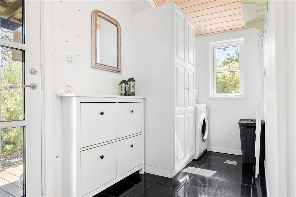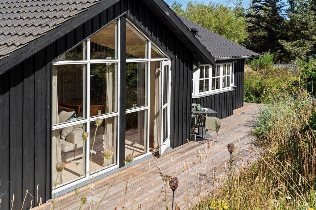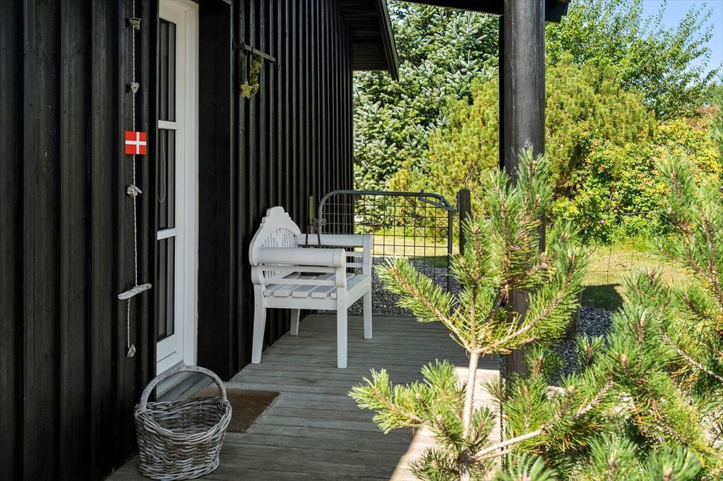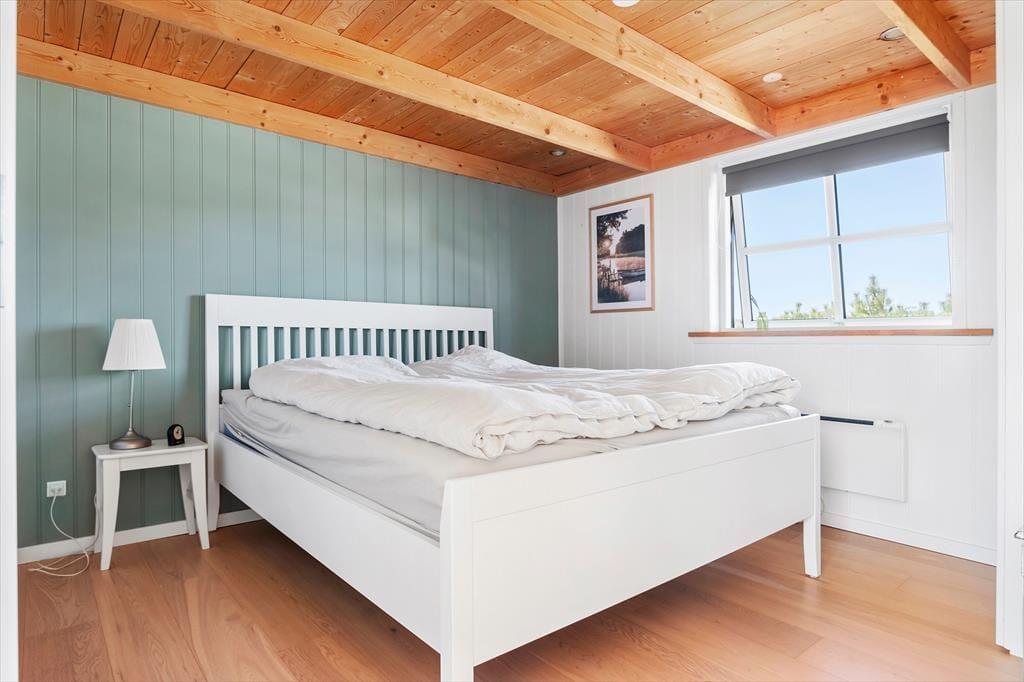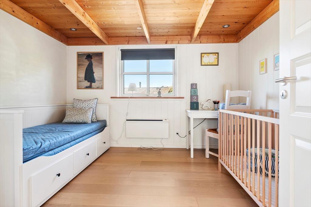 Sommerhuset er et pænt og velproportioneret byggeri på 99 m2. Opførelsesåret er 2008, og det kan tydeligt ses på eksempelvis badeværelset og det rummelige åbne køkken, at der er tale om en nyere feriebolig af høj kvalitet. I det hele taget er indretningsstilen flot, og den gennemførte brug af lyse farvetoner og hyggeskabende møblement giver rummene en skøn og romantisk sommerhusstemning. Det førnævnte køkken er integreret med stuen, som har brændeovn, loft til kip og store vinduespartier, der giver et smukt lysindfald. En entré ligger også i åben forbindelse med opholdsafdelingen, og her er der vaskefaciliteter, så I nemt kan få vasket, hvis I løber tør for rent tøj i løbet af ferien. Fra stuen har I endelig også direkte adgang til en stor hems, der løber ovenover husets tre soveværelser og badeværelset.