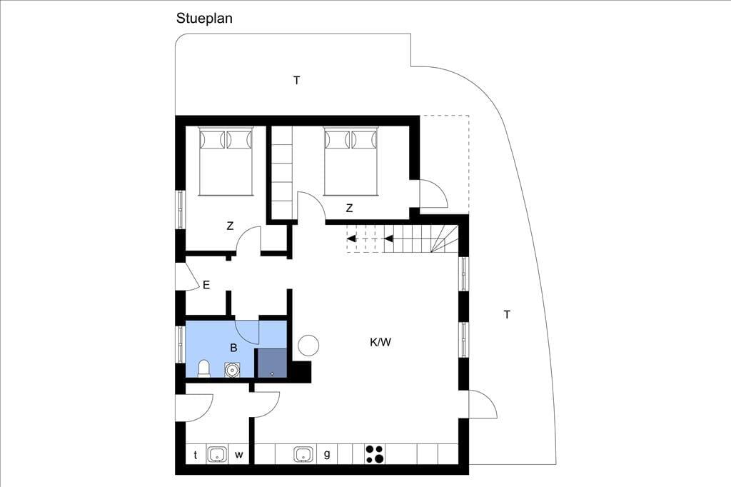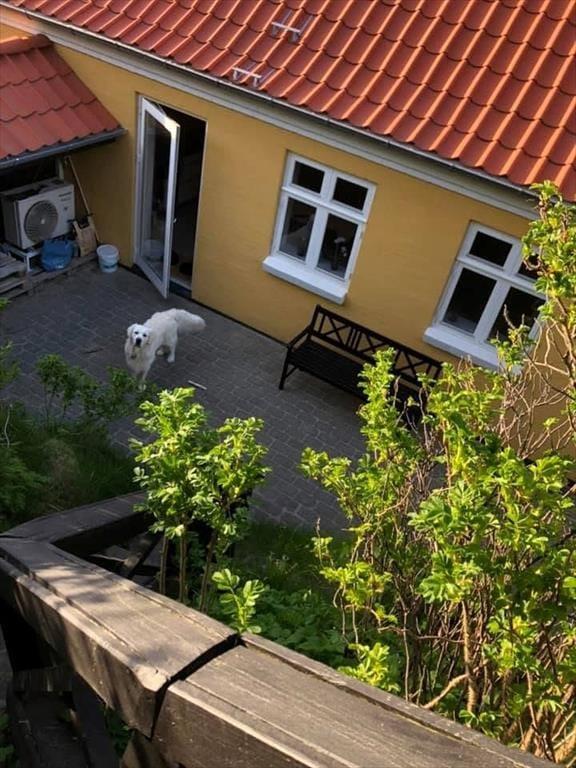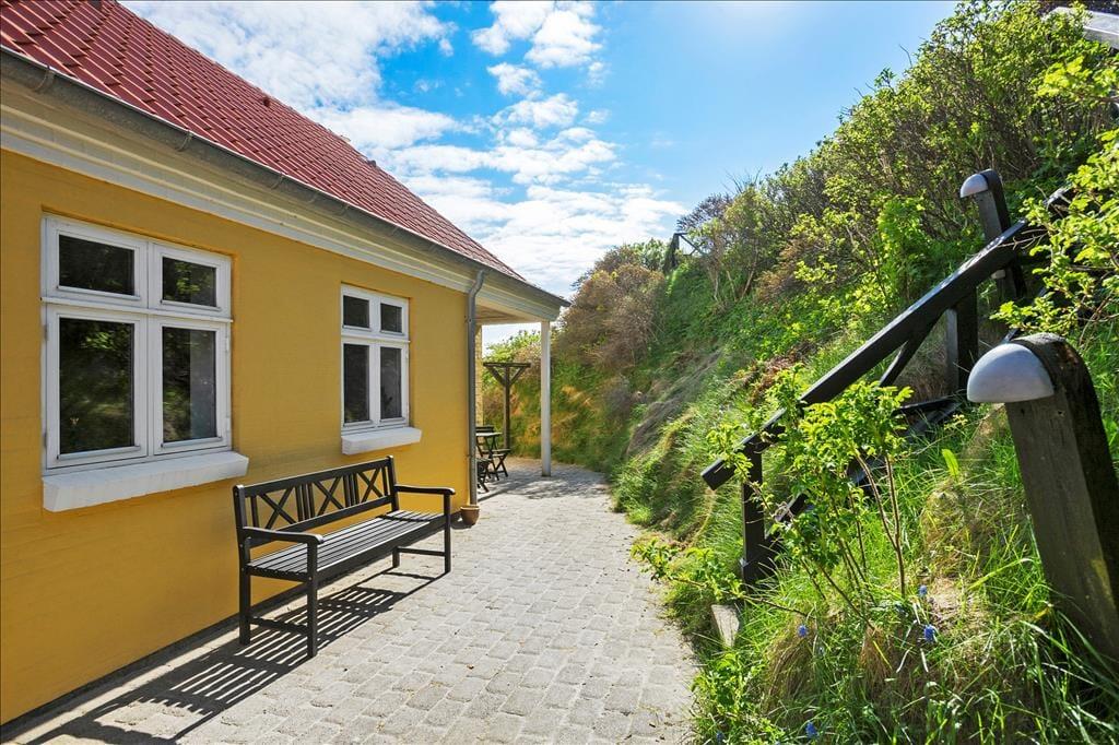Den 1.019 m2 store grund ligger på en skråning, så der går en trappe op fra vejen til sommerhuset. Ved huset er der flisebelagte terrasser, hvor I kan nyde udelivet på ugeneret vis.