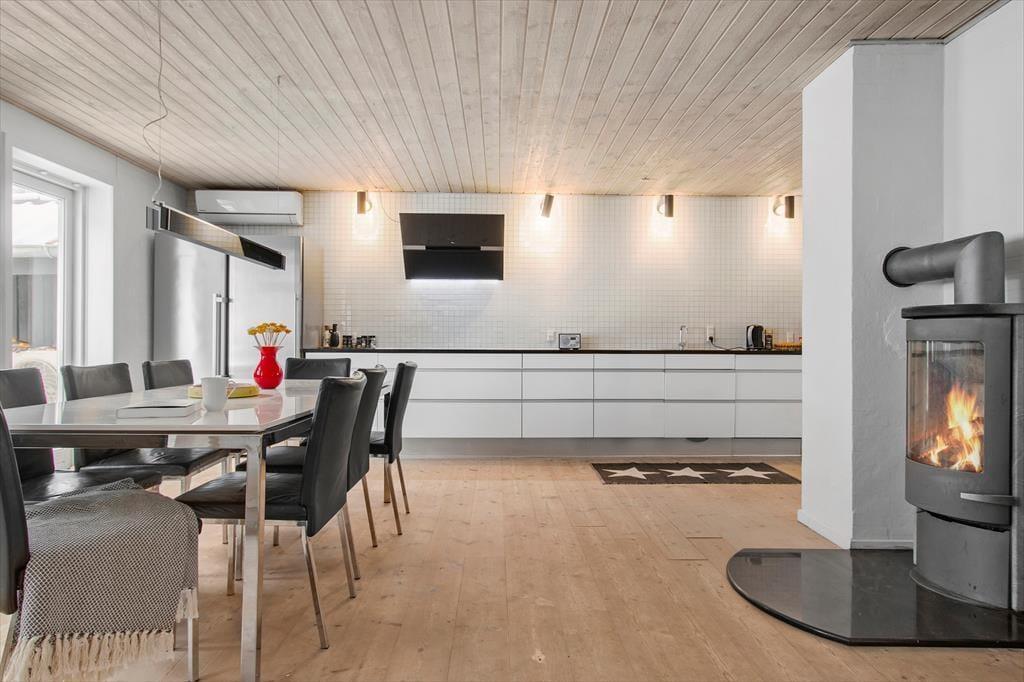 Nærmere præcist er der tale om et halvt dobbelthus, som har et ganske klassisk ydre med gul facade og rødt tegltag – selvom det er et nyere byggeri, der tilmed er blevet renoveret i 2015. Indretningen er lys og moderne, og med 122 m2 fordelt på to etager er der god plads til at folde ferielivet ud. For eksempel kan I hygge jer i stueetagens flotte køkken-alrum med lækker mad, gode samtaler og ild i brændeovnen. Alternativt kan I rykke op i førstesalens stue, hvor der også er brændeovn – og her bliver I endda belønnet med det fineste lysindfald og en skøn udsigt over Lønstrup. Huset byder også på tre gode soveværelser, der alle er indrettet med dobbeltseng, og et badeværelse og et bryggers hører også med til den velfungerende planløsning.
