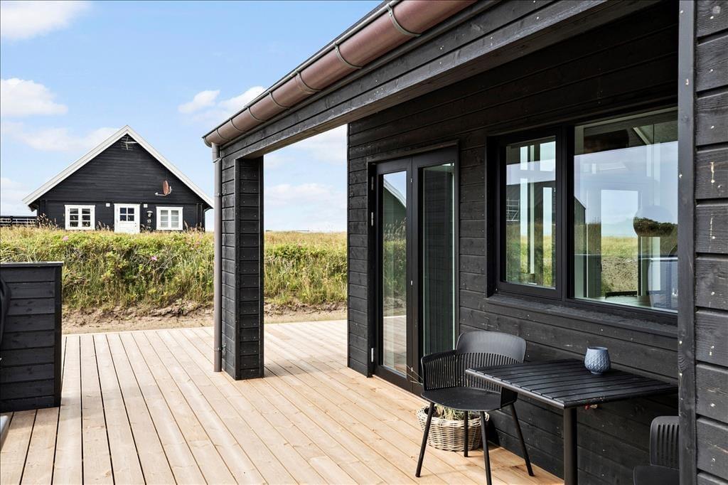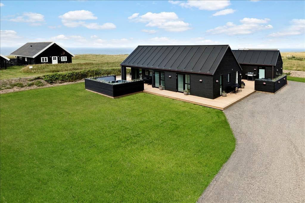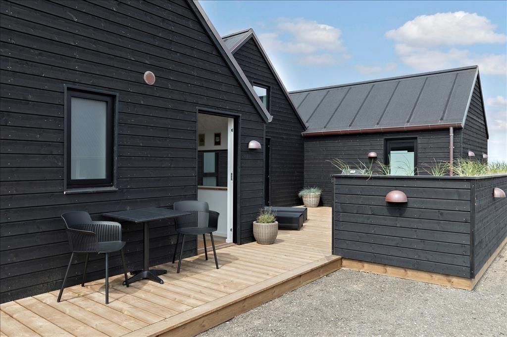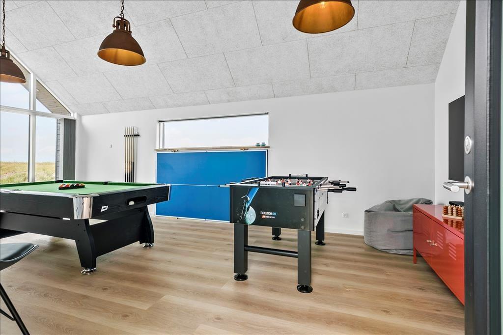 Huset er opført i en enkel, tidløs byggestil med sortmalet træfacade og store vinduer. Her mærker man med det samme den gode kvalitet i alle løsninger, og indenfor er der en utroligt indbydende atmosfære, som med det samme bringer feriefølelsen frem. Rummene er lyse og lækre, og de store vinduespartier og kiplofterne trækker Vesterhavets enestående natur helt ind i huset. Huset har et stort opholdsrum med integreret køkken og udgang til terrasser mod vest og syd. I tillæg til de tre soveværelser er der en hems i stuen med fire enkeltsenge samt en hems på et af dobbeltværelserne med to enkeltsenge. Der er et fint aktivitetsrum i annekset med bordtennis, billard, dart og bordfodbold – og som ekstra bonus er der et lille minikøleskab, så man kan nyde en kold sodavand, mens man dyster. Endelig er der to badeværelser, hvoraf det største er udstyret med badekar, vaskemaskine og tørretumbler.