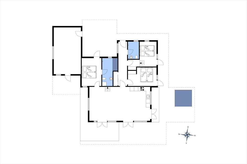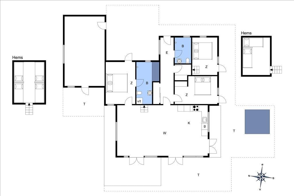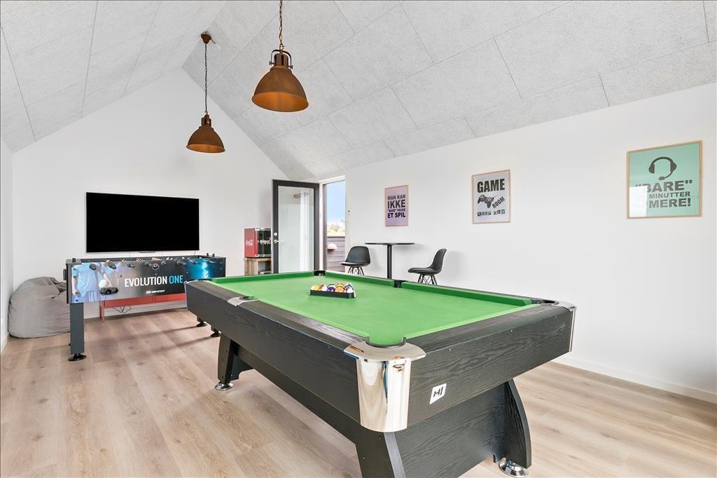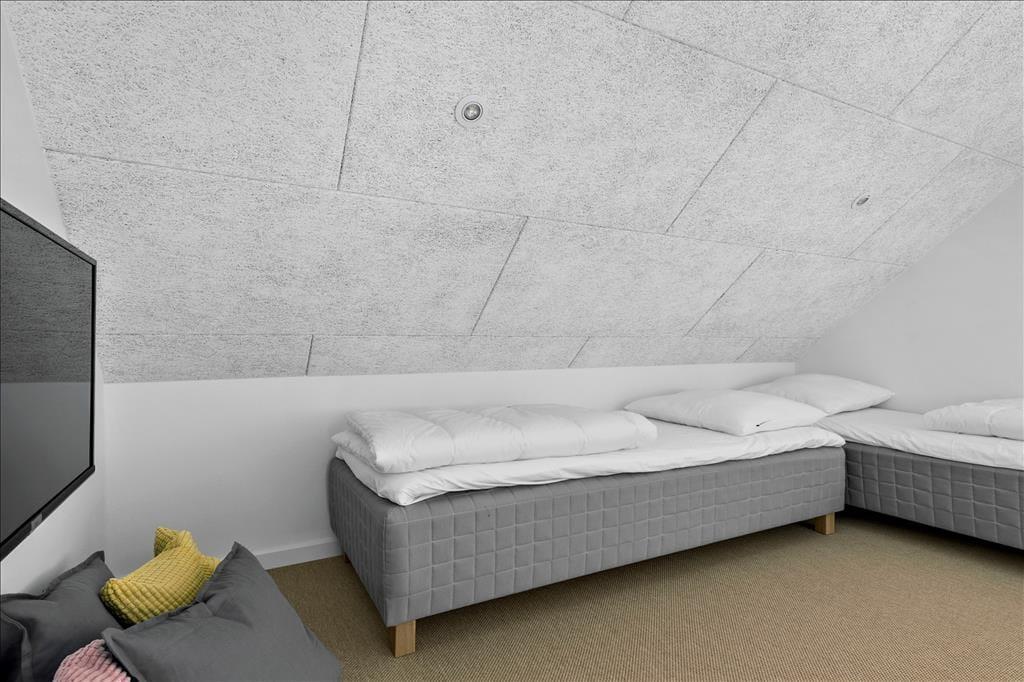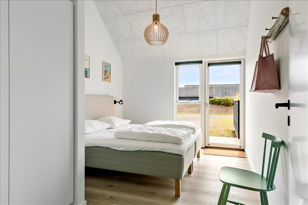 Huset er opført i en enkel, tidløs byggestil med sortmalet træfacade og store vinduer. Her mærker man med det samme den gode kvalitet i alle løsninger, og indenfor er der en utroligt indbydende atmosfære, som med det samme bringer feriefølelsen frem. Rummene er lyse og lækre, og de store vinduespartier og kiplofterne trækker Vesterhavets enestående natur helt ind i huset. Huset har et stort opholdsrum med integreret køkken og udgang til terrasser mod vest og syd. I tillæg til de tre soveværelser er der en hems i stuen med fire enkeltsenge samt en hems på et af dobbeltværelserne med to enkeltsenge. Der er et fint aktivitetsrum i annekset med bordtennis, billard, dart og bordfodbold – og som ekstra bonus er der et lille minikøleskab, så man kan nyde en kold sodavand, mens man dyster. Endelig er der to badeværelser, hvoraf det største er udstyret med badekar, vaskemaskine og tørretumbler.