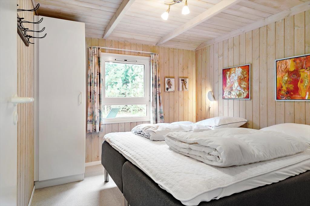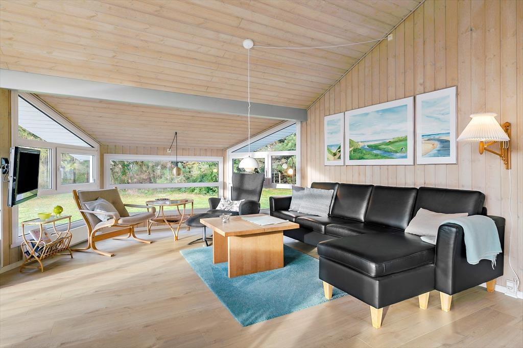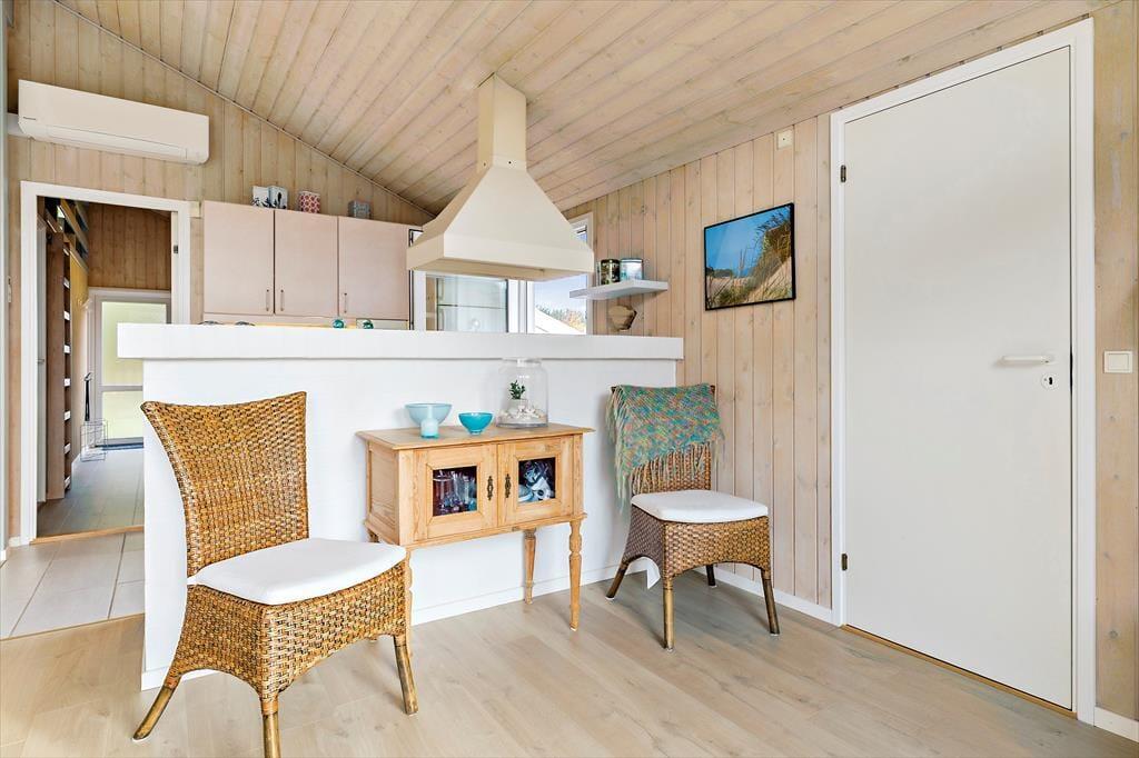 Indenfor mødes du af en lys og hyggelig atmosfære, hvor indretningen oser af sommerhusstemning. Her er fokus på nærvær, ro og enkelhed – præcis det, man drømmer om, når man trænger til et pusterum fra hverdagen. Stuen og køkkenet ligger i åben forbindelse, så du kan følge med i samtalen, mens du laver mad, spiller et spil med familien eller blot nyder et glas vin i sofaen. De store vinduer lader lyset strømme ind og skaber en naturlig forbindelse til omgivelserne udenfor. Her får du den der helt særlige følelse af at være tæt på naturen, selv når du sidder indenfor med en kop kaffe og kigger ud over landskabet.