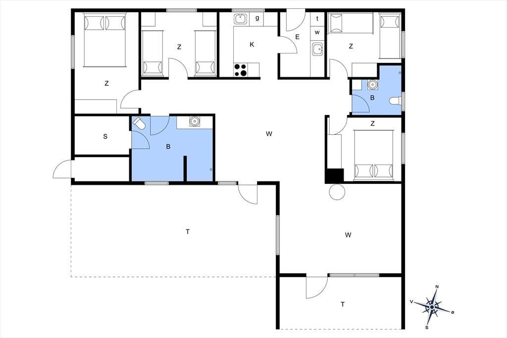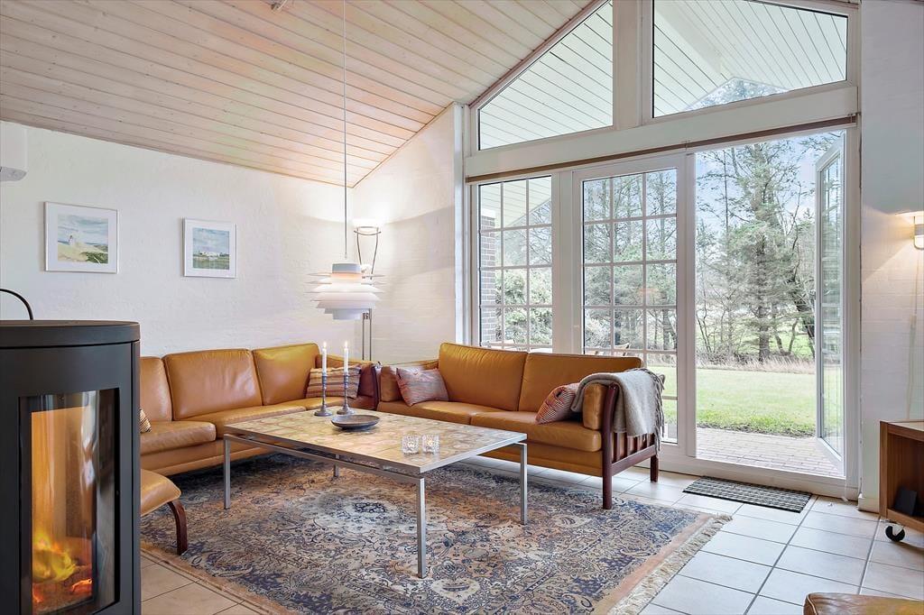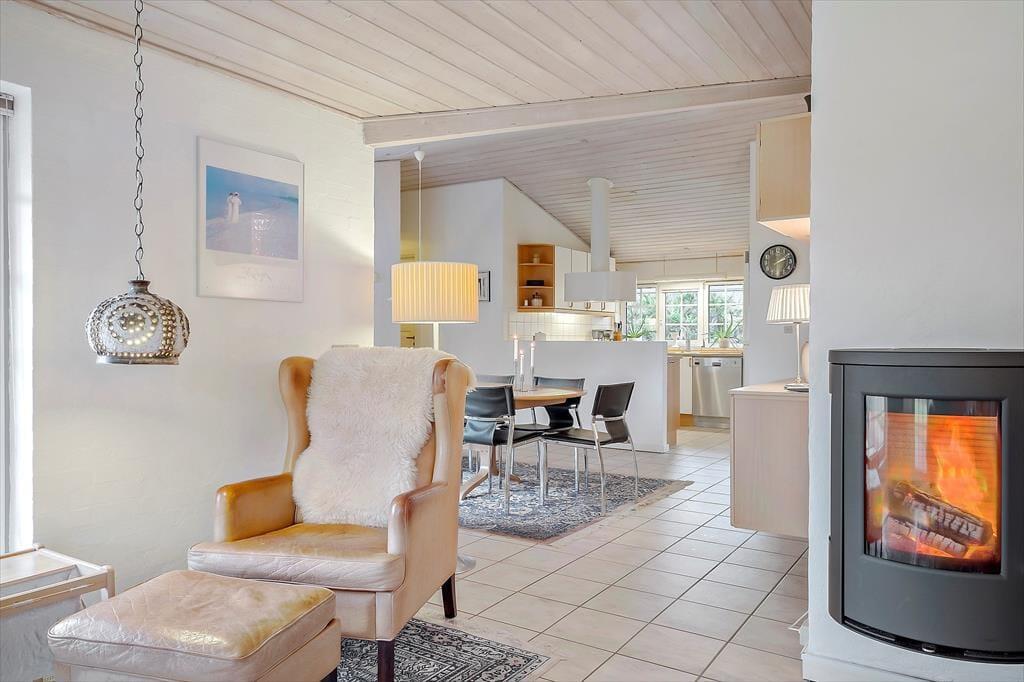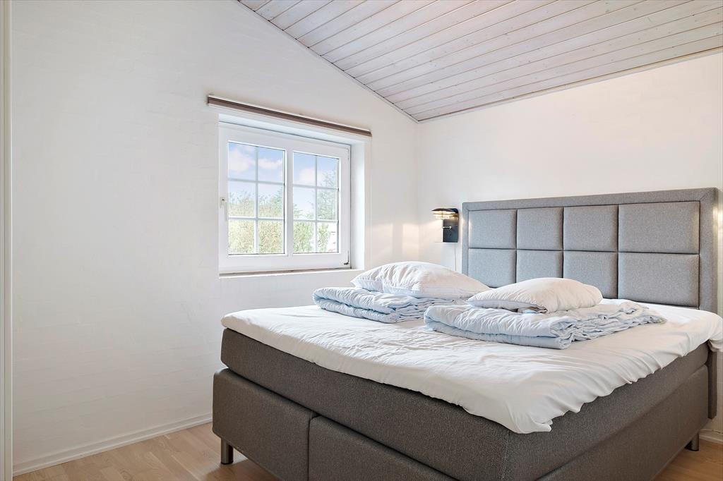 Sommerhuset er et gedigent stenhus på 119 m2, og med så mange kvadratmeter kan I nemt samles otte personer i huset. De gode ferieforhold skyldes selvfølgelig også den gennemtænkte planløsning, der blandt andet byder på fire soveværelser og to badeværelser, hvoraf det største er udstyret med sauna. Begge badeværelser har desuden bruser, og alle sovegemakker er rummelige og er indrettet med gode kvalitetssenge. Indretningens høje kvalitet kan også ses og mærkes i stuen, der er lyst og pænt indrettet med stilfuldt møblement, væghængt brændeovn, varmepumpe og andre gode detaljer. Et veludstyret køkken ligger i åben forbindelse med stuen, og lige ved siden af ligger entréen, hvor I finder både vaskemaskine, tørretumbler og mikroovn.