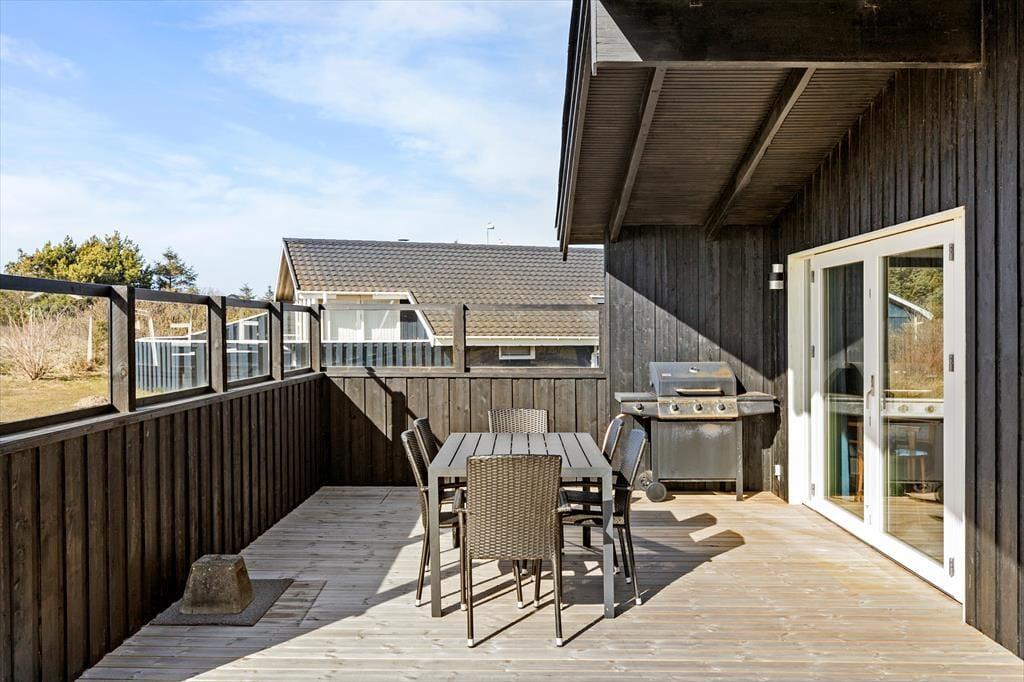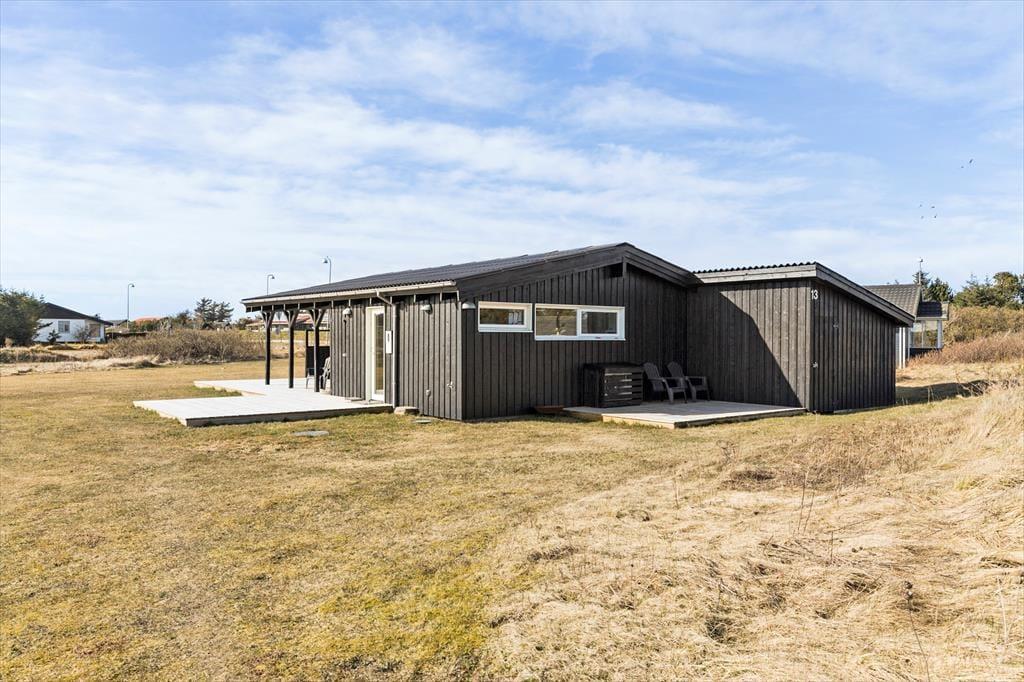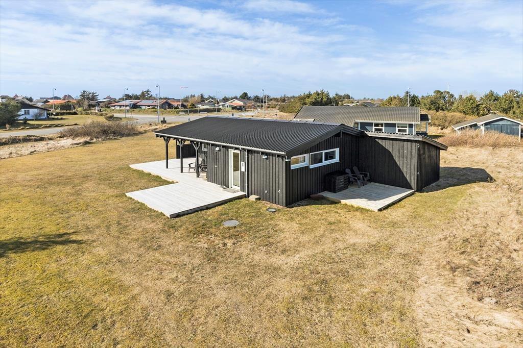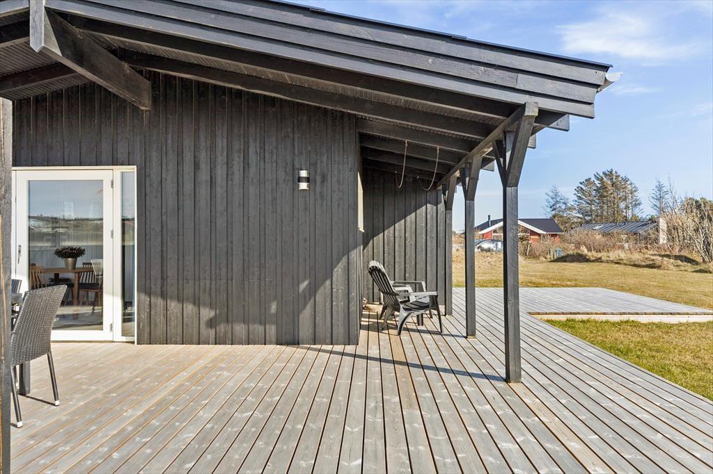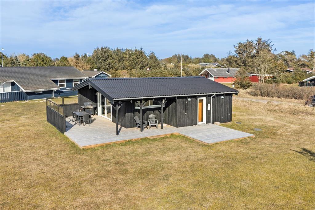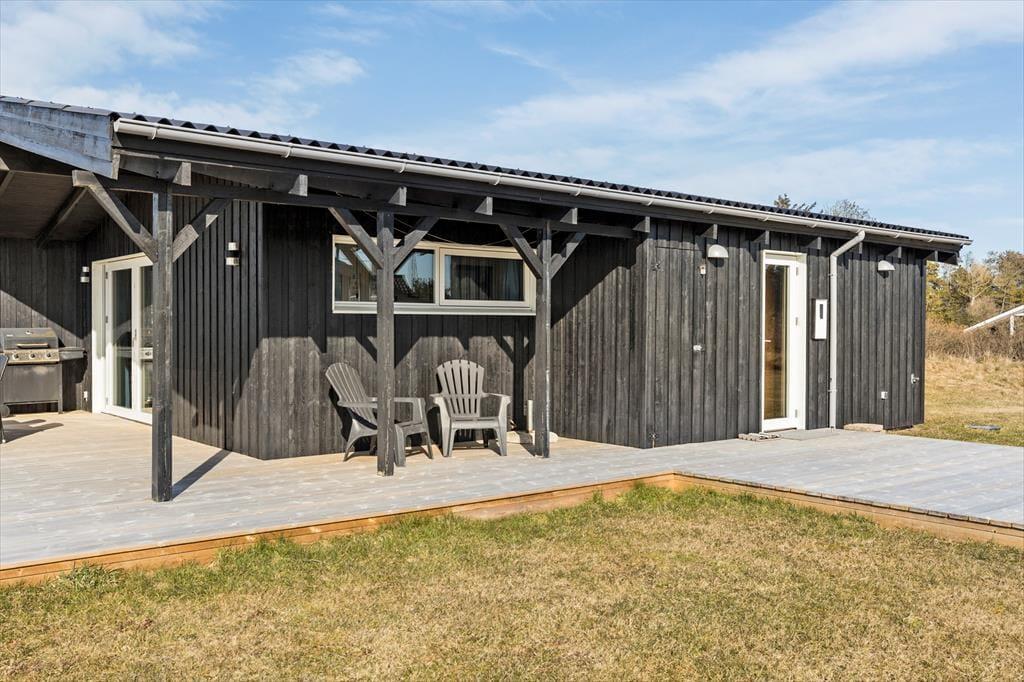 Huset ligger på en 1.180 m2 stor grund med masser af plads til leg og boldspil. Der er store fine terrasser rundt om huset, hvor I kan nyde feriedagene under åben himmel. Terrasserne ligger mod både øst, syd og vest, så I kan følge med solen rundt i løbet af dagen – eller flytte den anden vej, hvis I foretrækker at sidde i skygge. En del af terrassearealet er overdækket, så I kan også dække op til frokost eller aftensmad med udsigt til det grønne, selvom det skulle dryppe lidt fra oven.
