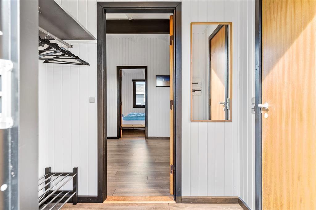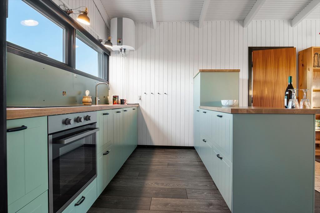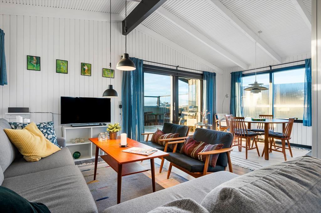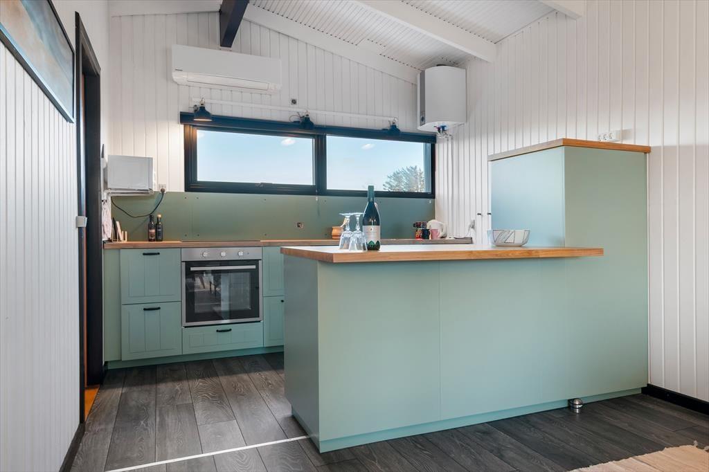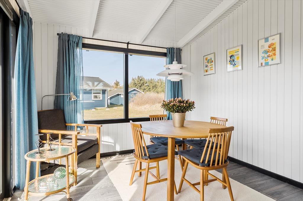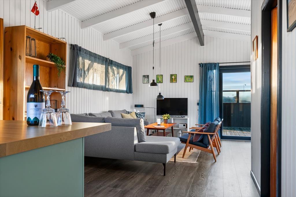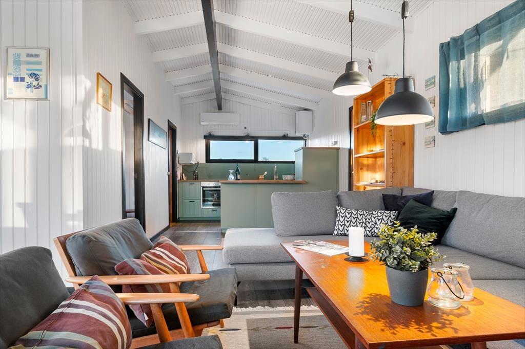 Der er en lys og indbydende atmosfære i huset, der er blevet renoveret med stor respekt for den oprindelige sommerhusstil. Ferieturens hyggelige samvær får fine betingelser i det hyggelige opholdsrum, der ligger i åben forbindelse med køkkenet. Her er der blevet plads til både en spiseafdeling og et sofahjørne, og kiploftet bidrager sammen med de store vinduespartier til oplevelsen af lys og luft. Køkkenet er blevet udskiftet og fremstår moderne, stilfuldt og har fået en flot finish, der matcher resten af husets interiør. Det er blevet et rigtig samtalekøkken, hvor man kan nyde et glas vin, mens maden simrer på komfuret. Huset indeholder herudover to soverum samt et badeværelse.