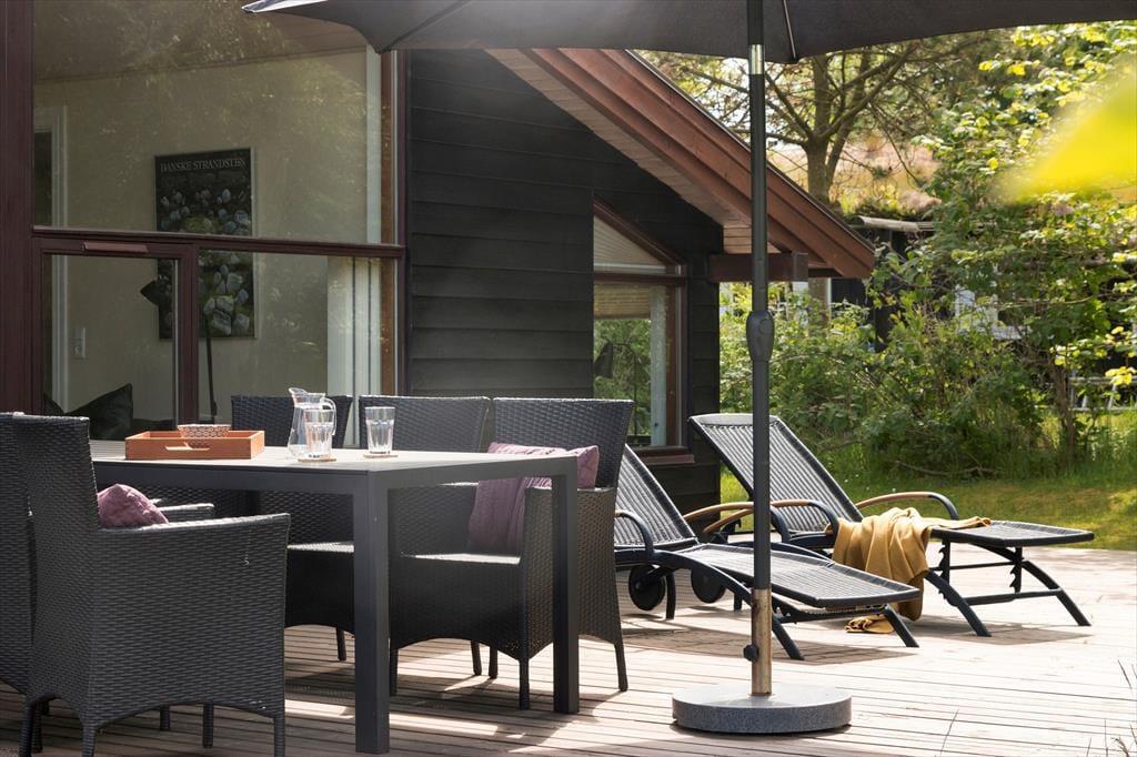 Når vejret er godt, fungerer den store terrasse som en herlig forlængelse af husets opholdsmiljø. Fra stuen kan I smutte lige ud i solen og slå jer ned i liggestolene eller ved havebordet – og hvis madlavningen også skal foregå herude, er der både gas- og kulgrill til rådighed. Terrassen er stor, så I kan sætte jer lige der, hvor solforholdene er bedst, og ellers har I masser af plads til at lege og slænge jer på grundens store græsplæne.