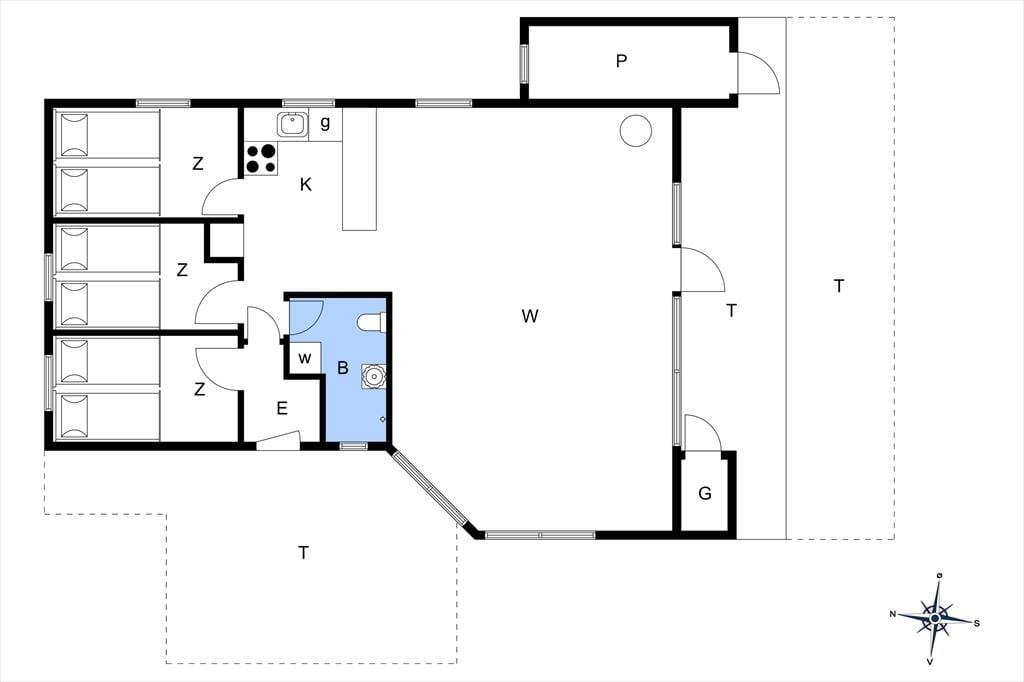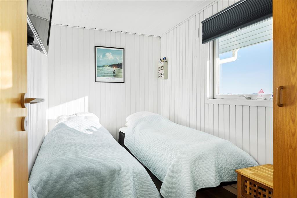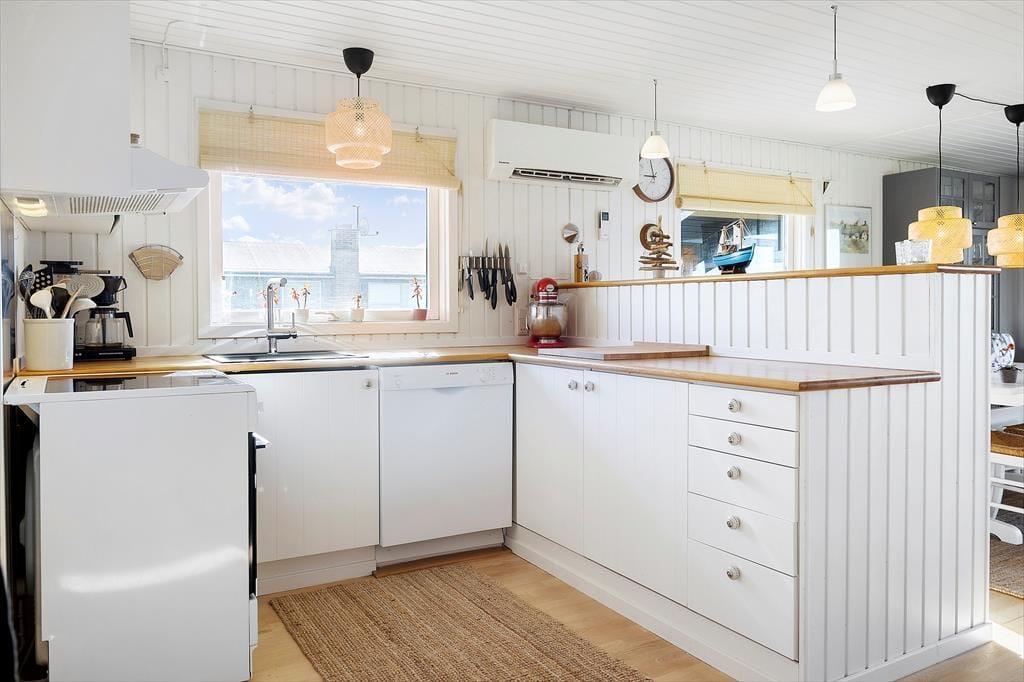 På den lukkede vej Bredningen ligger huset i anden række til kysten, men der er ikke noget, der skygger for udsigten stik vest for stuevinduet. I har med andre ord det smukkeste bagtæppe, når I slapper af inden døre, så det kan være helt svært at koncentrere sig om at se film, med mindre I trækker gardinet for. Et stort fladskærms-tv er placeret lige ved sofaafdelingen, og derudover byder stuen på en klassisk brændeovn og en hyggelig spiseplads med slagbænk. Køkkenet ligger i åben forbindelse med stuen, og her har I alt, hvad I skal bruge, inklusiv opvaskemaskine. Badeværelset er enkelt og funktionelt indrettet med bruseniche og vaskemaskine, og på de tre gode soveværelser er der plads til, at seks overnattende gæster kan sove komfortabelt.