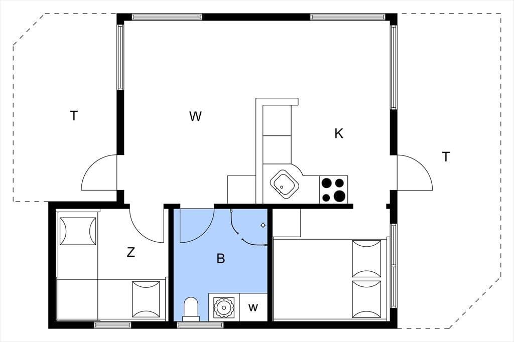 Indenfor finder du et enkelt, ældre interiør med træpaneler og den klassiske sommerhusstemning og med store vinduer, der lukker naturen og lyset ind. Huset rummer en opholdsstue i åben forbindelse med køkkenet samt et badeværelse med bruser – ideelt til et par, der ønsker en afslappet ferie tæt på naturen.