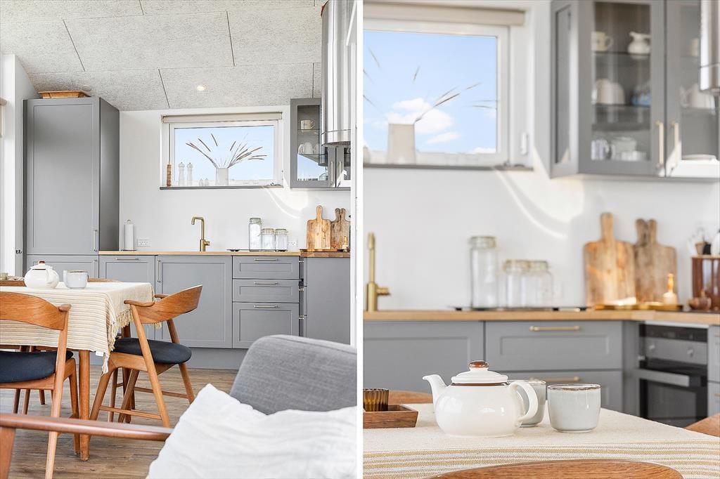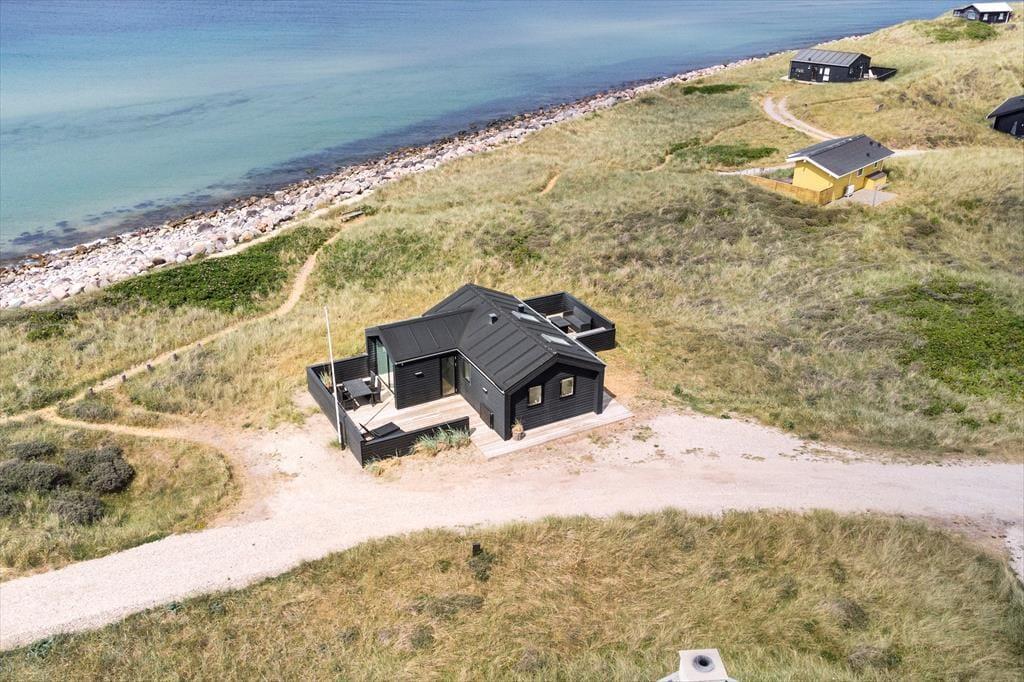 Beliggenheden er helt fantastisk, og det samme tillægsord kan bruges om selve sommerhuset, der har en smagfuld indretning og en lys atmosfære. Inden døre er der højt til loftet og gulvvarme overalt, og de store vinduespartier sørger for, at I kan sidde og lade tankerne vandre, mens I skuer ud over det åbne hav. Stuen er integreret med et veludstyret køkken, og derudover byder planløsningen på to gode soveværelser og et pænt brusebadeværelse. Som et moderne byggeri fra 2020 kan det for øvrigt nævnes, at der er taget højde for både energiforbruget og miljøet, for der er tale om et energihus med solvarme og luft til vand-varmepumpe.