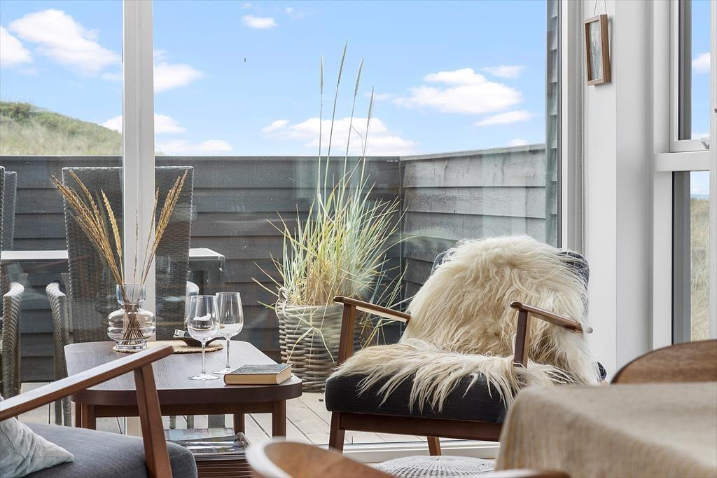 Sommerhuset kan rumme tre personer og en hund, og både to- og firbenede familiemedlemmer får tilsvarende glimrende forhold ude i det fri. Her venter der nemlig to skønne terrasser, der begge er helt aflukkede, og uanset om I sidder her eller på det åbne terrasseareal ud for stuen, føles det eksklusivt at opholde sig i første parket til Vesterhavet.