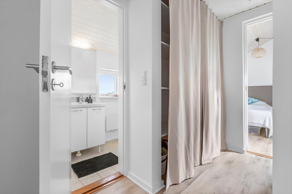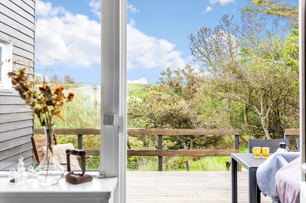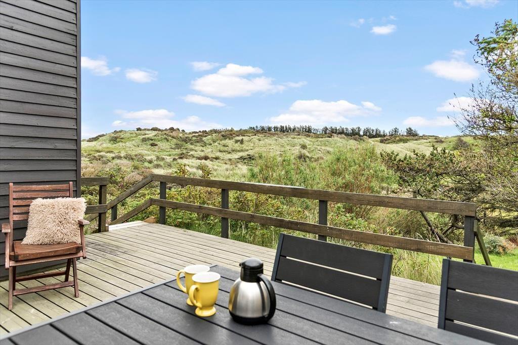 Det store terrassemiljø breder sig mod øst, syd og vest, så I får nemt ved at finde en god opholdsplads i solen det meste af dagen. På østsiden af huset kan I sidde dejligt ugeneret, mens I suger den flotte udsigt over indlandsklitterne til jer, og mod vest kan I se havet blinke til jer hen over sommerhustagene. Bemærk for øvrigt, at grunden er kuperet, så I skal tage en trappe op til huset og terrassen.