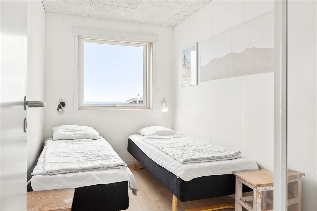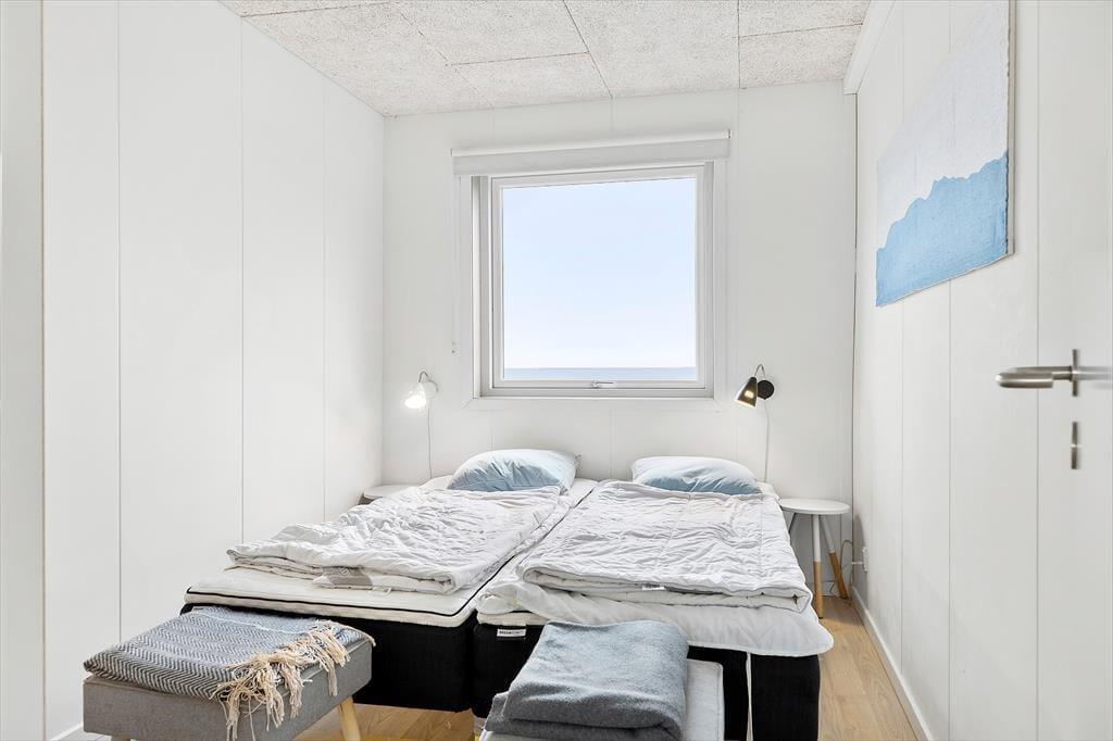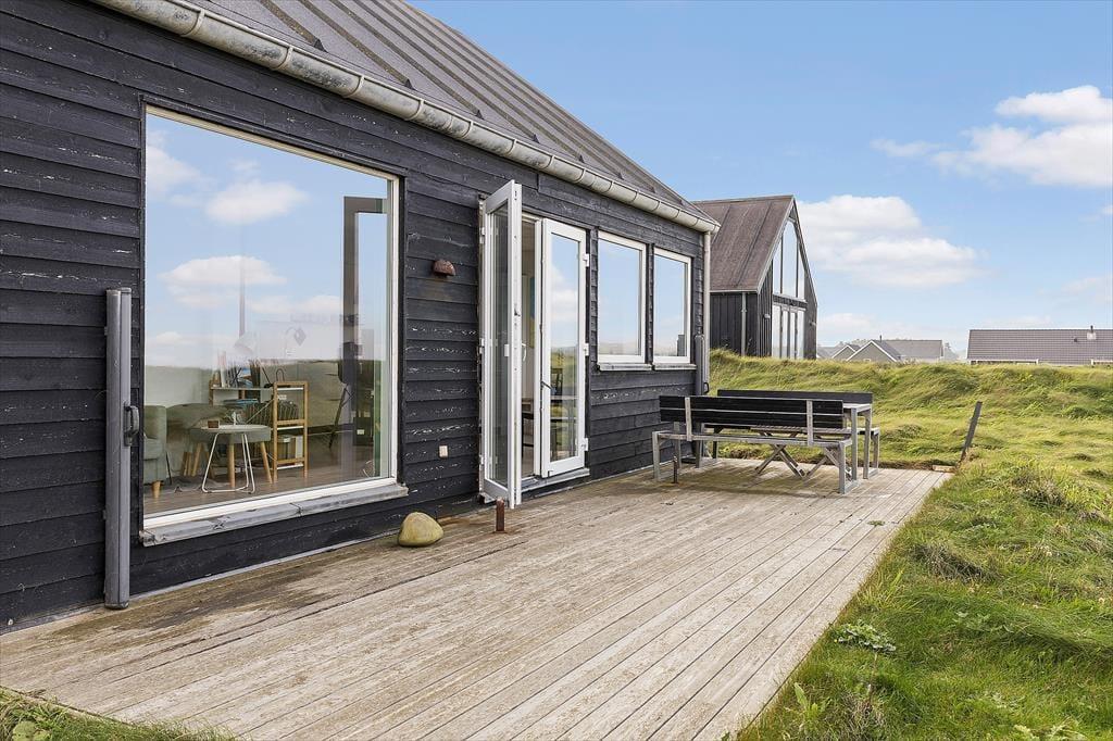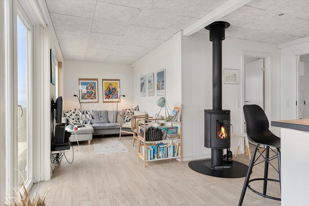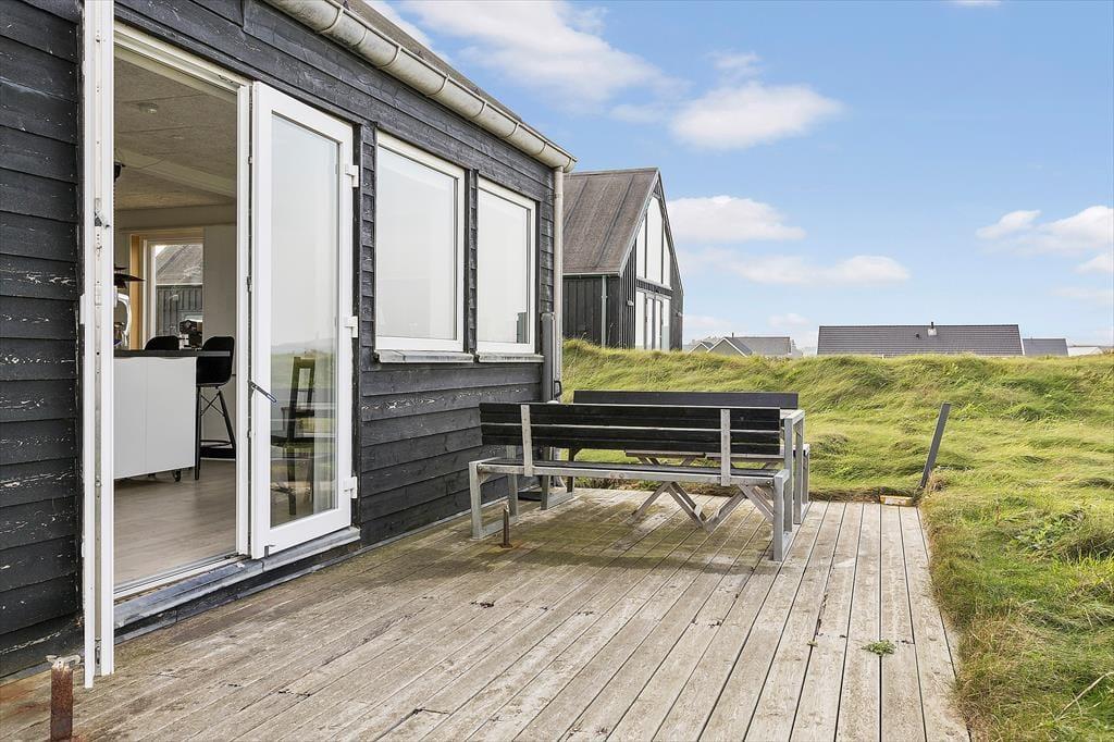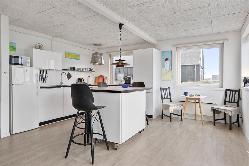 Det 70 m2 store sommerhus er opført i 2016 og præsenterer sig på køn vis med mørk træfacade og sadeltag. Inden døre er indretningen primært holdt i lyse farvetoner, og det moderne møblement er med til at gøre rummene ekstra indbydende. I det åbne køkken kan I slå jer ned med en kop formiddagskaffe eller en aperitif før aftensmaden, mens I nyder udsigten til Vesterhavet – her sidder I for øvrigt også tæt på brændeovnen, hvis det er vejr til at skrue op for varmen og hyggestemningen. Fra stuens sofakrog kan I også kigge lige ud på de fantastiske naturomgivelser, og det samme er muligt, når I slår øjnene op om morgenen på de to soveværelser. Værelserne har I alt sengepladser til fire personer, og fra entréen har I adgang til husets badeværelse, der er med bruseniche og kombivaskemaskine.