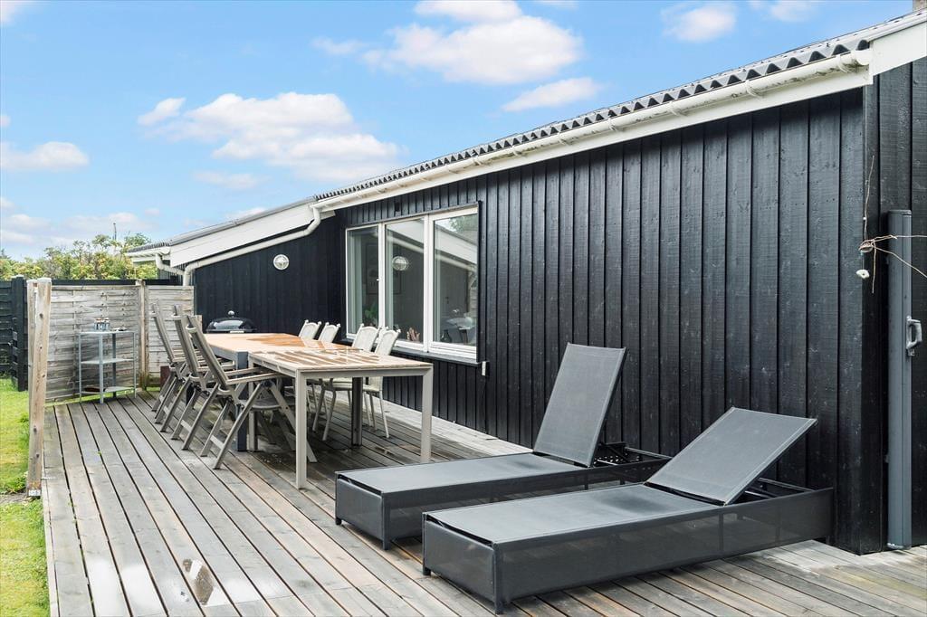 Sommerhusets 960 m2 store grund er godt skærmet af hybenbuske og plankeværk, og et hegn er med til at sørge for, at familiens hund ikke forvilder sig ud på vejen. Til børnene er der legestativ med rutsjebane og gynger, og græsplænen kan sagtens danne rammen om leg og boldspil for de yngste familiemedlemmer. Træterrassen er stor og solrig, og der er havemøbler, liggestole og en grill til rådighed, så I kan se frem til at nyde livet under åben himmel.