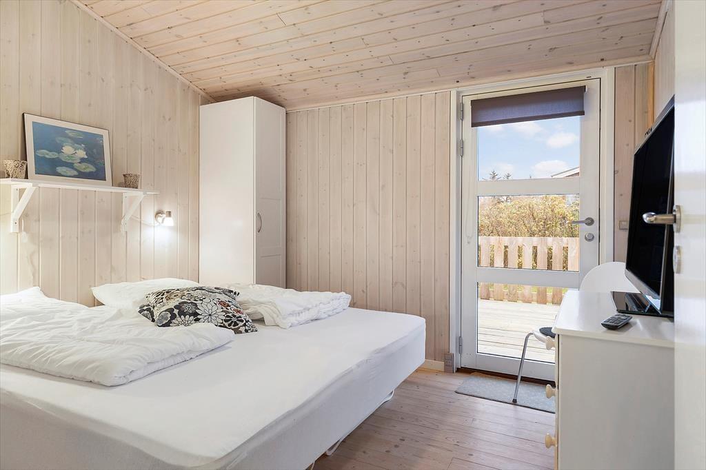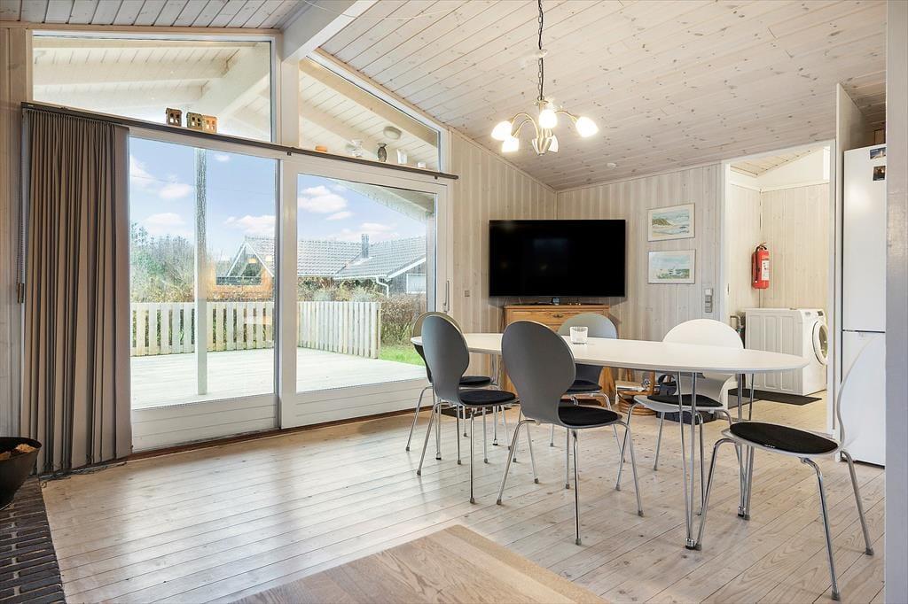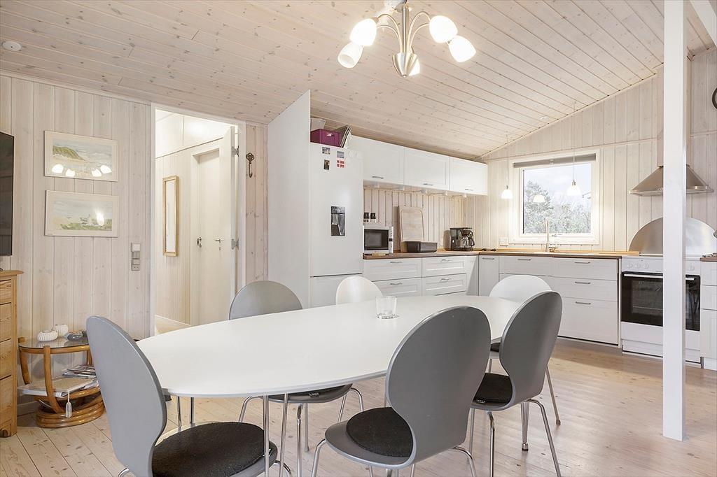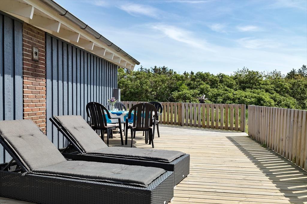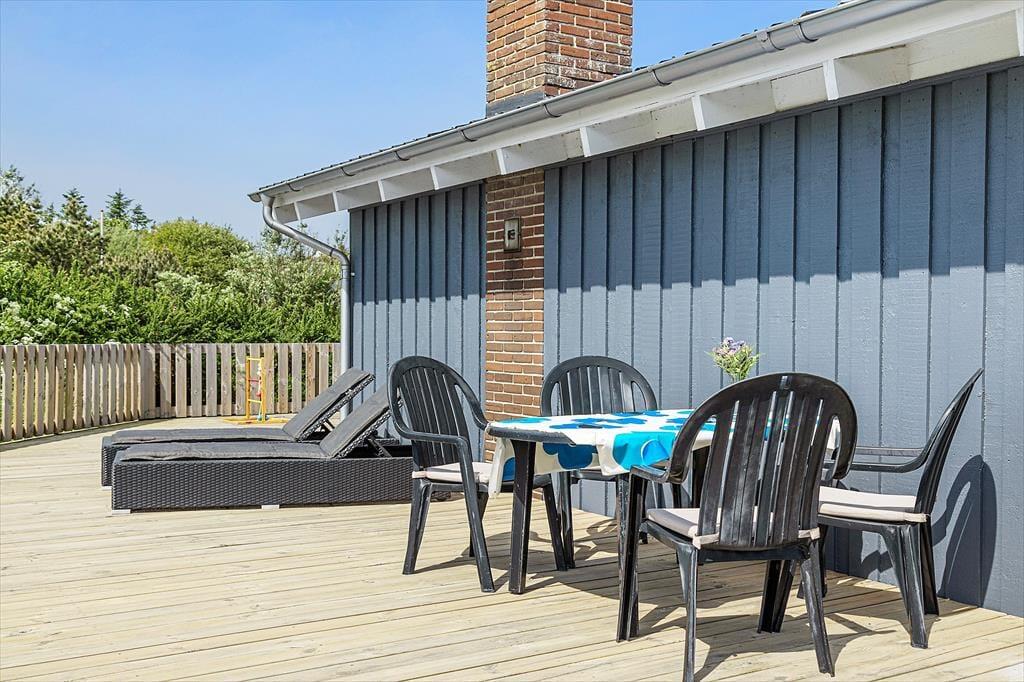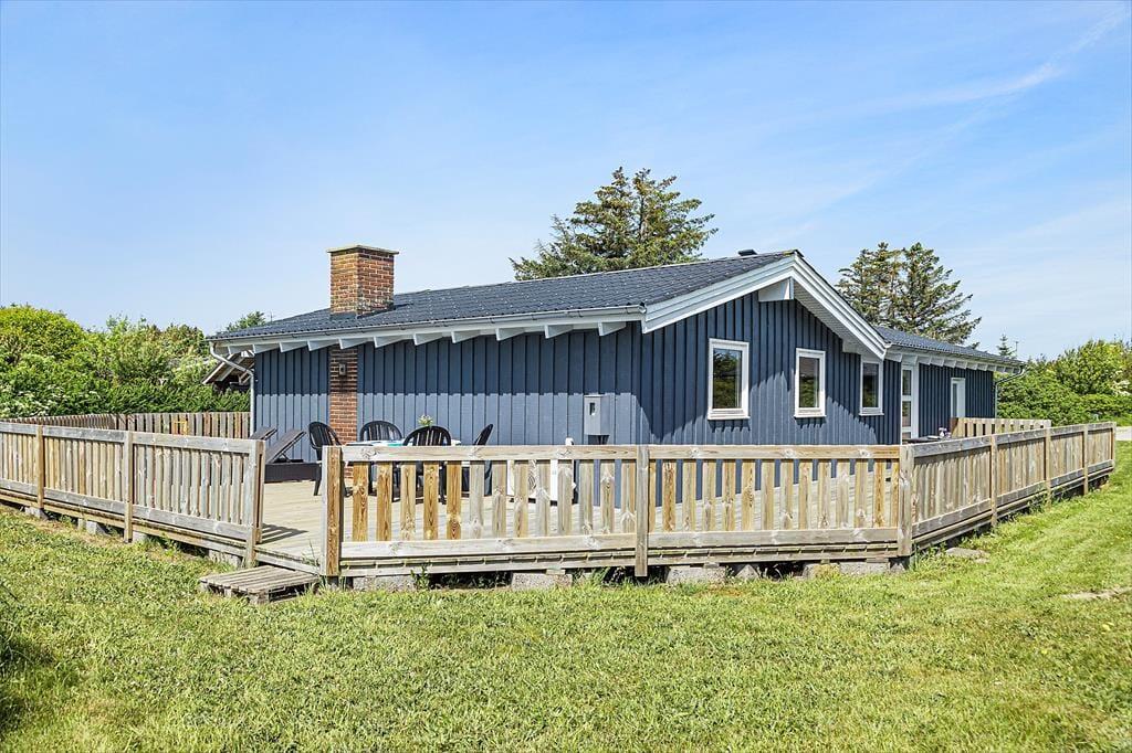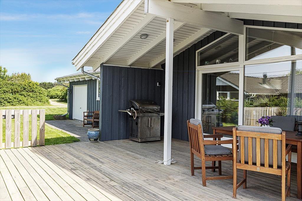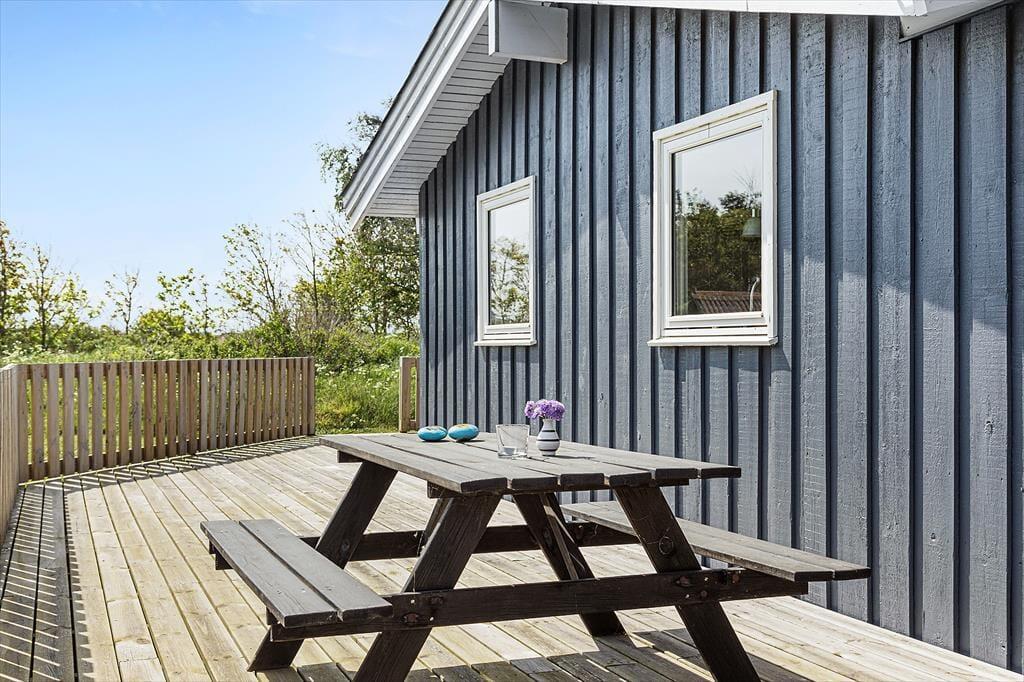 Sommerhusets store træterrasse breder sig mod både øst, syd og vest, så hvis I drømmer om at tilbringe en hel dag i langsomt tempo, behøver I højst at rykke havestolen i takt med solen. En del af terrassen er overdækket, og en grill er til rådighed til de dage, hvor I vil grille pølser eller majskolber til aftensmad.