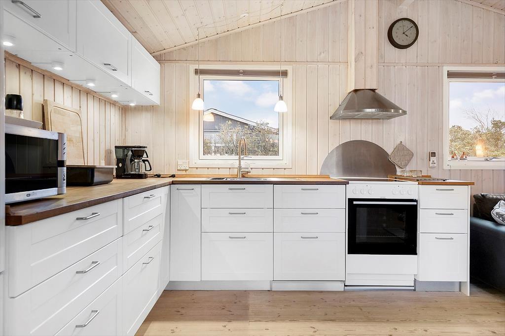 Der hviler en hyggelig og rar stemning over huset – ikke mindst i stuen, der er udstyret med indbygningspejs, varmepumpe og en komfortabel sofaafdeling. Et stort fladskærms-tv med Chromecast står klar, hvis I vil streame film og serier, og hvis I løber tør for snacks eller drikkevarer, er det nemt at smutte hen til det åbne køkken for at lave mere kaffe og finde chokoladen frem. Køkkenet er veludstyret, blandt andet med opvaskemaskine, og i entréen står der en vaskemaskine, hvis I får brug for at vaske tøj. Badeværelset er med bruseniche, og to af soveværelserne er med dobbeltseng, mens det tredje er med to enkeltsenge.