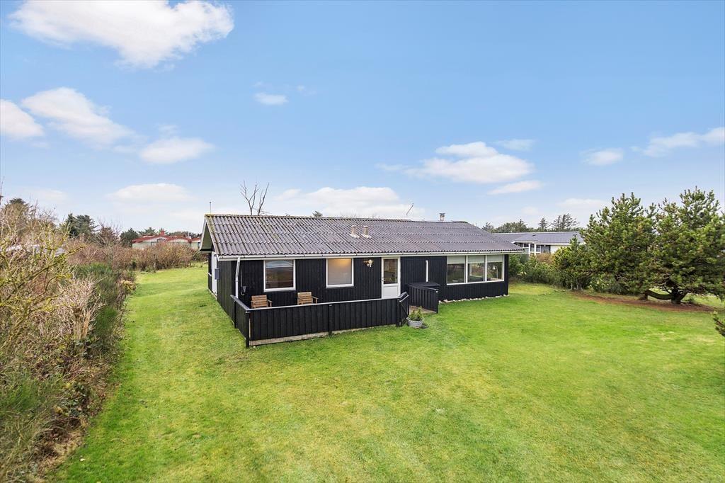 I sommerhusets have er der terrasser mod både øst og vest, så I behøver ikke at gå glip af solen uanset tidspunktet på dagen. En af terrasserne er delvist overdækket, og takket være hegnet kan I fint lade hunden gå frit, hvis den skal hygge sig sammen med de tobenede familiemedlemmer. Den dejlige have byder på en stor græsplæne, og det er nemt at finde læ i de fredelige, grønne omgivelser.