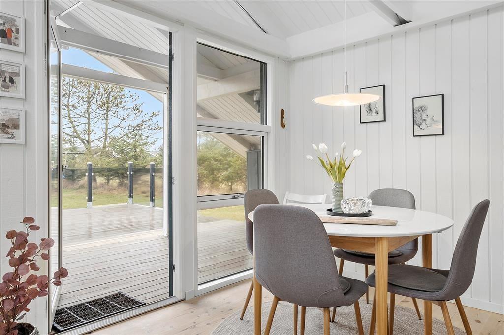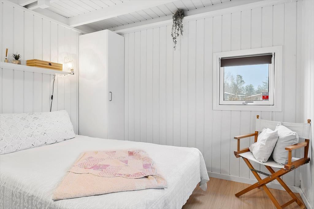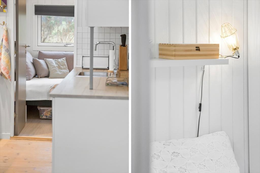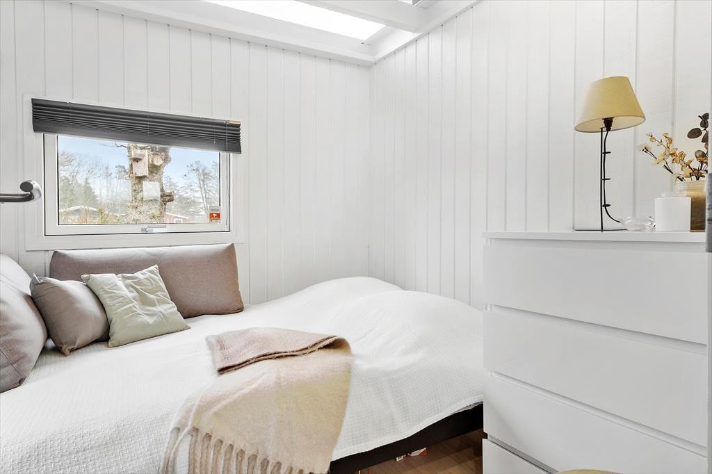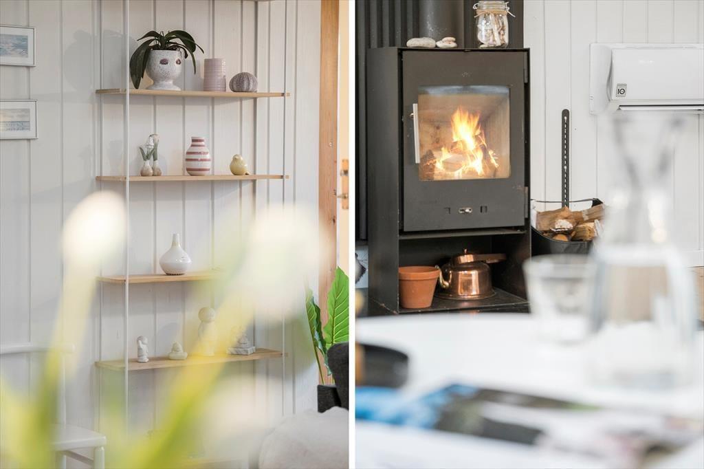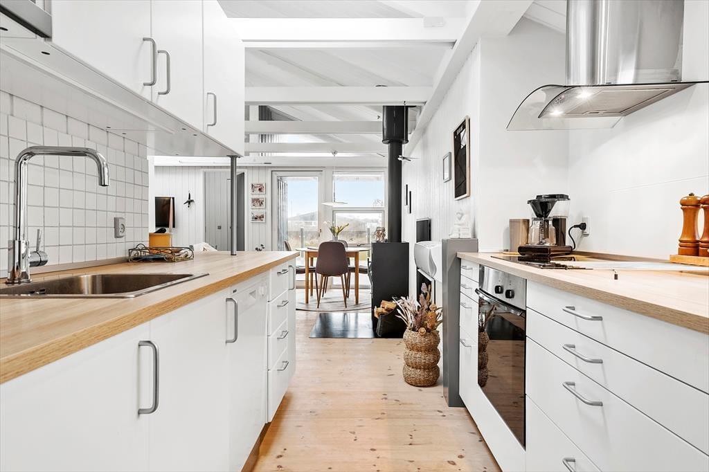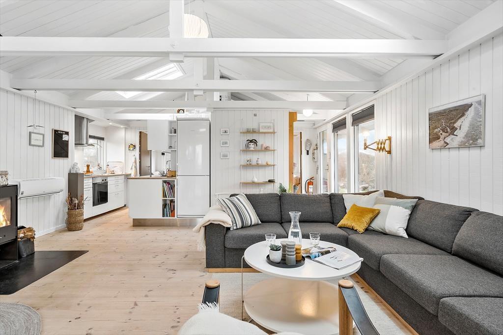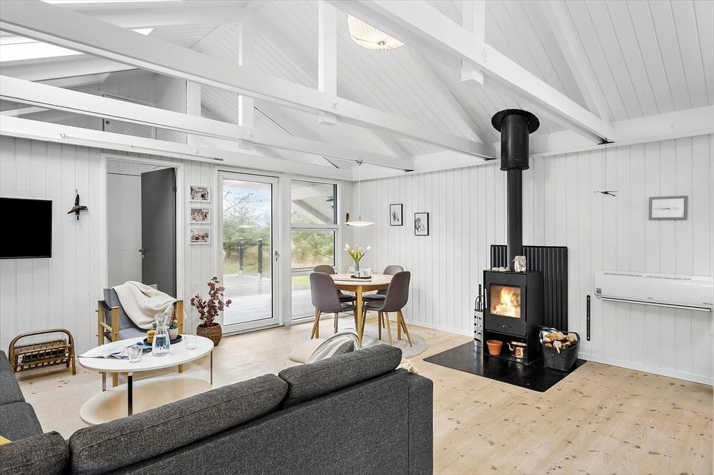 Sommerhuset er renoveret i 2023, så alle rum fremstår lyse og indbydende. Det gælder ikke mindst den dejlige stue, der har loft til kip, ovenlysvinduer og åben forbindelse til køkkenet – plus store vinduespartier med glasdøre, så det er nemt at smutte ud i det fri. Indbyder vejret mest til indendørs hygge, kan du tænde op i brændeovnen, inden du slænger dig i sofaen eller sætter dig godt til rette ved spisebordet sammen med familien. På sådan en feriedag kan I finde brætspillene frem fra feriebagagen, fordybe jer i de medbragte bøger eller bruge times vis på at kræse om maden i køkkenet – kort sagt alt det, der ikke nødvendigvis er tid til i løbet af en travl hverdag.