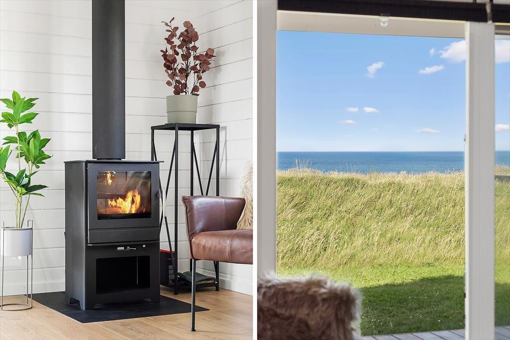Når du træder ind i sommerhuset, bliver du straks mødt af den lyse og moderne indretning, der giver en følelse af rummelighed og ro. De store vinduer sørger for, at lyset strømmer ind og åbner op for den fantastiske panoramaview over havet. Stuen er stilfuldt indrettet med komfortable møbler, der indbyder til afslapning – perfekt til både en rolig morgen med en varm kop kaffe eller en hyggelig aften foran flimmeren fra tv’et. Den åbne planløsning og de enkle, men elegante møbler gør det muligt at nyde både samvær og stilhed, alt efter hvad du har lyst til. Med en brændeovn til de kolde aftener og en indretning, der blander moderne design med varme elementer, føles dette sommerhus som et hjem væk fra hjemmet.