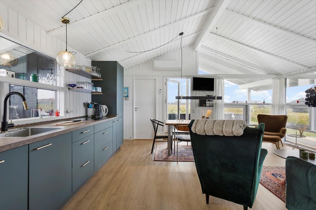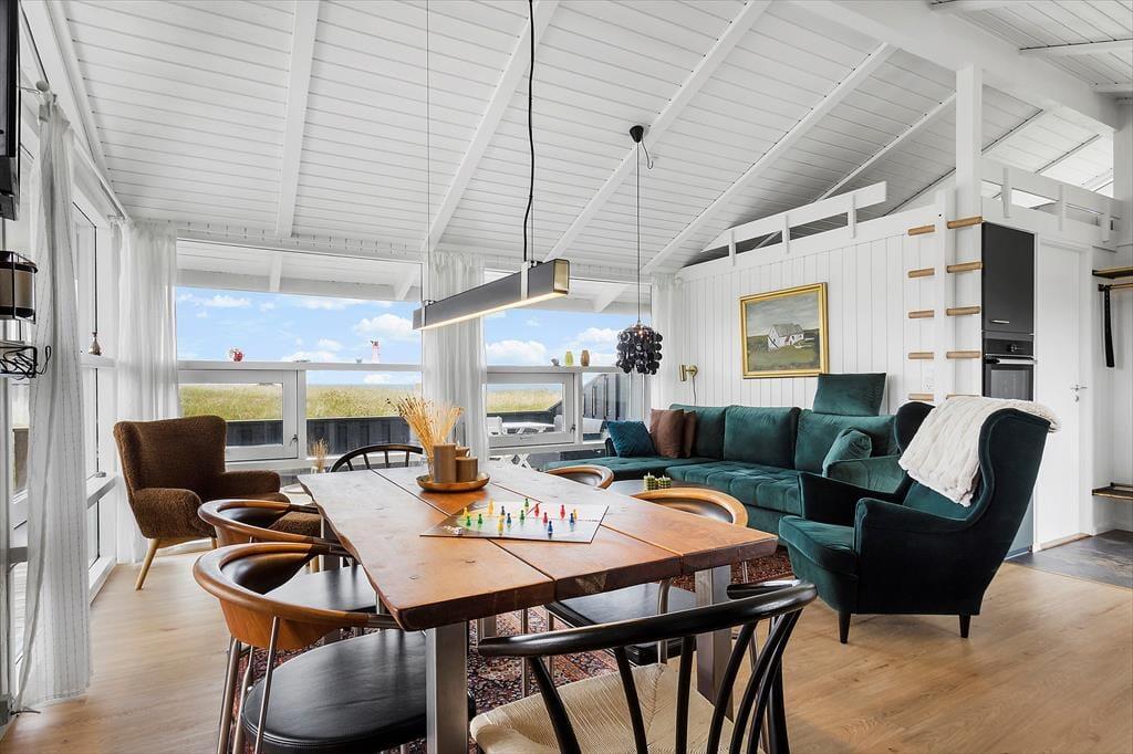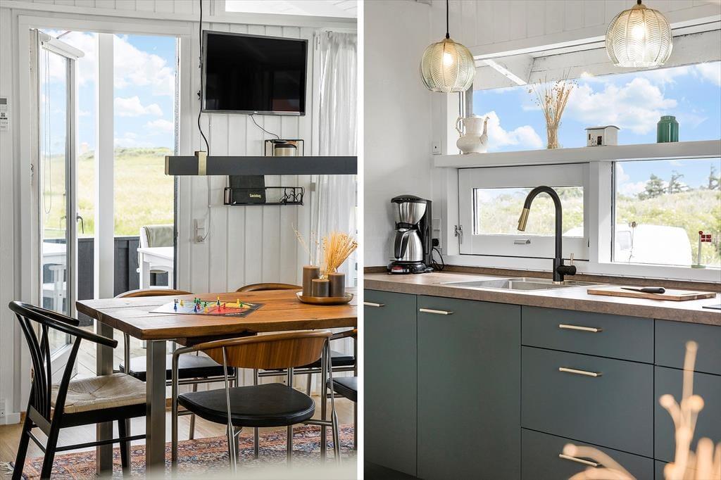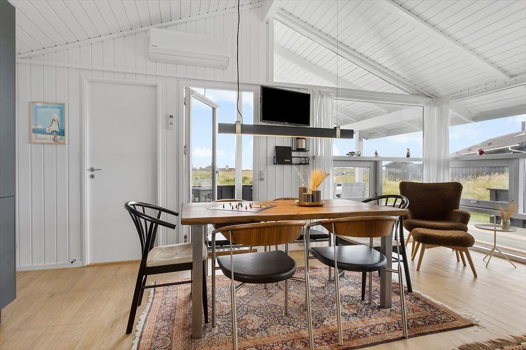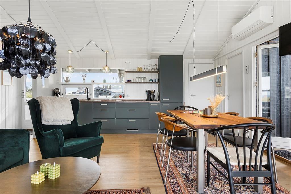 Sommerhuset var allerede et charmerende bekendtskab med loft til kip og træbeklædning, da det blev opført i 1985 i Lønstrups smukke natur, og det er blot blevet endnu hyggeligere og mere indbydende siden den vellykkede renovering i 2023. Alle rum frem står lyse og pæne, og særligt i opholdsafdelingen giver det mørke, elegante interiør en flot kontrast til de hvide vægge og det flotte landskab udenfor. Hvis du elsker at lave mad, kan du allerede nu begynde at glæde dig til at tilberede fisk eller andre lokale lækkerier i det åbne køkken. Er det ikke dig, der har madtjansen, kan du slænge dig i sofaen, mens du hyggesnakker med kokken eller fordyber dig i en god bog – eller falder i staver, mens du nyder havkigget.