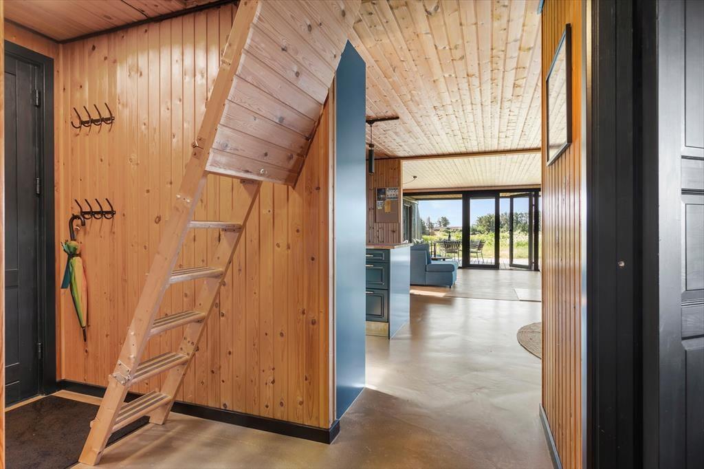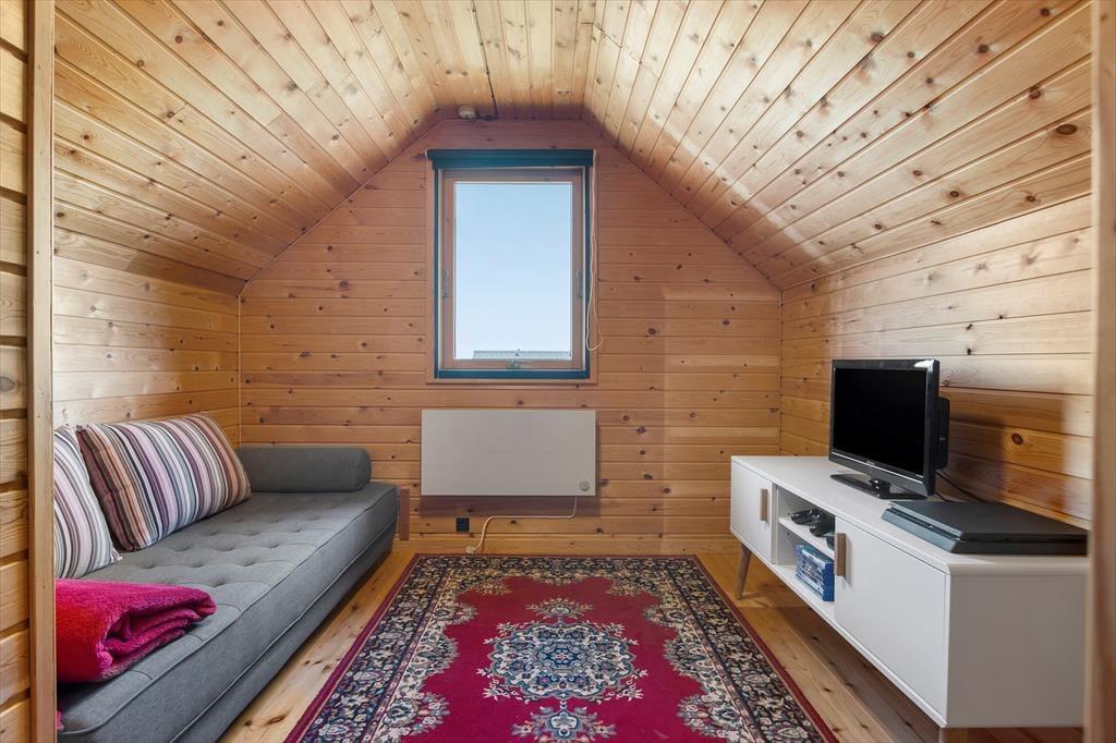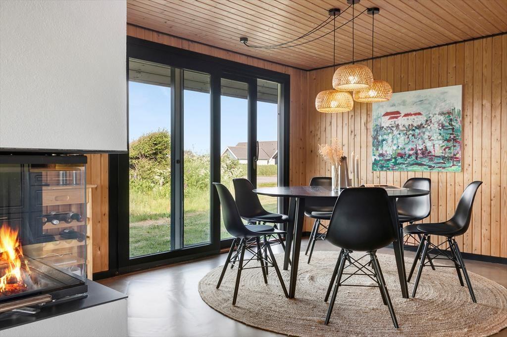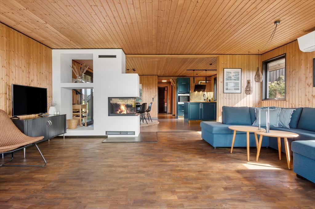 Det sortmalede træsommerhus har bevaret mange klassiske stiltræk inden døre, og ikke mindst de rustikke trælister på vægge og lofter er med til at skabe den helt rette fornemmelse i rummene: Her får du formfuldendte rammer til at slappe af og holde ferie! Efter moderniseringen er der samtidig noget elegant over stuen, hvilket blandt andet skyldes det åbne køkken og den flotte indbygningspejs – og så selvfølgelig også de store vinduer, der inviterer solen og naturen indenfor. Det lækre rainshower i badeværelsets bruseniche kan forvandle dit morgenbad til en wellness-oplevelse, og når det er sengetid, har du og dine kære tre komfortable soveværelser at fordele jer på. En hems er der også inden døre, og med TV og PlayStation fungerer den som en perfekt hyggekrog til familiens børn og unge.