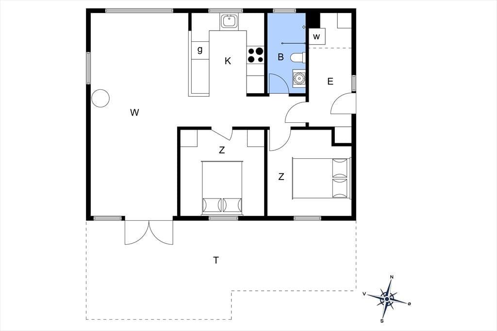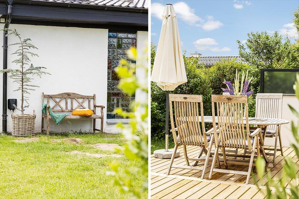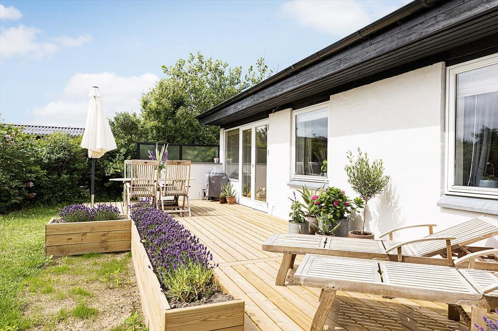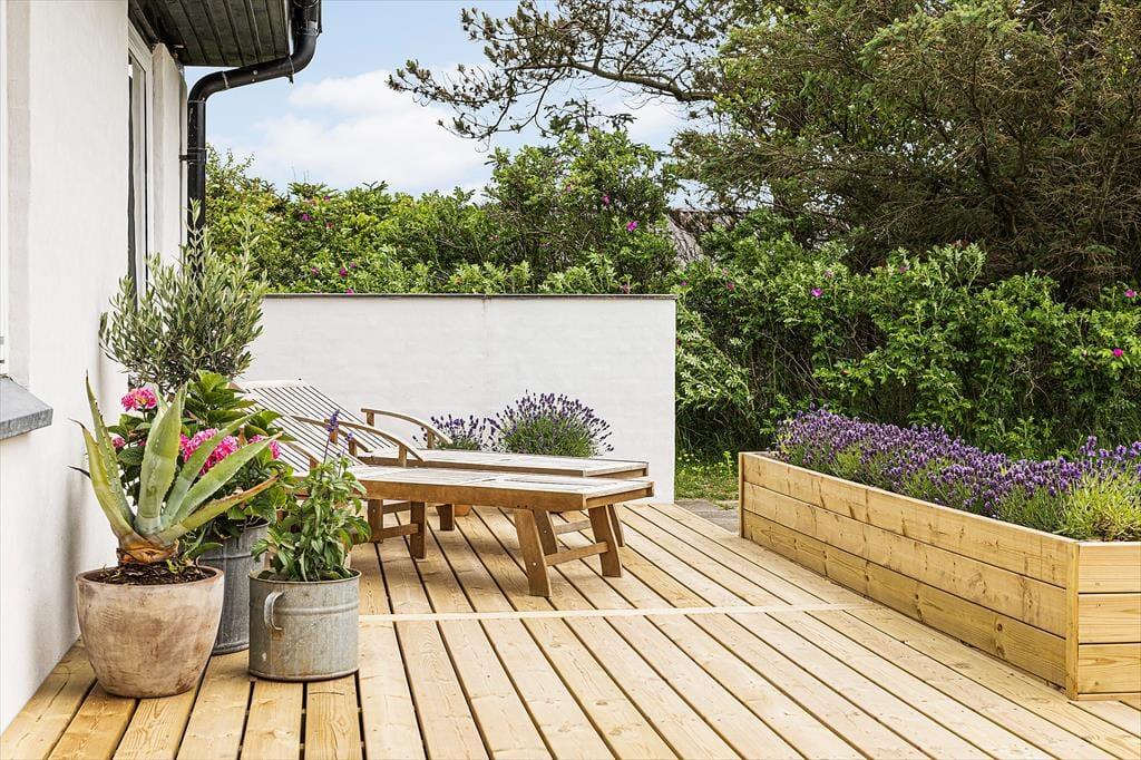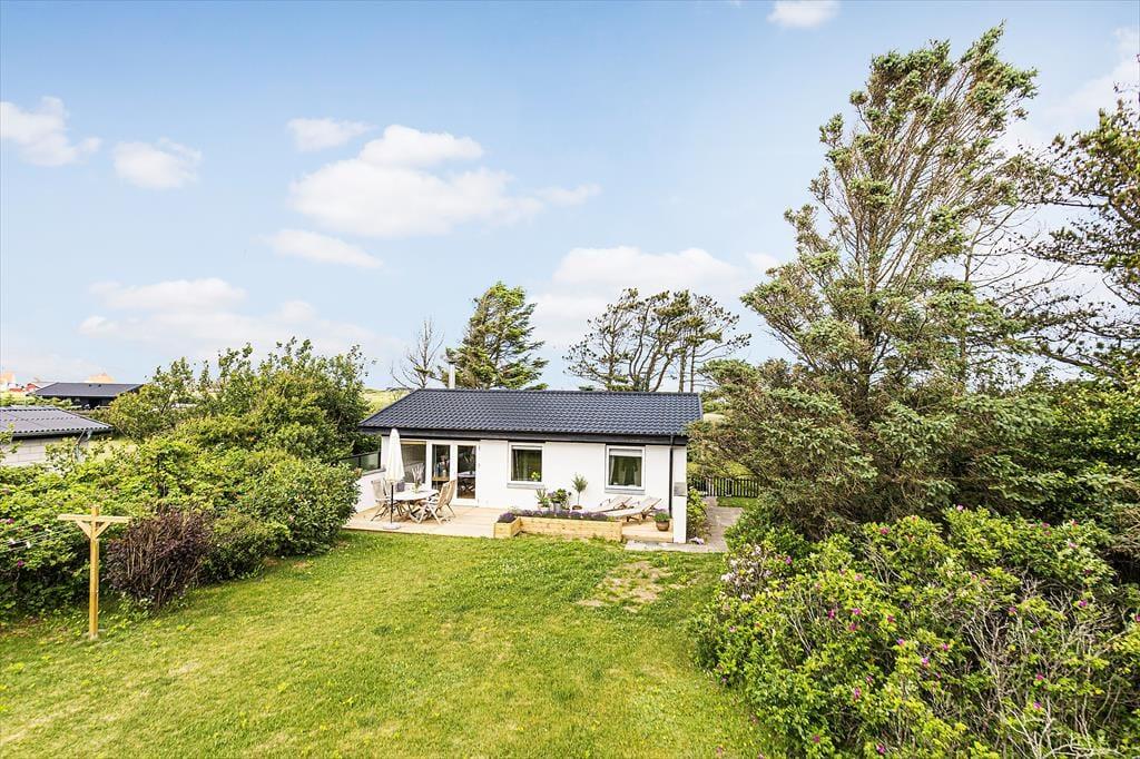 Grunden er dejligt stor med sine 1203 m2, og særligt den lukkede baghave kan hurtigt blive dit foretrukne sted at være, når der er sommerstemning i luften. Her kan både børn og hunde boltre sig på græsplænen, og hvis du selv har lyst til at deltage i legen, gælder det bare om at komme op af havestolen. Træterrassen er sydvendt, og med duften fra blomsterkasserne og udsigt til grundens hybenbuske er idyllen helt i top, når du slænger dig på en solseng eller dækker op til frokost i parasollens skygge. Om aftenen er der mulighed for at grille – hvis du ikke smutter ned i Lønstrup by for at spise på café eller restaurant.
