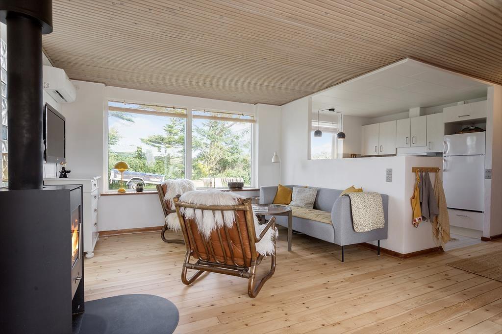 Sommerhuset har ligget her på Møllebakkevej 30 siden 1968, og i 2024 er det blevet grundigt renoveret, så det fremstår lyst og indbydende. I indretningen er der gjort brug af både moderne design og retromøbler, og med naturmaterialer og kønne farvetoner emmer rummene af hygge og afslapning. En langstrakt eftermiddag i sofaafdelingen nær den knitrende brændeovn er perfekt, hvis du drømmer om at komme videre med strikkeprojektet eller slappe af med en god bog – og hvis du glæder dig til at have god tid til at kræse om maden, kan du allerede nu begynde at se frem til at gå i gang med at kokkerere i den åbne køkkenafdeling. Med to soveværelser og et brusebadeværelse passer planløsningen godt til fire personer, og en hund er for øvrigt også velkommen, hvis du skal have din firbenede ven med på ferie.