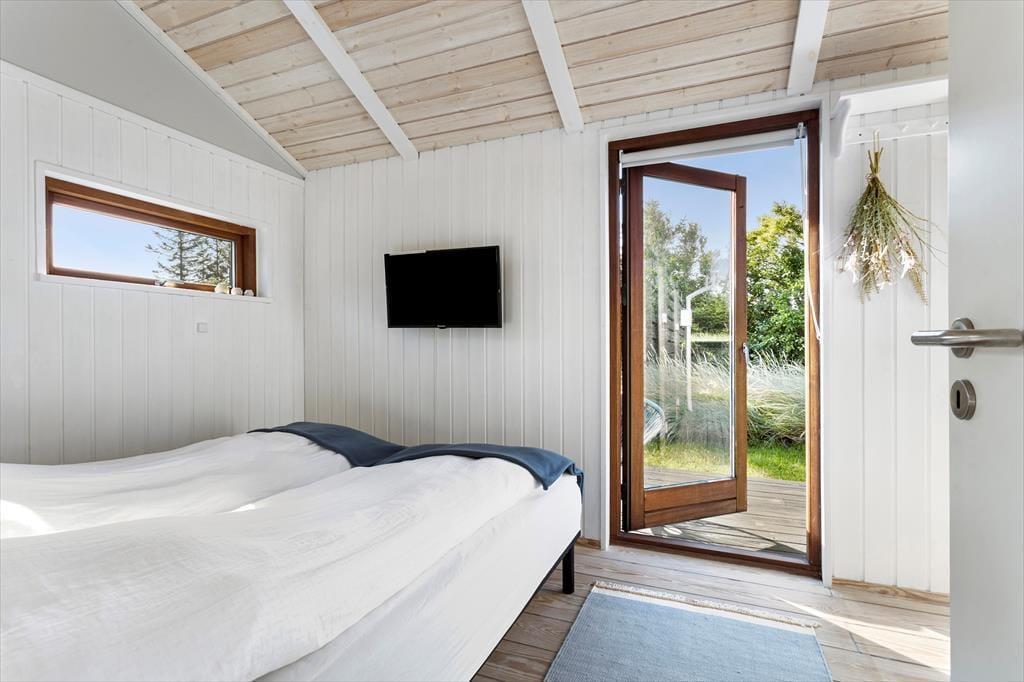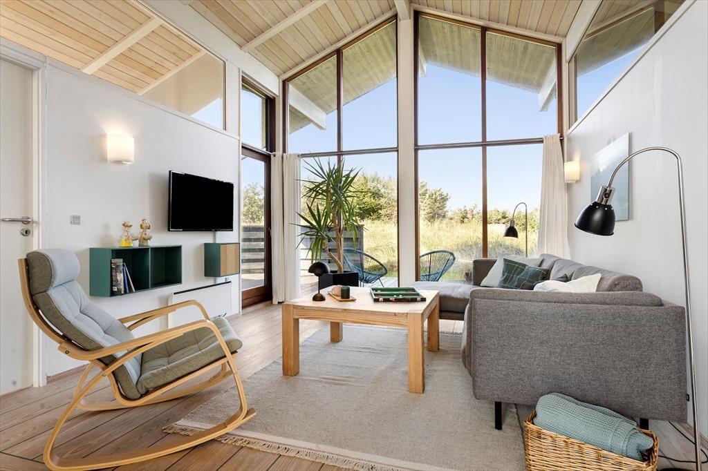 Med store vinduer, loft til kip og lyse farvetoner er der en herlig atmosfære inden døre, og du kan hurtigt føle dig hjemme i de velindrettede rum. For eksempel er det herligt at kunne slænge sig i stuens sofaafdeling, når der er ild i brændeovnen og varm kaffe i koppen – hvis det altså ikke er badeværelsets spabad og sauna, der sørger for at få dig helt ned i tempo. Det åbne køkken er en god arbejdsstation, og her kan I sagtens være flere om at stå for madlavningen, mens spisebordet er det helt rette sted at mødes, når måltidet står klar. Soveværelser er der tre af, så det er muligt at være op til seks personer, der nyder ferien sammen.