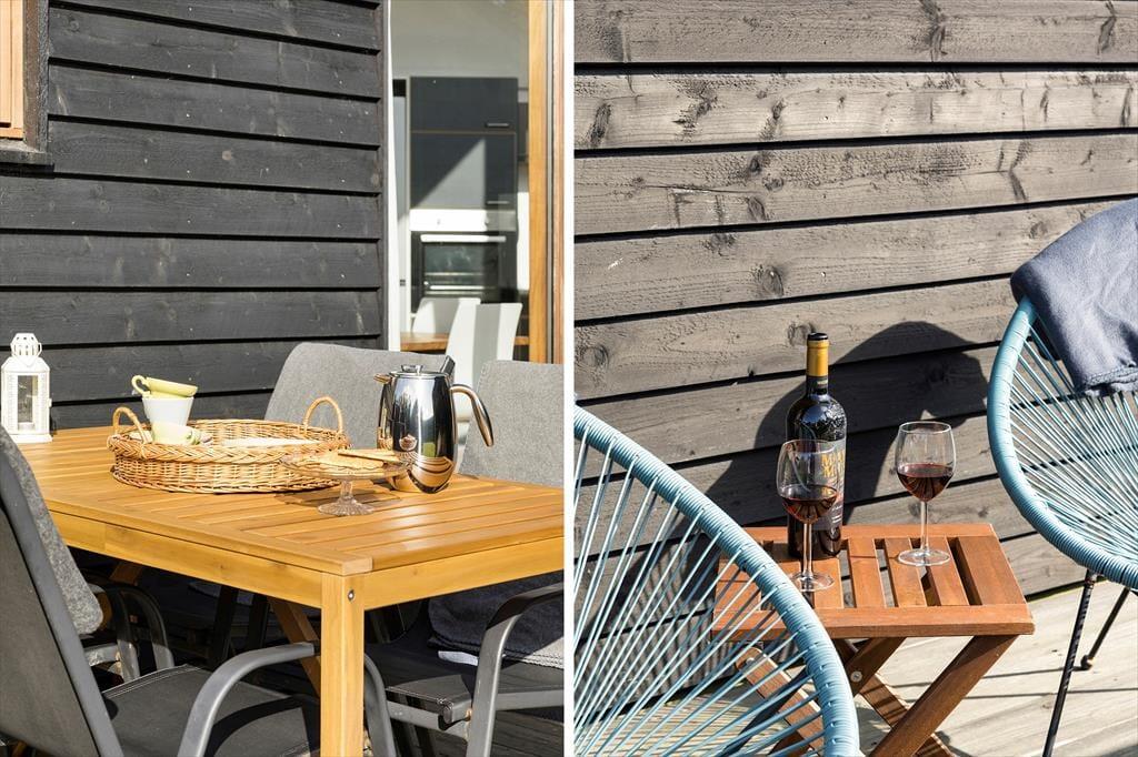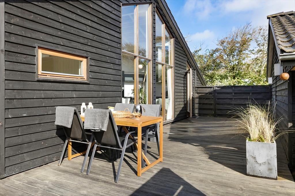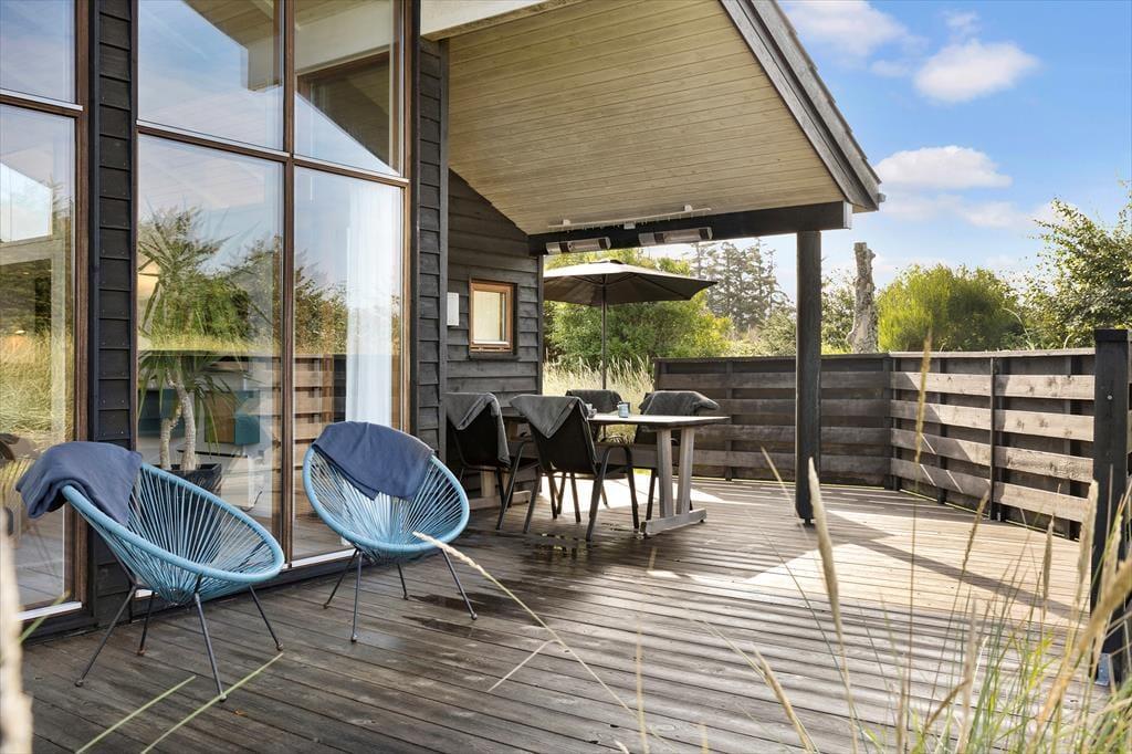 Fra både opholdsafdelingen og de tre soveværelser er der direkte adgang til det lækre terrassemiljø, der breder sig rundt om det meste af sommerhuset. Vil du ud i den friske luft for at strække kroppen, kan du med andre ord gøre det, så snart du står ud af sengen, og det er selvfølgelig også oplagt at flytte morgenmaden og dagens øvrige måltider ud i det fri, når vejrguderne er i det milde hjørne. En del af terrassen er afskærmet til tre sider, så her er der næsten altid læ, og hele det udendørs opholdsmiljø er for øvrigt meget ugeneret.
