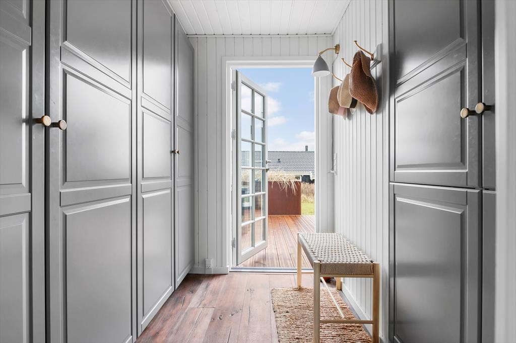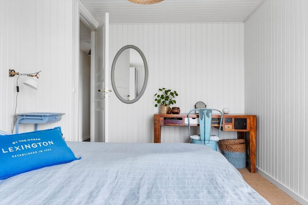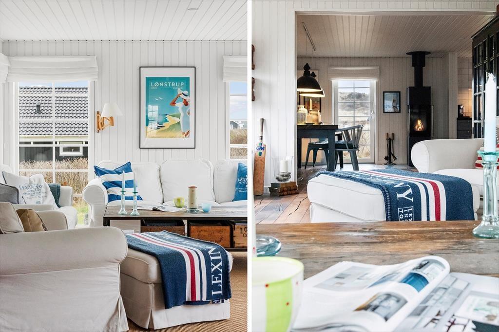 Sommerhuset imponerer fra første skridt ind ad døren med sin unikke kombination af badehus-stil og industrielle New Englænder-detaljer. Vinduespartier lukker lyset ind og giver en betagende udsigt til havet og de charmerende gamle sommerhuse. De stilrene møbler tilfører en lækker, moderne afslappende atmosfære. Stuen er rummelig og indbyder til hyggelige aftener foran brændeovnen, mens det åbne køkken gør det let at være sammen om madlavningen. Her er skabt en perfekt balance mellem komfort og stil, så du kan slappe af i smukke omgivelser.