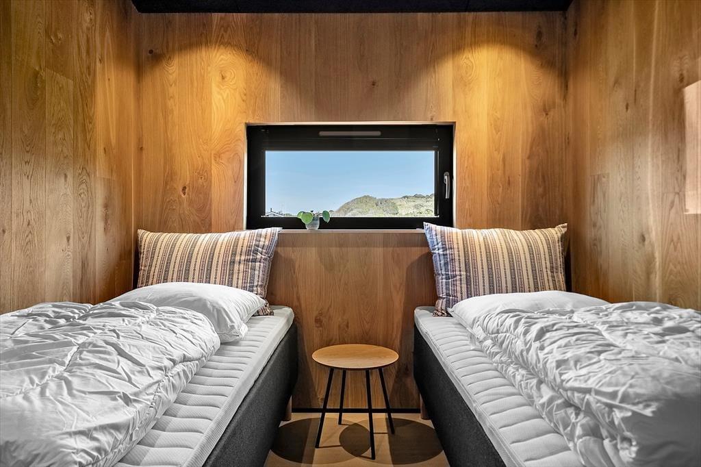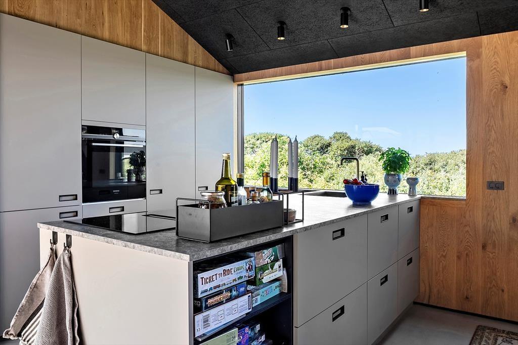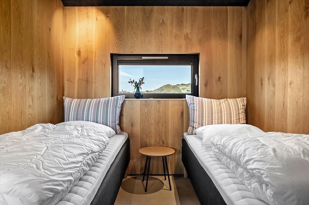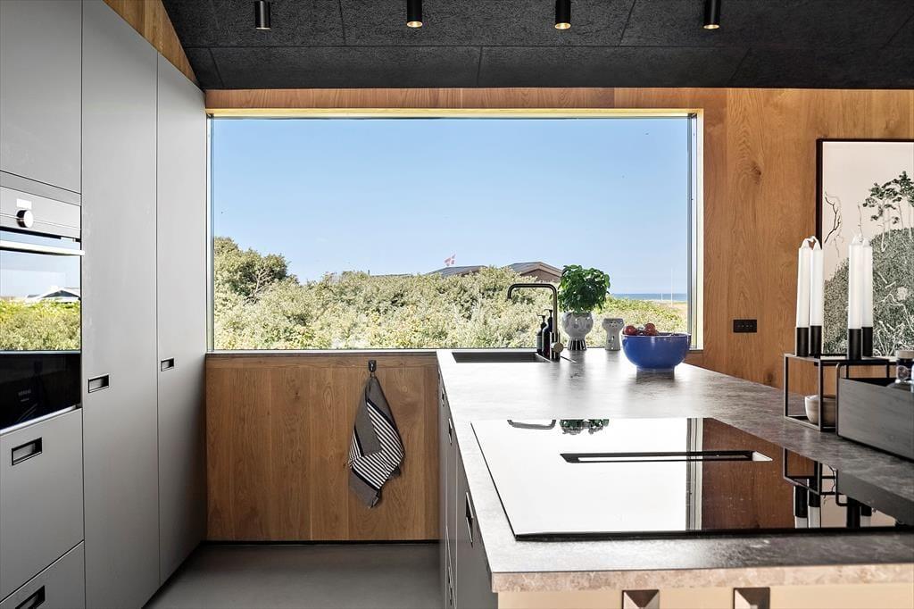 Indretningen af sommerhuset er gennemført med materialer af højeste kvalitet og en stil, der emmer af luksus og elegance. De store vinduer lader havblikket være en konstant del af opholdsrummet, og det stilrene interiør skaber en harmonisk atmosfære. Huset er indrettet i flere niveauer, hvilket giver en dynamisk og rummelig følelse. I den åbne opholdsafdeling forenes stue, spisestue og køkken i et indbydende rum, hvor brændeovnen tilføjer ekstra hygge. Køkkenet er designet til madelskeren med moderne faciliteter, der gør det til en fornøjelse at tilberede friske råvarer fra lokale producenter. De smukke soveværelser byder på komfortable senge og en rolig atmosfære, så du kan vågne veludhvilet op til lyden af Vesterhavets brusen.