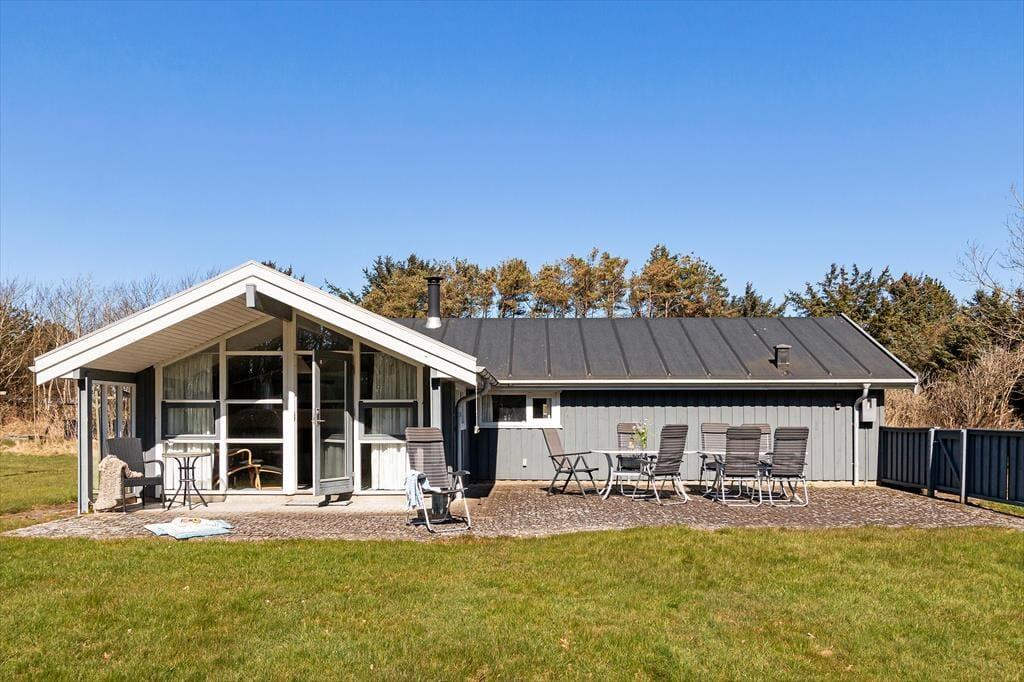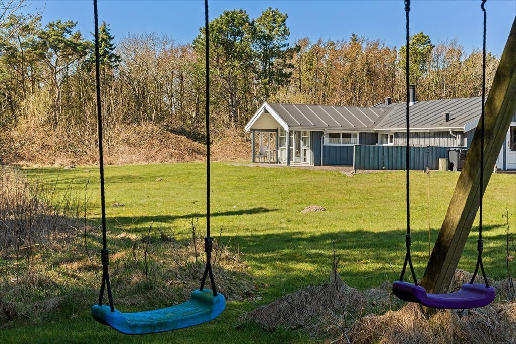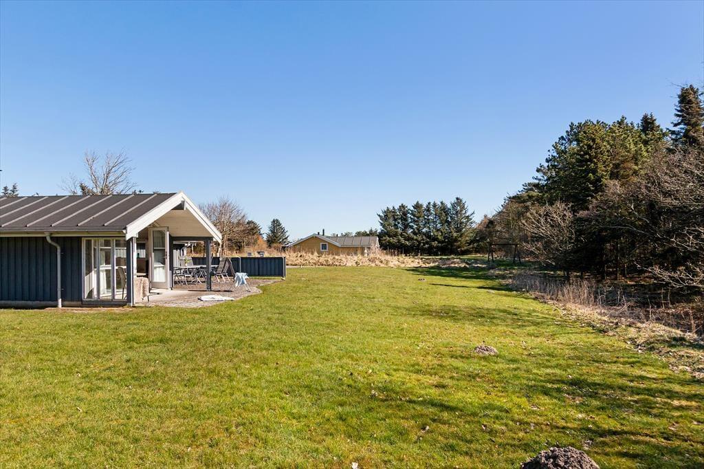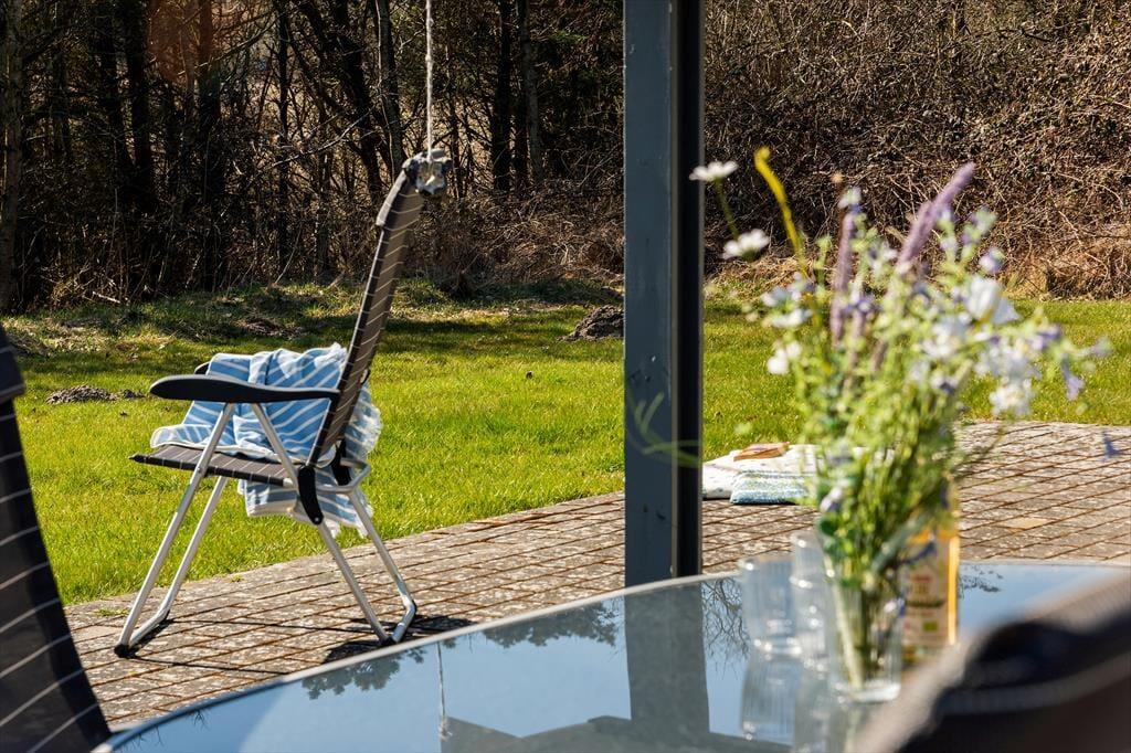 Udenfor venter en skøn naturgrund med masser af luft og plads – perfekt til både leg, afslapning og små gåture i det grønne. Haven omkranser huset som en lille fredelig oase, hvor fuglefløjt og vinden i træerne sætter scenen for uforstyrret feriestemning. Her er der rig mulighed for at finde sin yndlingsplads, uanset om du er til sol eller skygge. På de gode terrassearealer kan du nyde dagens måltider under åben himmel, læne dig tilbage i en liggestol med en bog eller lade børnene lege på græsset, mens du har udsigt til det hele. Når solen varmer, og himlen er blå, er der ikke meget, der slår et køligt glas og bare tæer i græsset. Og selv når aftenen falder på, kan du tænde op i grillen, finde tæppet frem og fortsætte hyggen i det fri – måske under et tæppe af stjerner.
