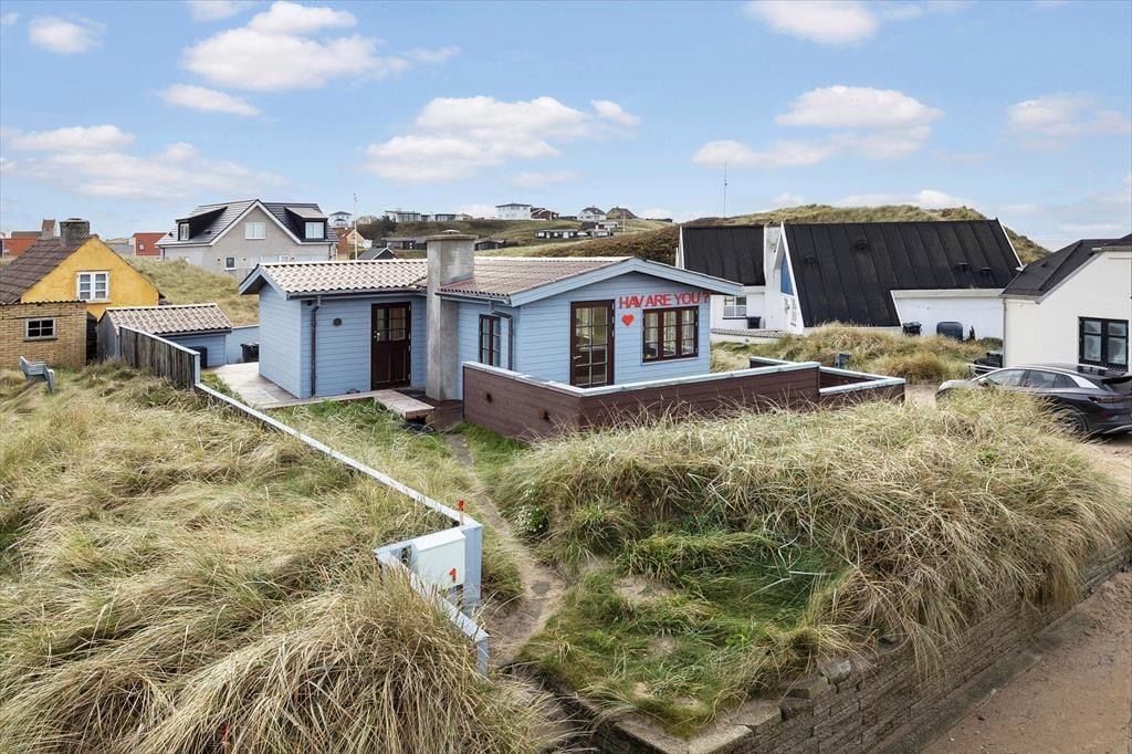 Hyggeligt feriehus i klitterne med byliv i baghaven og udsigt ud over havet. Her er der mulighed for at læse og skrive, grille på terrassen, morgenmade i havet og slutte dagen af i sauna med udsigt. Her er plads til en lille familie eller dig og din eneste ene.