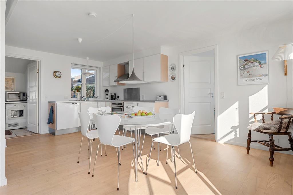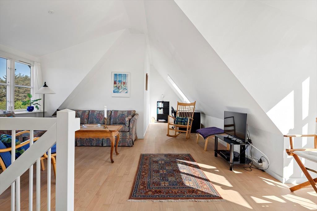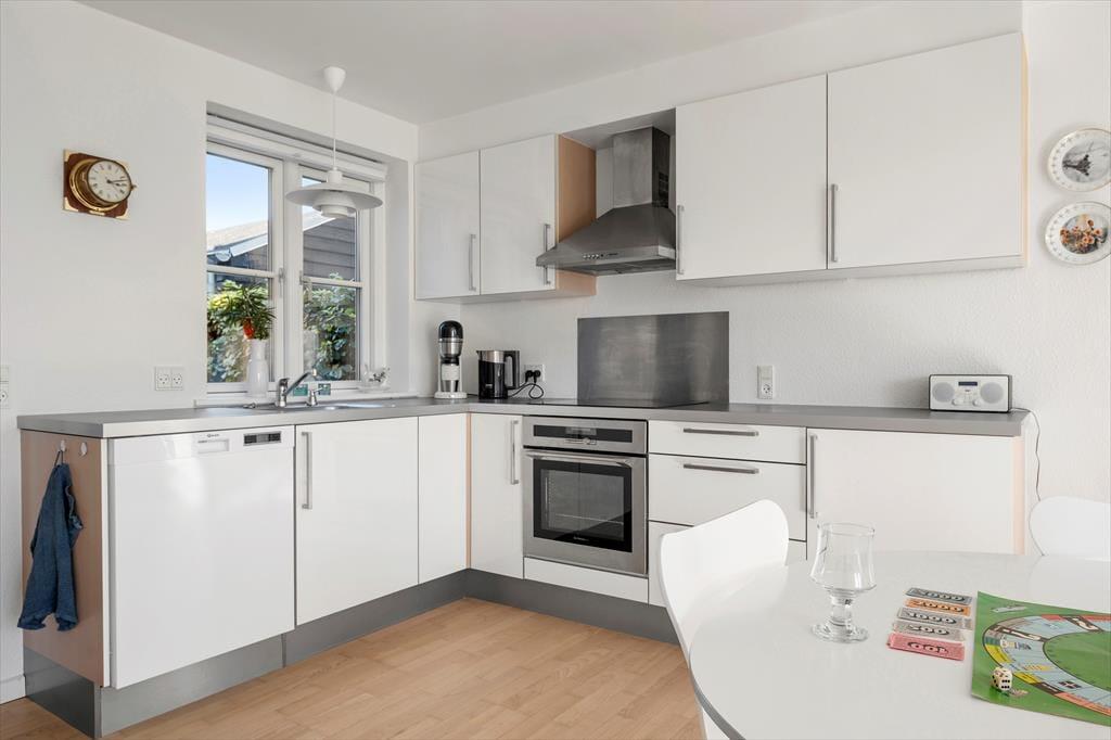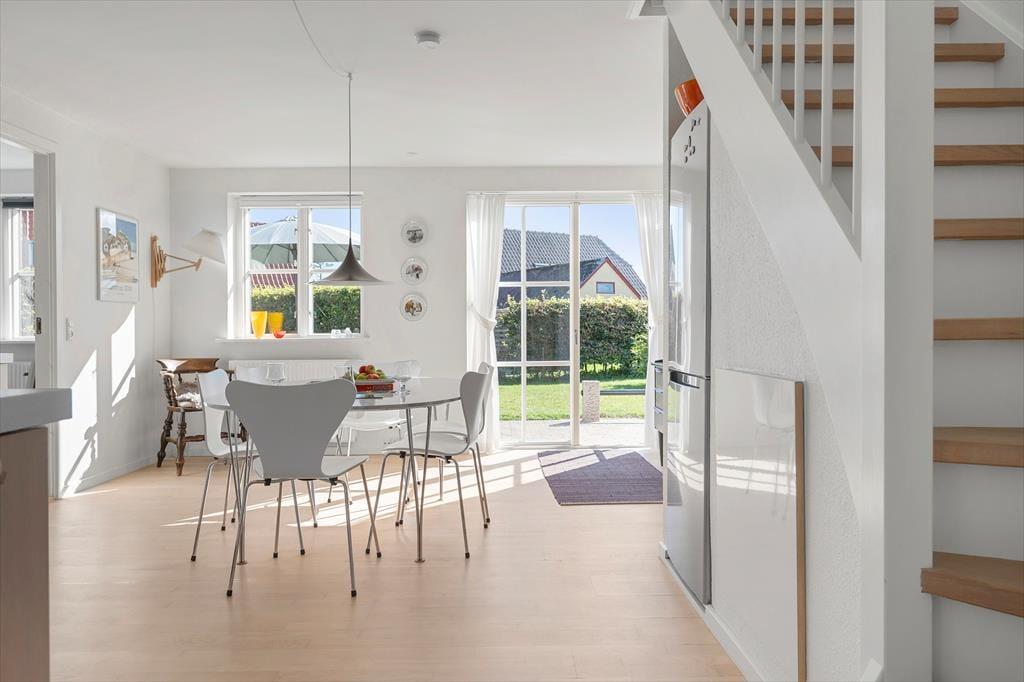 Inden døre møder du en indretning, der på én gang føles enkel og indbydende. Rækkehuset er i to plan, hvilket giver en rar fornemmelse af plads og privatliv. I stueplan ligger opholdsrummet, hvor køkken og stue bindes sammen på en måde, der gør det nemt at være sammen – også når der kokkereres. Lyse vægge og et pænt, tidløst interiør skaber en let og hjemlig atmosfære, der straks indbyder til afslapning. Efter en dag ved stranden kan du sætte dig til rette i sofaen med en bog eller måske et spil med familien, mens du lader feriestemningen sænke sig. Huset rummer et stort og velholdt badeværelse, hvor du nemt kan skylle dagens saltvand og sand af dig, inden hyggen fortsætter indenfor.