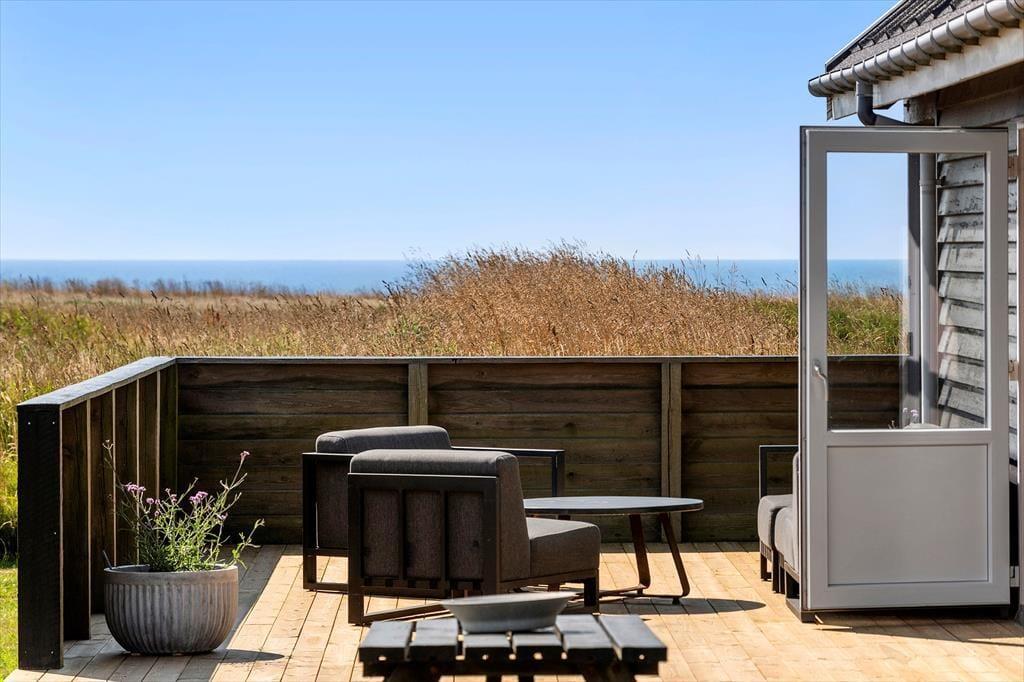 Udenfor venter en stor, grøn have med plads til både leg og afslapning. Måske har børnene lyst til at løbe rundt og spille bold, mens de voksne nyder solen i liggestolene? Terrassen er rummelig og veldisponeret, så du nemt kan finde din favoritplads – hvad enten du foretrækker at mærke solens varme eller bare slappe af med en god bog i fred og ro. Med udsigten til havet som kulisse kan I lade feriedagene flyde i et langsomt tempo og måske slutte dagen af med et glas vin og kig til solnedgangen fra terrassen. Det er ferieidyl på første række – og når mørket falder på, er det svært ikke at glæde sig til endnu en dag her.