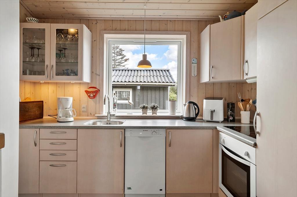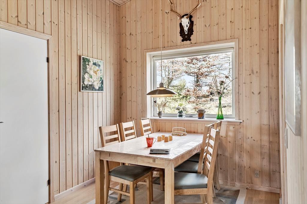 Der er noget særligt rart over at træde indenfor i et sommerhus, hvor lyset strømmer ind, og hyggen mærkes med det samme – og netop sådan en følelse møder dig her på Krattet 9. Indretningen er både lys og venlig, og det indbydende opholdsrum bliver hurtigt familiens samlingspunkt. Når solen skinner udenfor, føles det næsten, som om den følger med ind gennem de store vinduer, og på kølige aftener kan I trække jer sammen i sofaen med et brætspil, en god film eller en stille stund med en bog. Den åbne planløsning mellem stue og køkken gør det let at være sammen på kryds og tværs, og du kan nemt forestille dig snakken flyde, mens der bliver lavet mad og grinet om dagens oplevelser. Huset er indrettet, så det føles både hjemligt og ferieagtigt på den helt rigtige måde – det er nemt at finde sig til rette.