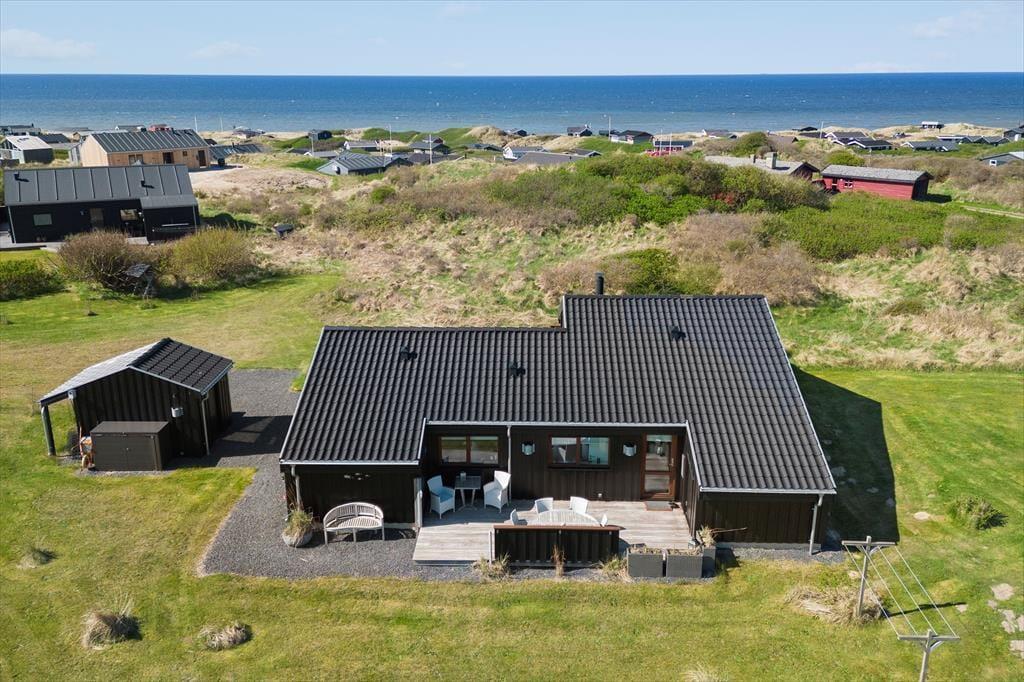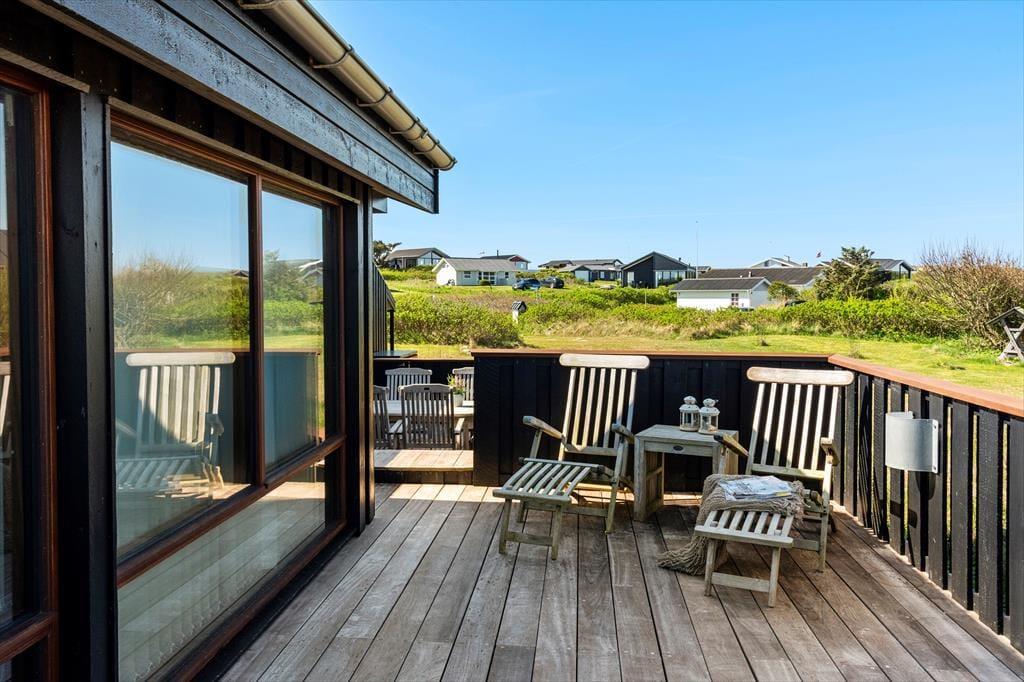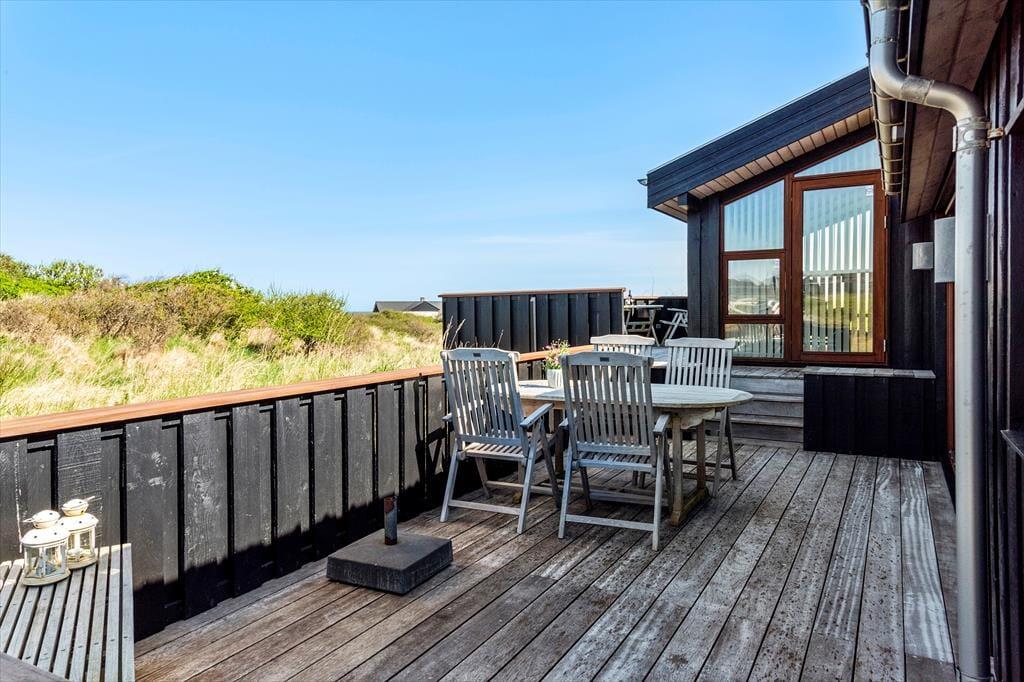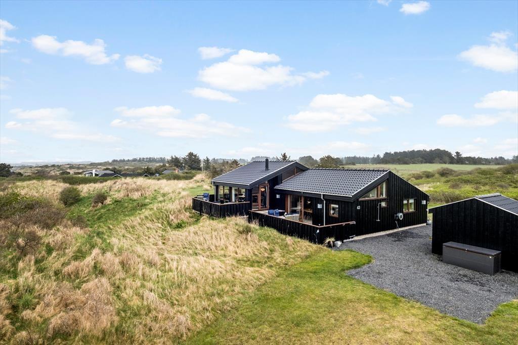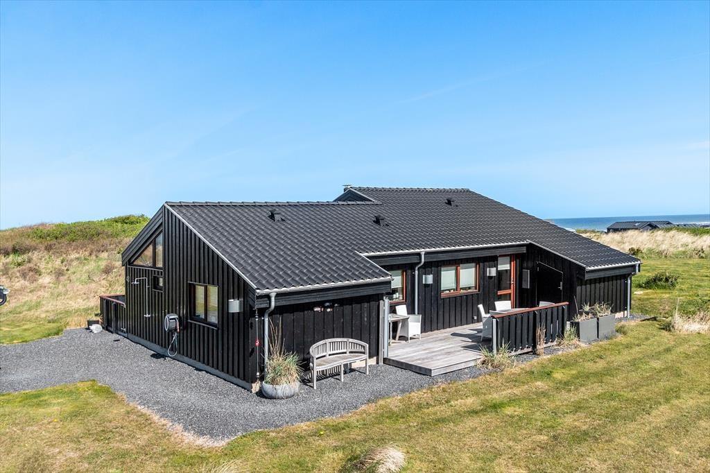 Udenfor venter et skønt terrassemiljø, som næsten føles som en naturlig forlængelse af huset. Her er anlagt flere terrasser i forskellige niveauer, og det giver dig mulighed for at finde præcis det sted, der passer til dagens stemning – om det er morgensolen på den ene side af huset eller den gyldne aftensol på den anden. Og så er der udsigten: Fra den høje beliggenhed kan du skue ud over det åbne landskab og det dybblå Vesterhav, der skifter udtryk med vejret og lyset. Terrasserne indbyder til afslappede feriedage med bøger, grillhygge og gode samtaler, og på stille dage kan du høre fuglene i klitterne og mærke vinden kærtegne huden. Det er den slags dage, der sætter sig fast i hukommelsen som små glimt af ferielykke.