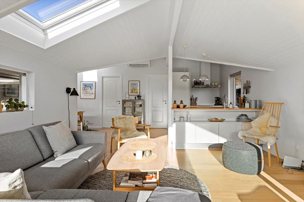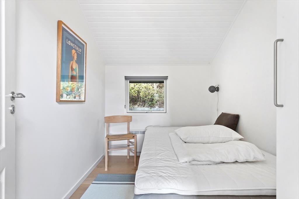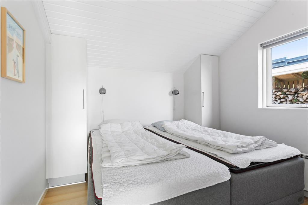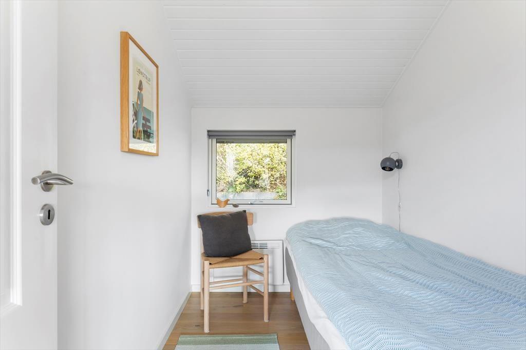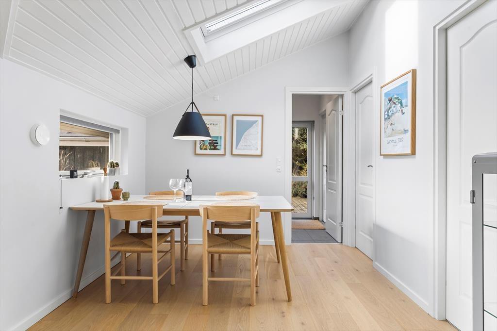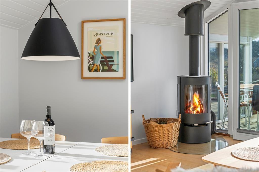 Indenfor mødes du af en hyggelig og indbydende atmosfære, hvor den varme brændeovn står klar til at sprede varme på kølige aftener. Her kan I samles omkring stuen og nyde hyggelige stunder med familie eller venner, mens flammerne kaster sit bløde lys. Indretningen er klassisk sommerhusagtig med hyggelige detaljer, der giver en afslappet stemning, perfekt til ferie. Loft til kip og lyse vægge bidrager til et luftigt indtryk, og selvom huset er enkelt, er det fuldt ud funktionelt og komfortabelt. Det er nemt at forestille sig, hvordan morgenkaffen nydes her inden dagens strandtur, eller hvordan aftenen afsluttes med en god bog og bløde lamper, mens hunden ligger tæt ved fødderne.